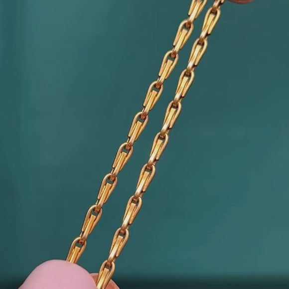We are in love with this deep yellow antique 9ct Gold Hayseed longuard chain! Crafted from 9ct Gold, her sleek honey-hued Hayseed links rest effortlessly across your décolletage, clasped with a highly coveted dog clip to give it that classic Victorian flare.