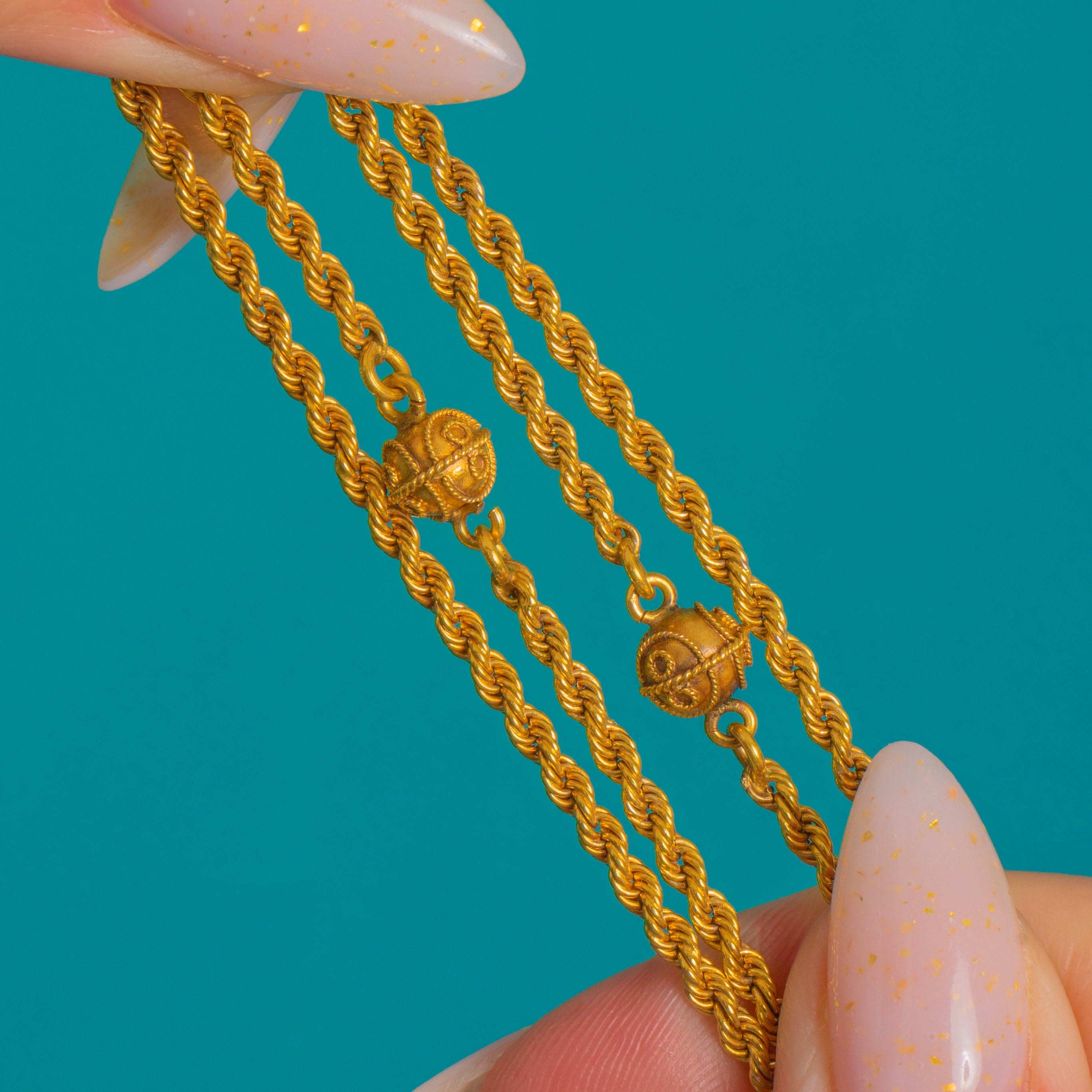 A sumptuous Victorian long guard chain crafted in bright 15ct Gold, its rope‑twist links punctuated by ornate cannetille orb detailing. The spherical stations are beautifully worked with applied cannetille and granulation, lending an elegant Etruscan Revival flair and a richly textured, luxurious look.