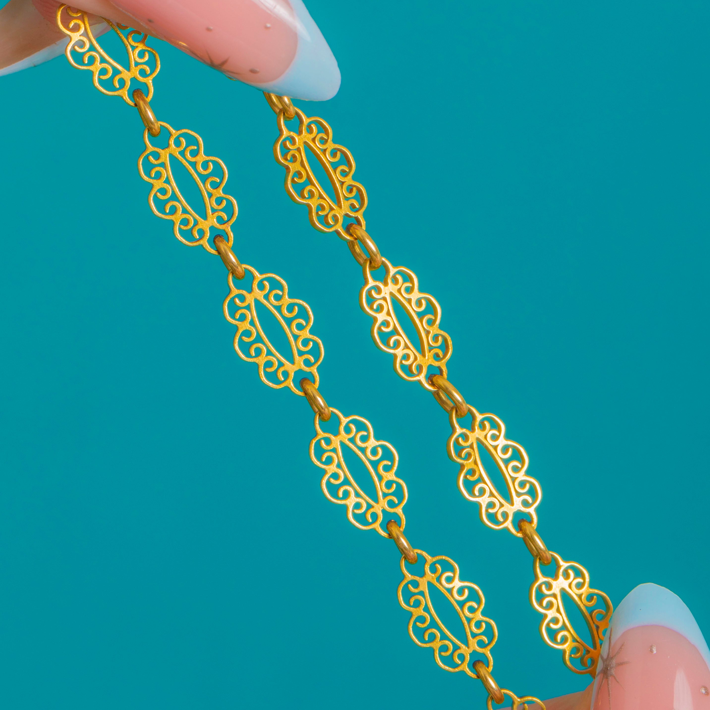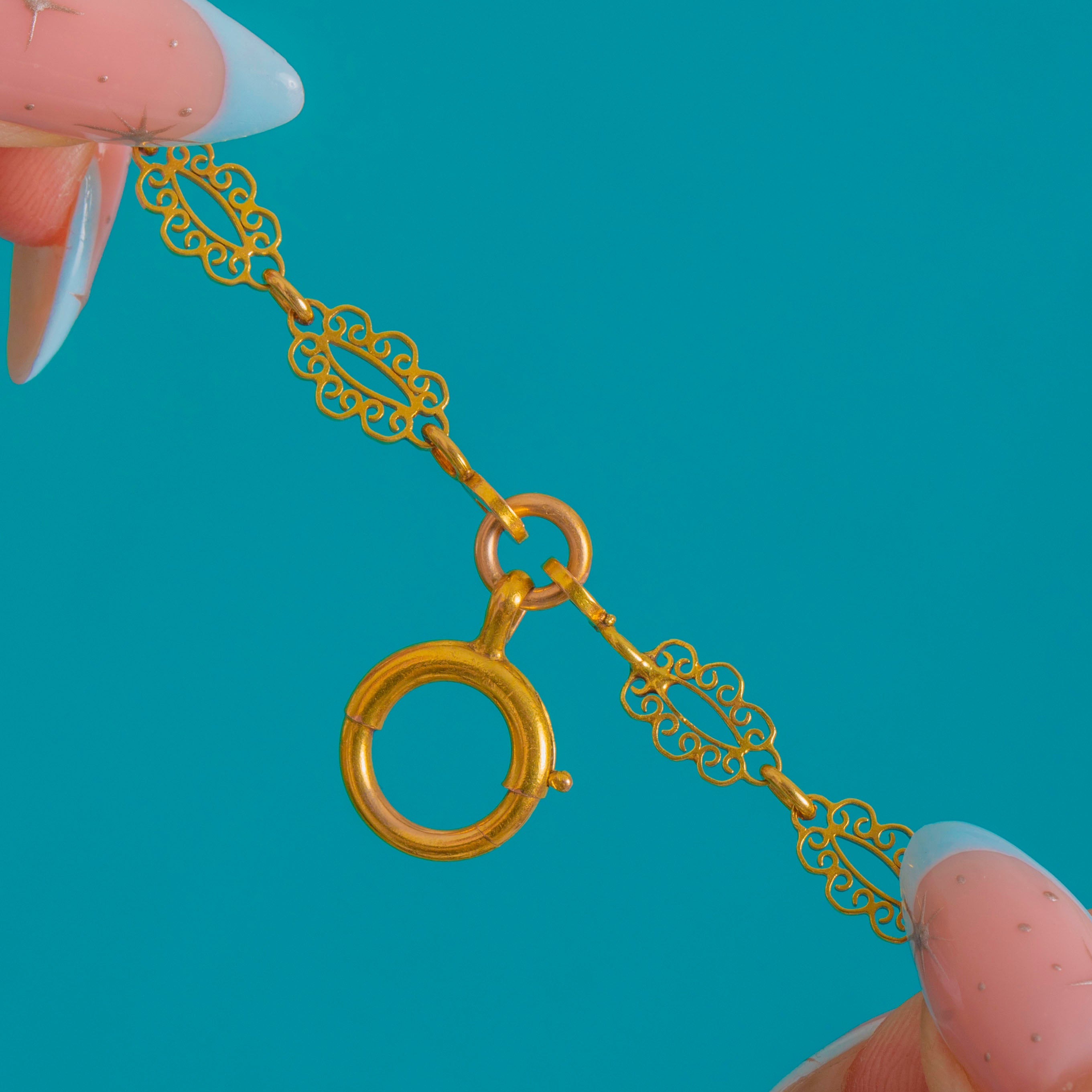 An exquisite Victorian French 18ct Gold filigree guard chain, composed of repeating openwork plaques with elegant scrolling arabesques. The lace-like links flow with beautiful articulation, creating a refined, airy silhouette that feels both delicate and luxurious.