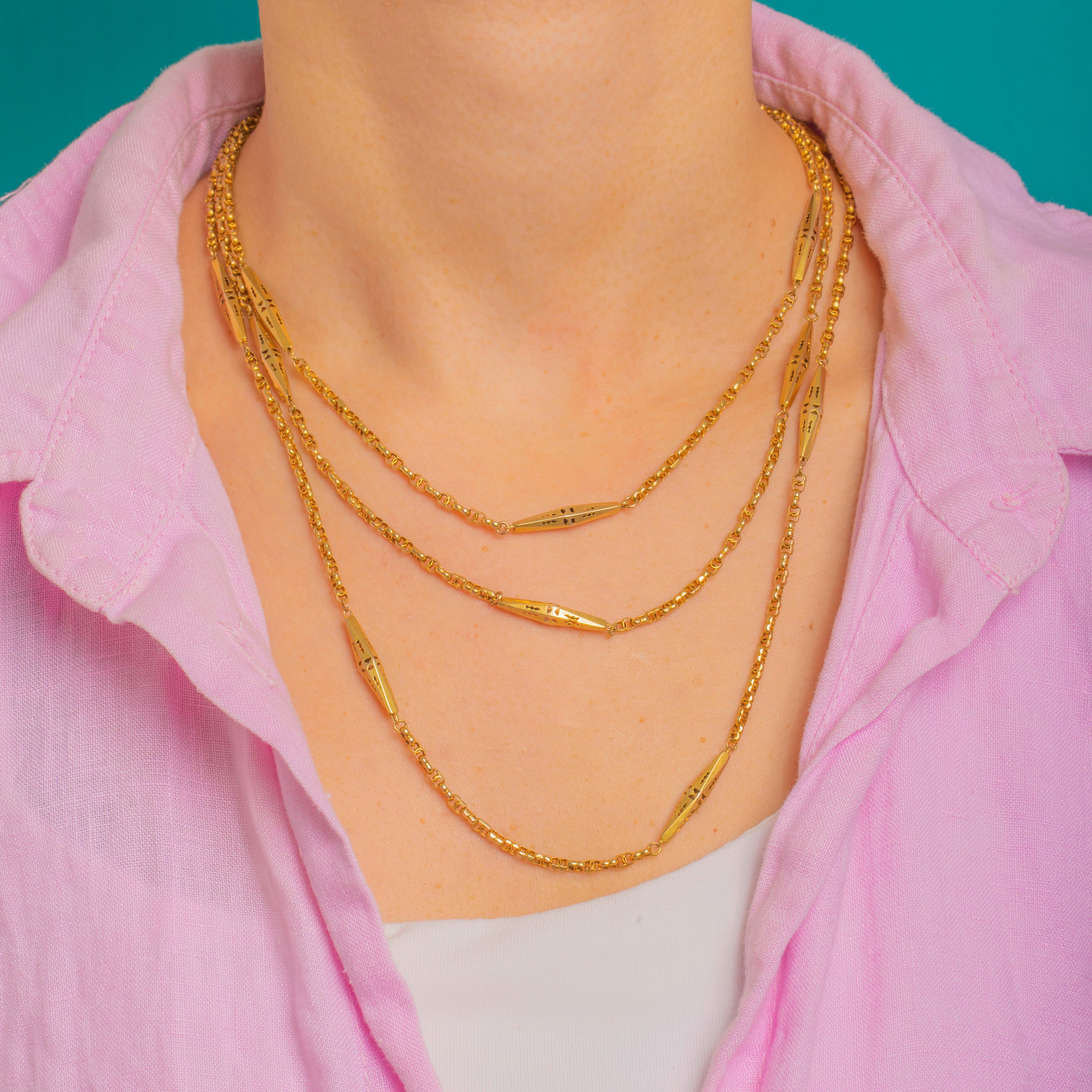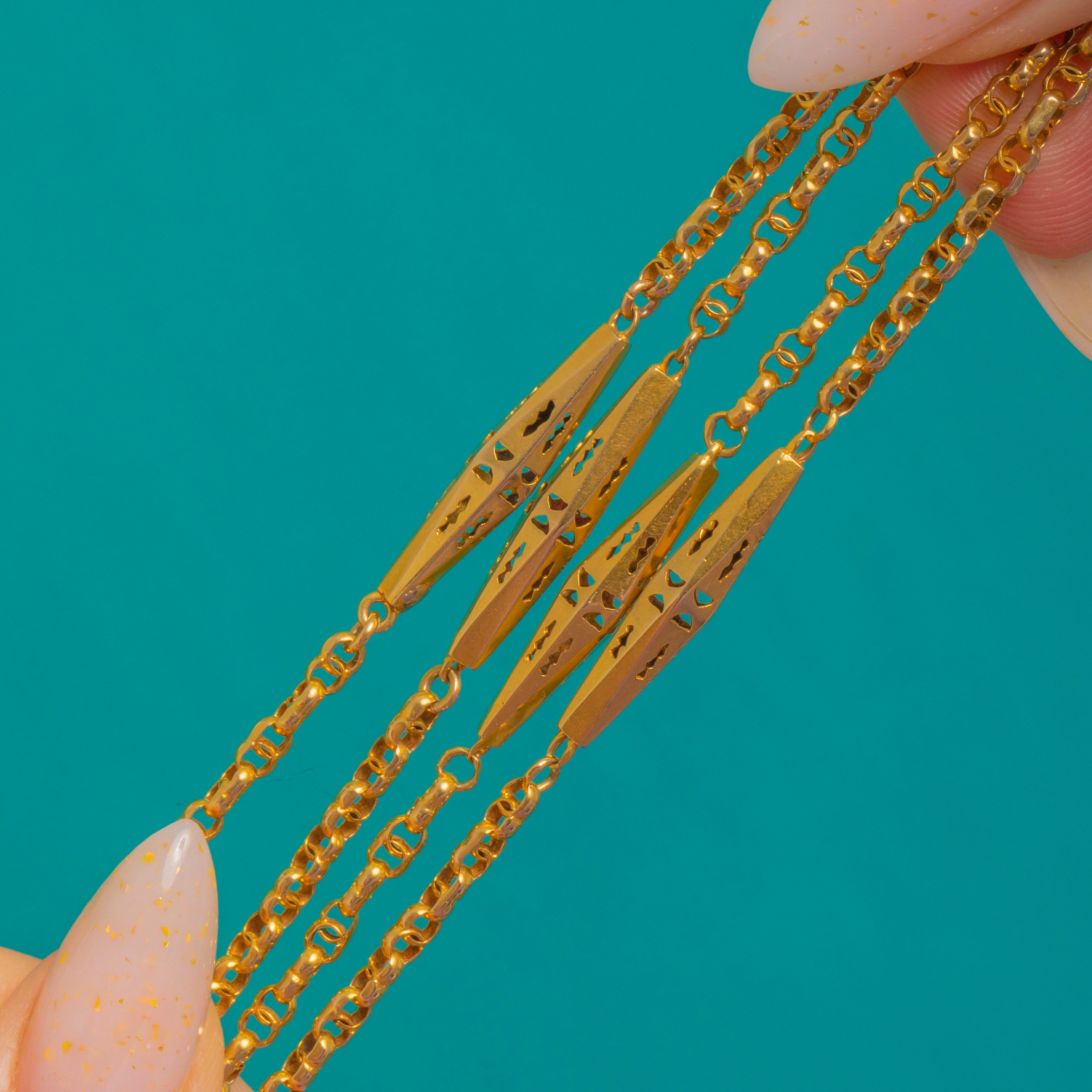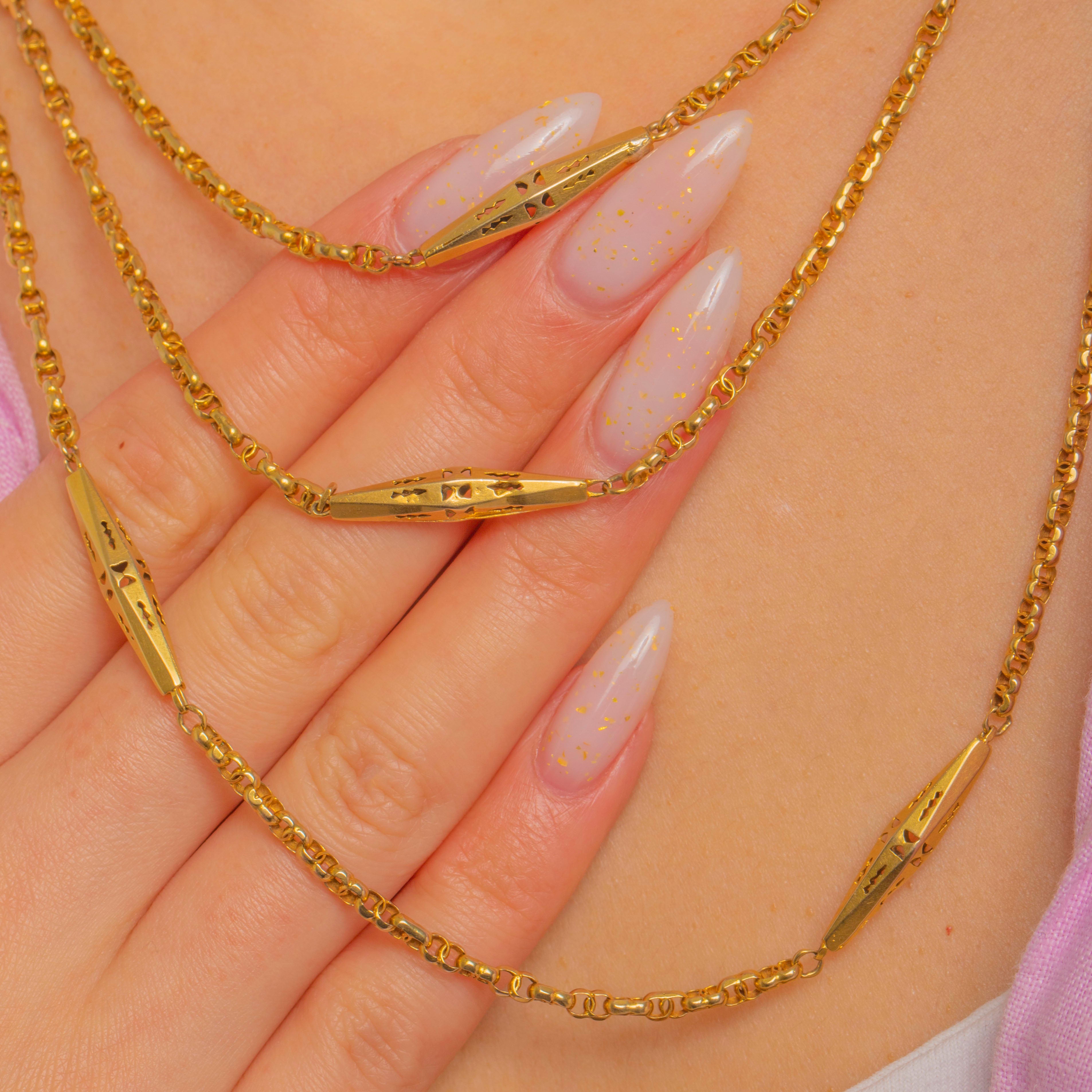 An exquisite Victorian longuard chain, this 63" sautoir is composed of elegant pierced lozenge stations in glowing 9ct Gold, linked by a fine, uniform fancy chain. Each elongated navette is light-catching and airy, with delicate geometric cut-outs and subtle engraved accents that lend beautiful texture and finesse.