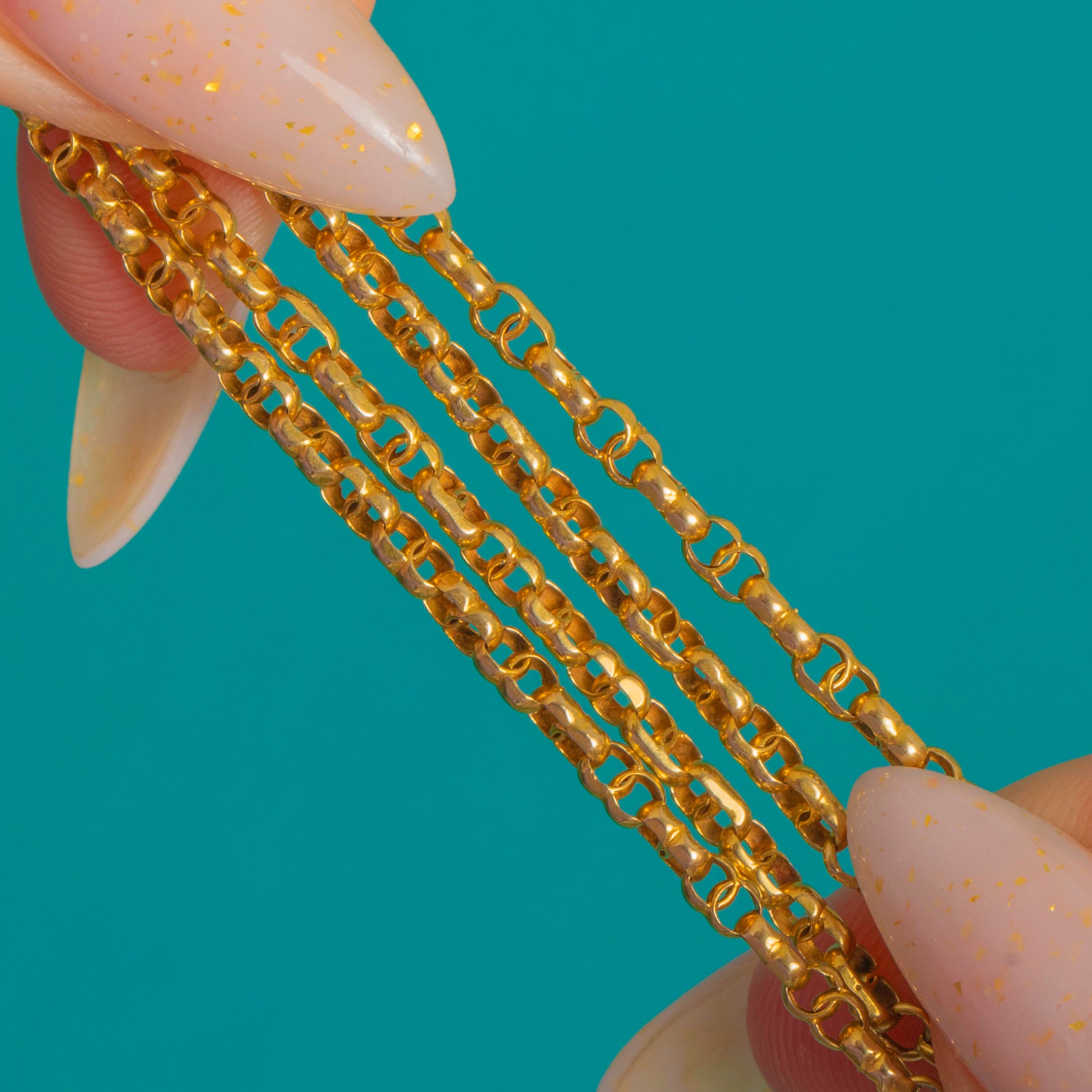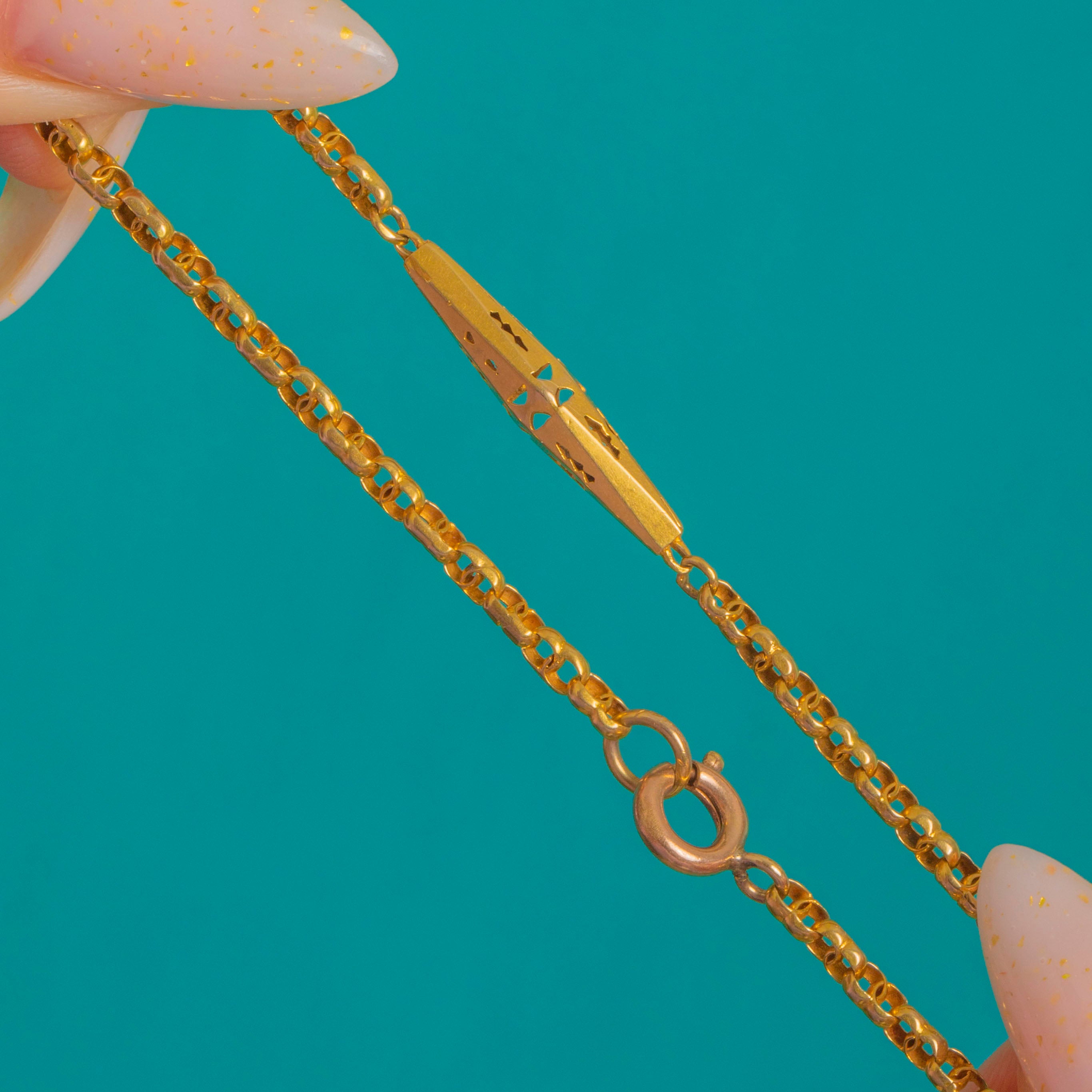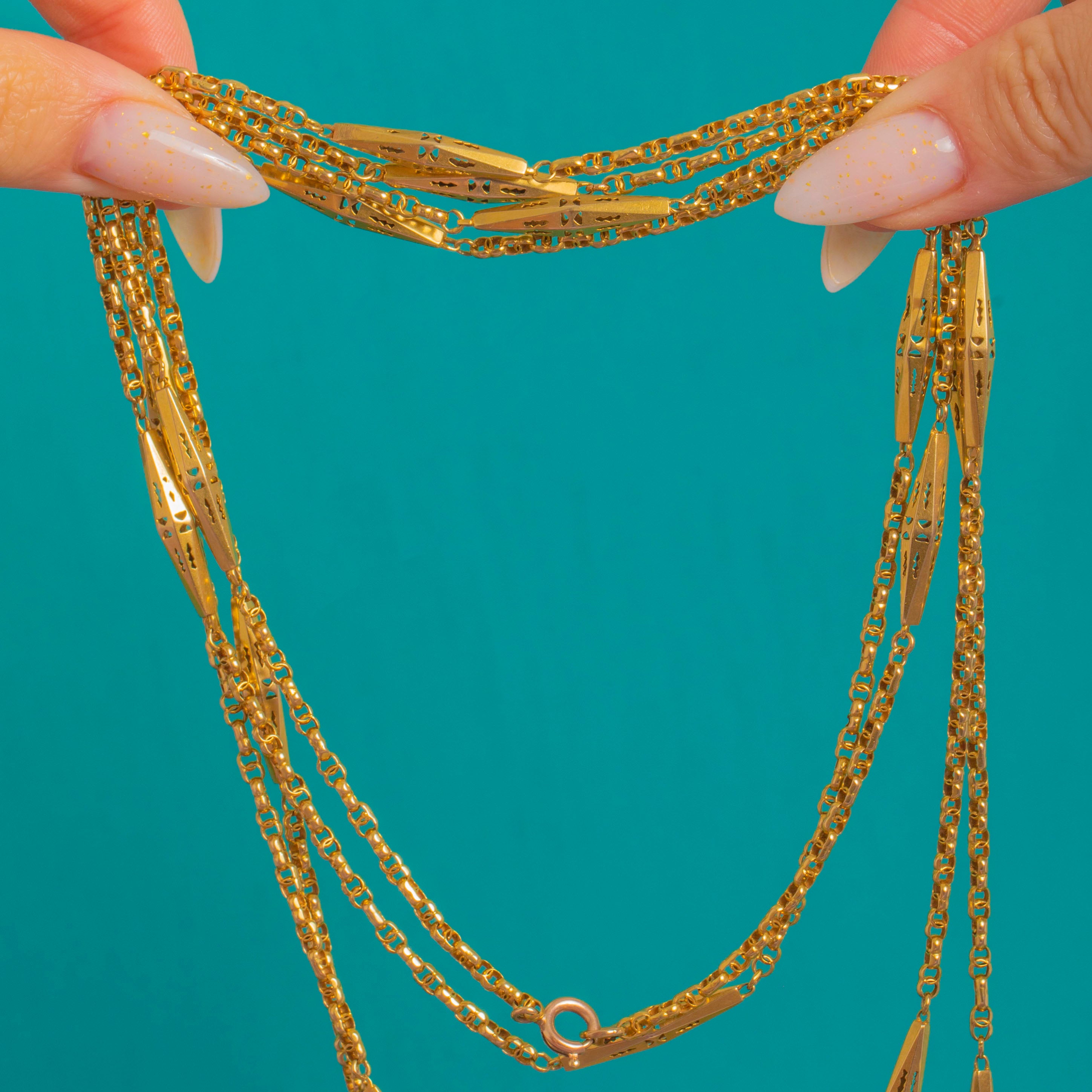An exquisite Victorian longuard chain, this 63" sautoir is composed of elegant pierced lozenge stations in glowing 9ct Gold, linked by a fine, uniform fancy chain. Each elongated navette is light-catching and airy, with delicate geometric cut-outs and subtle engraved accents that lend beautiful texture and finesse.