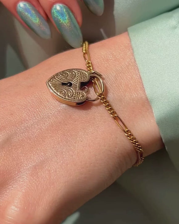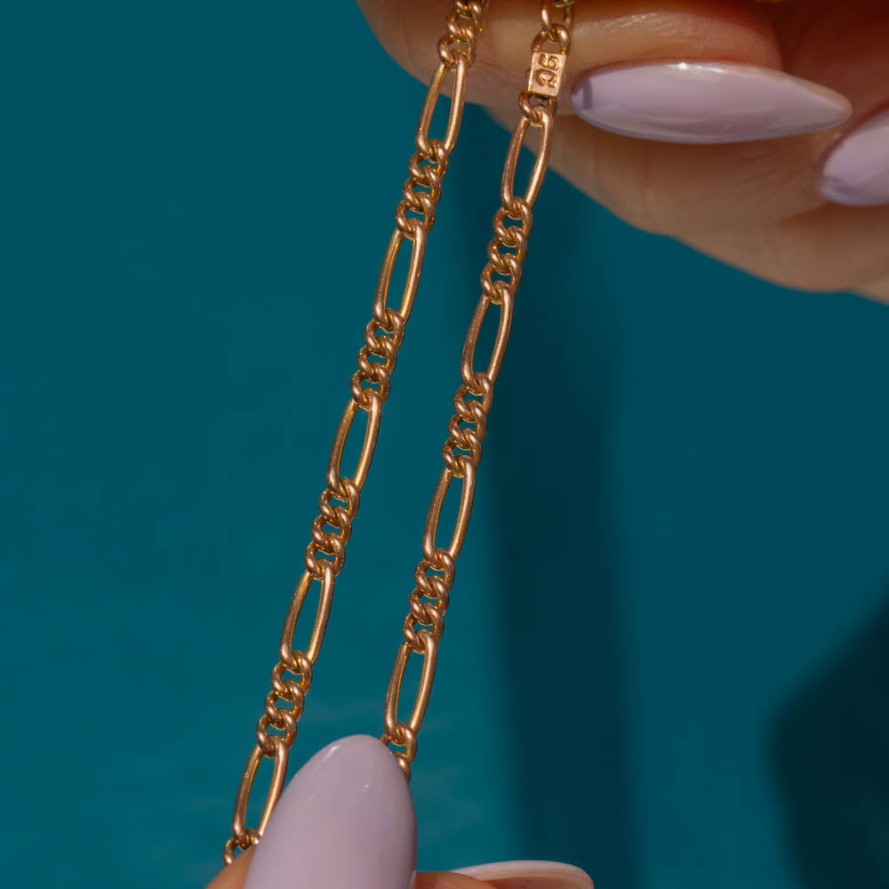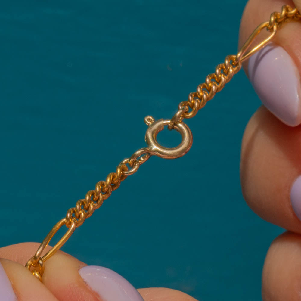 This antique 9ct Gold Figaro bracelet is sure to become a staple within your jewellery collection. Her Figaro links perfectly caress your wrist, crafted from sun-kissed 9ct Gold that radiates beneath the light.