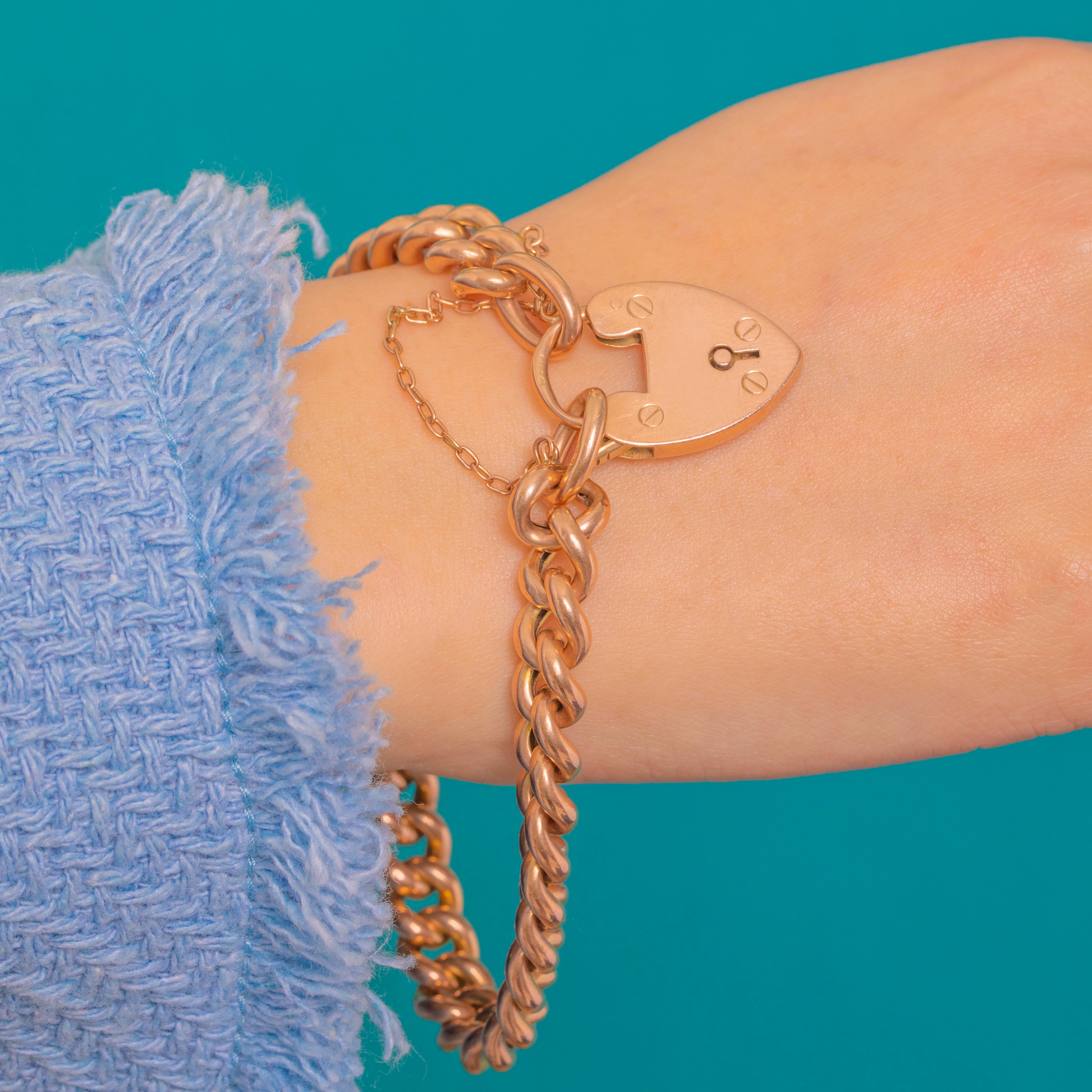 A timeless British classic, this 9ct Gold curb-link bracelet is finished with the most romantic of closures: a heart-shaped padlock clasp. The rounded, polished curb links flow smoothly around the wrist, while the integrated safety chain adds both elegance and reassurance. Clean, bright and beautifully wearable, it’s the perfect balance of minimalist design and sentimental charm.