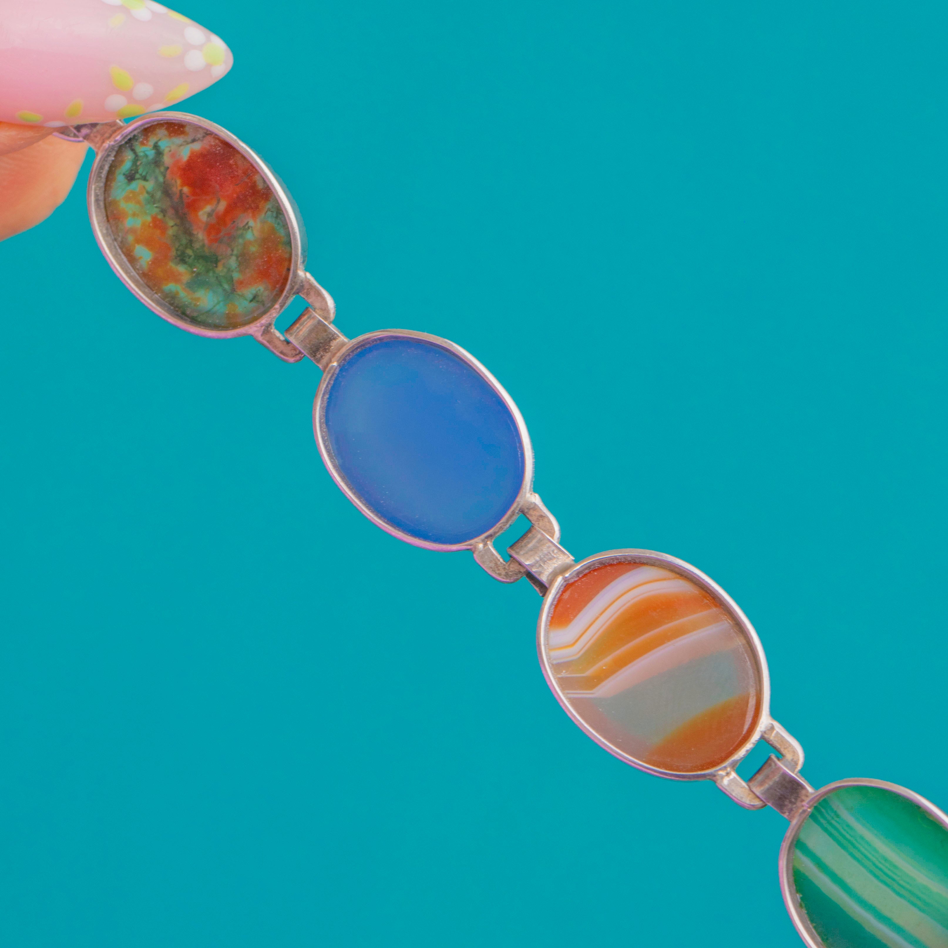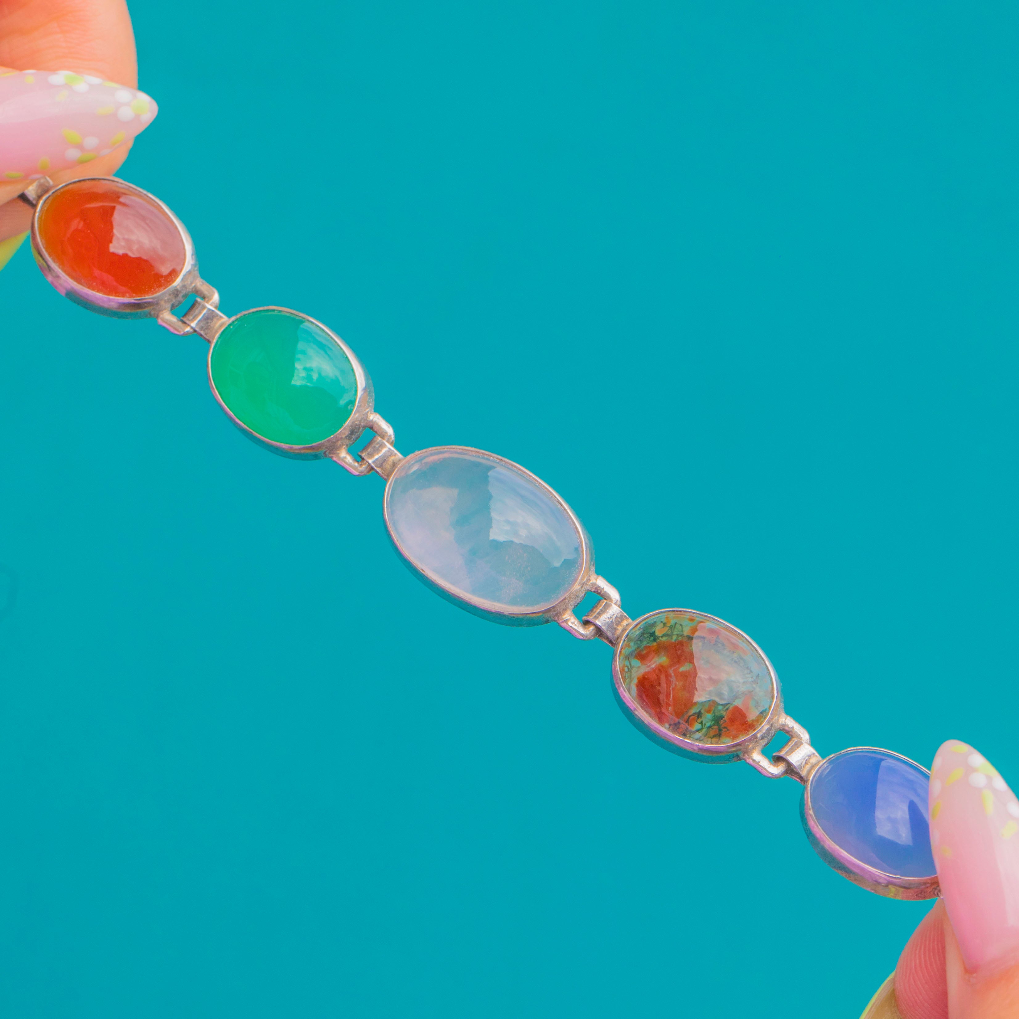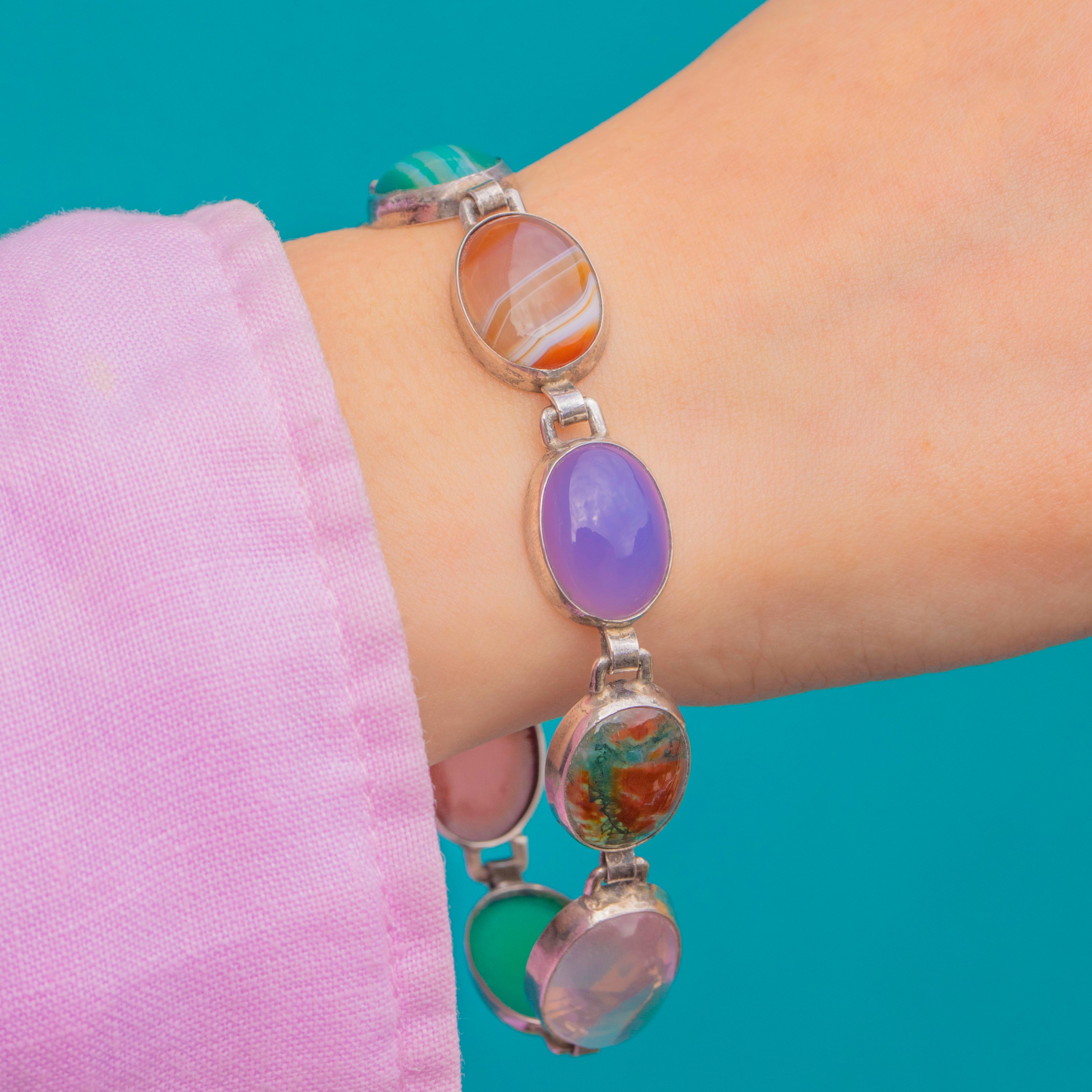 Alive with colour and character, this Art Deco Sterling Silver bracelet parades a joyful spectrum of domed cabochons in sleek bezels, articulated for beautiful movement on the wrist. The smooth ovals showcase natural banding, mottling and translucency, creating a richly varied palette that feels both refined and effortlessly vibrant.