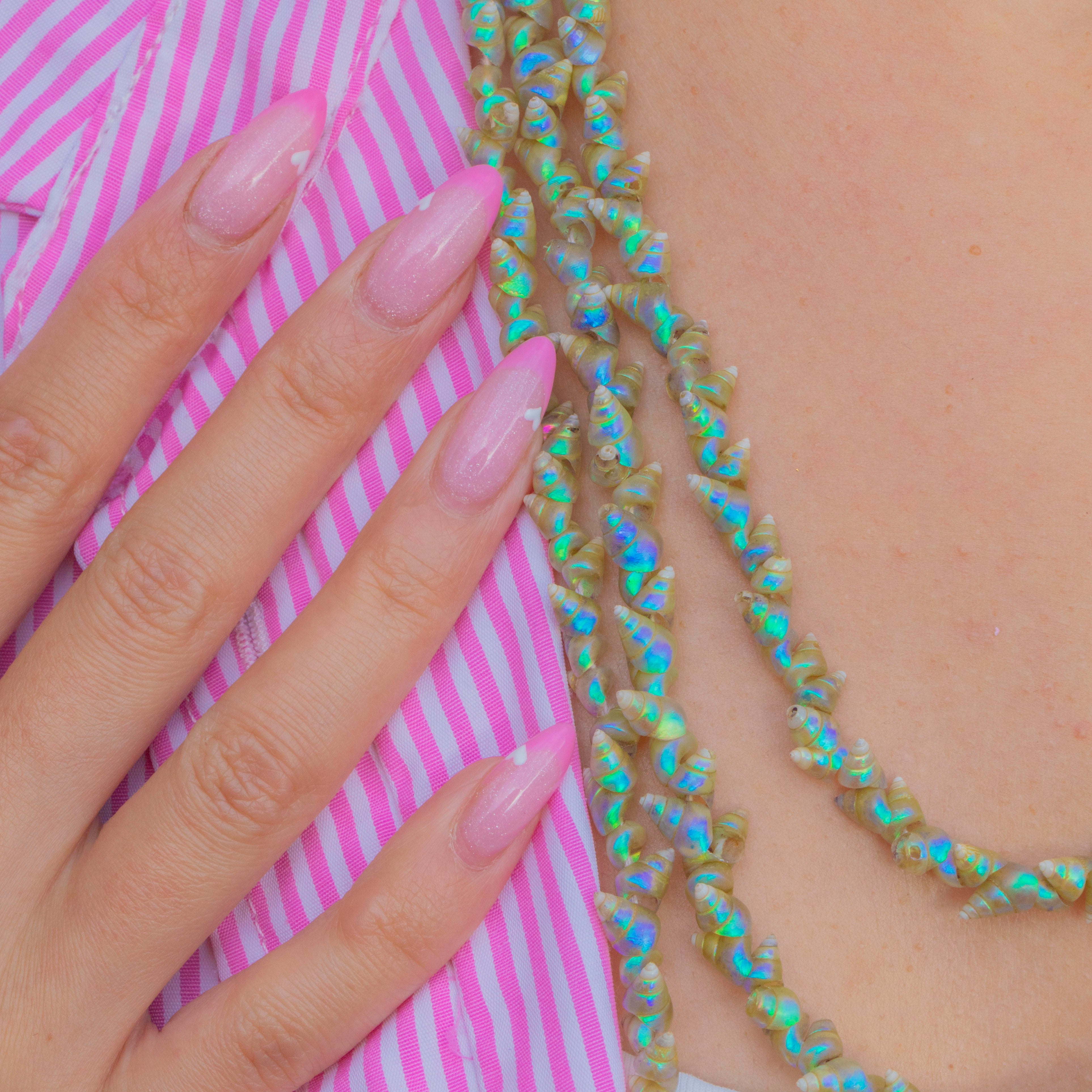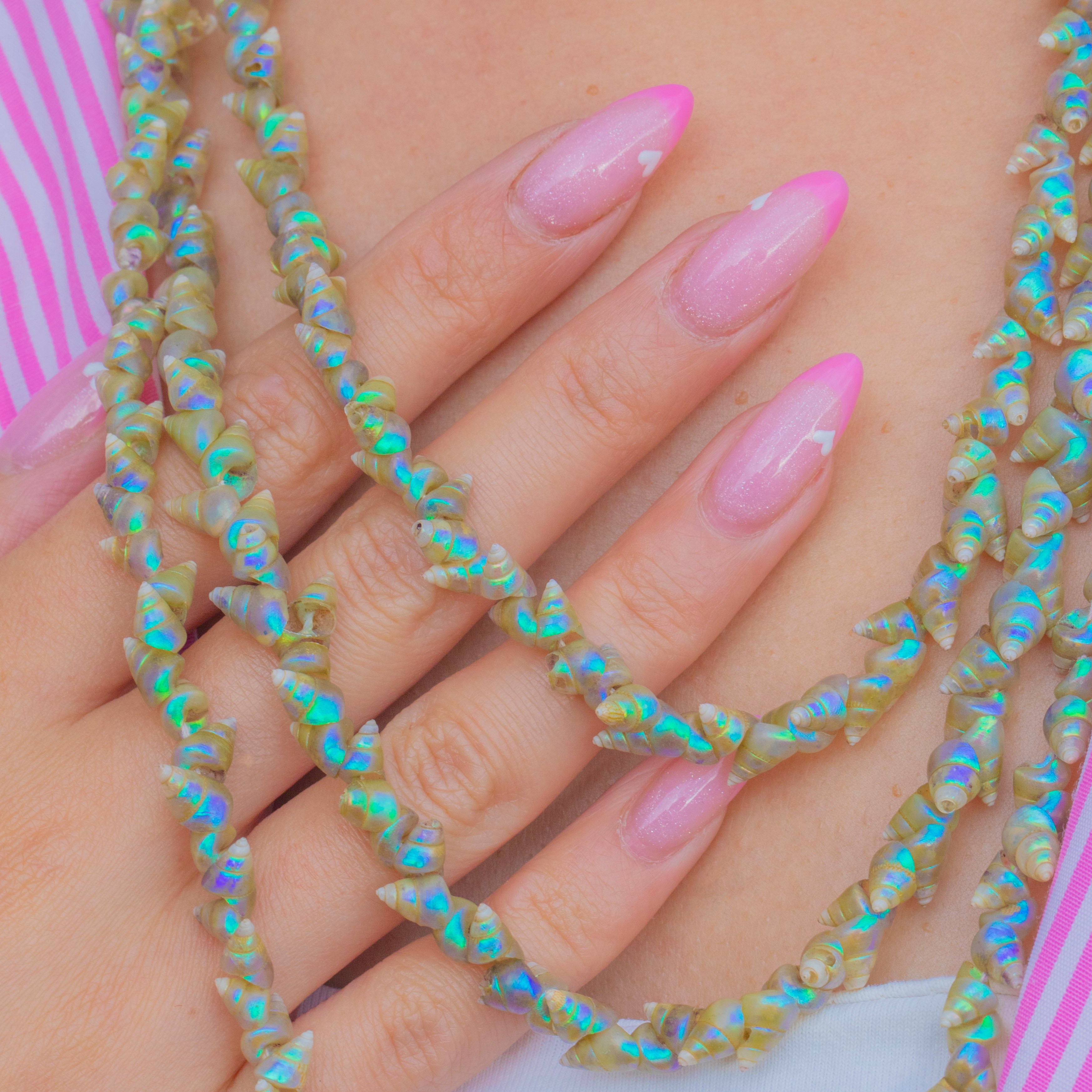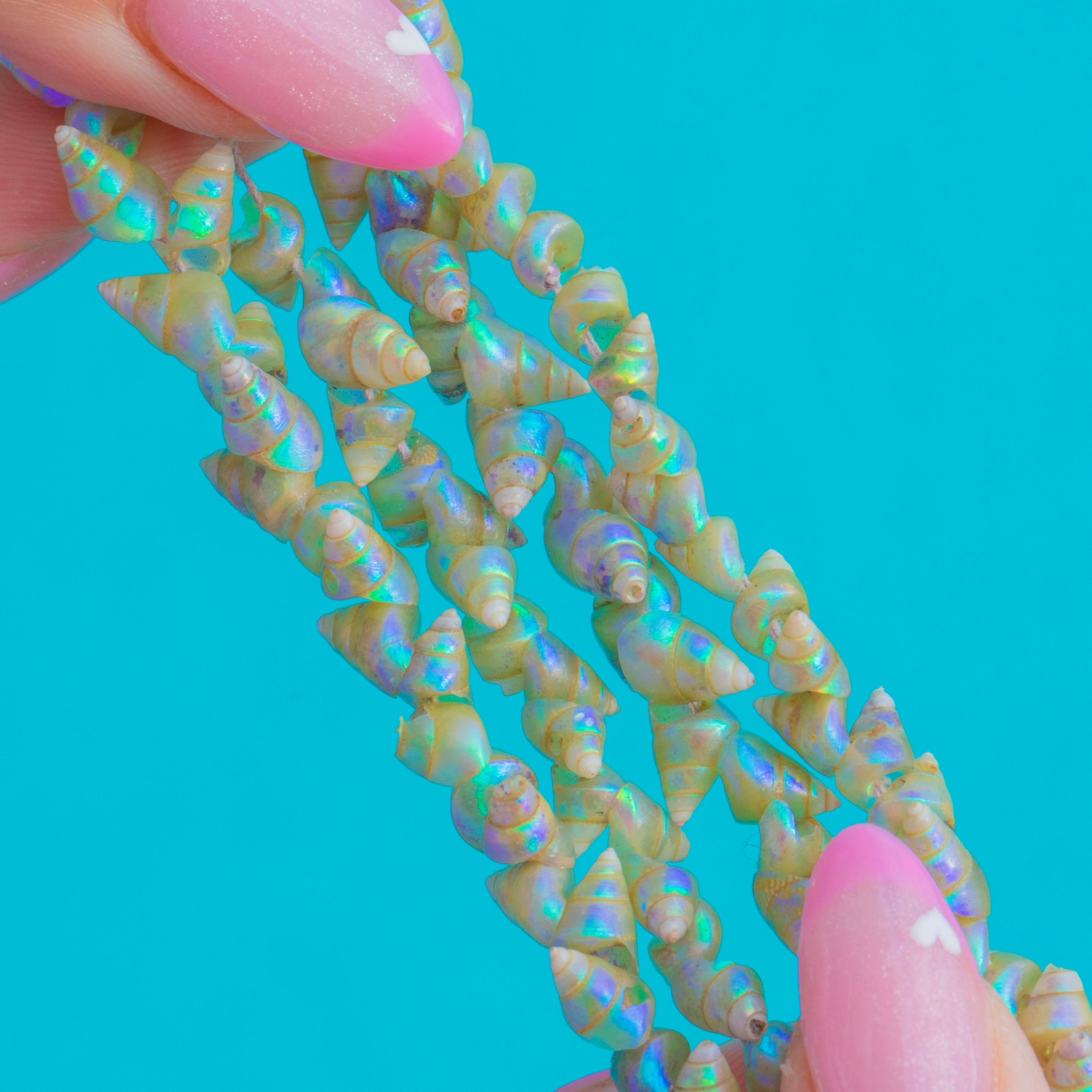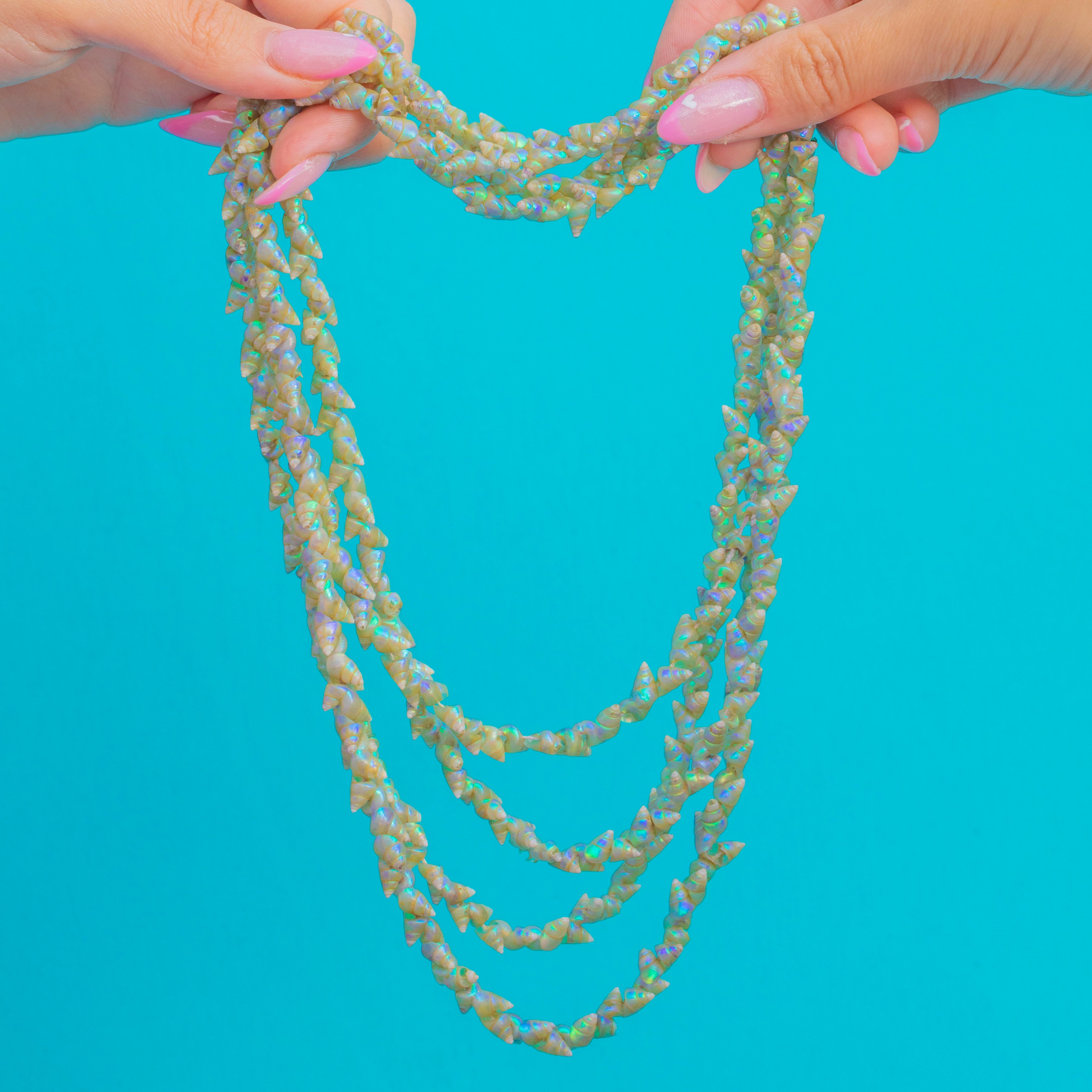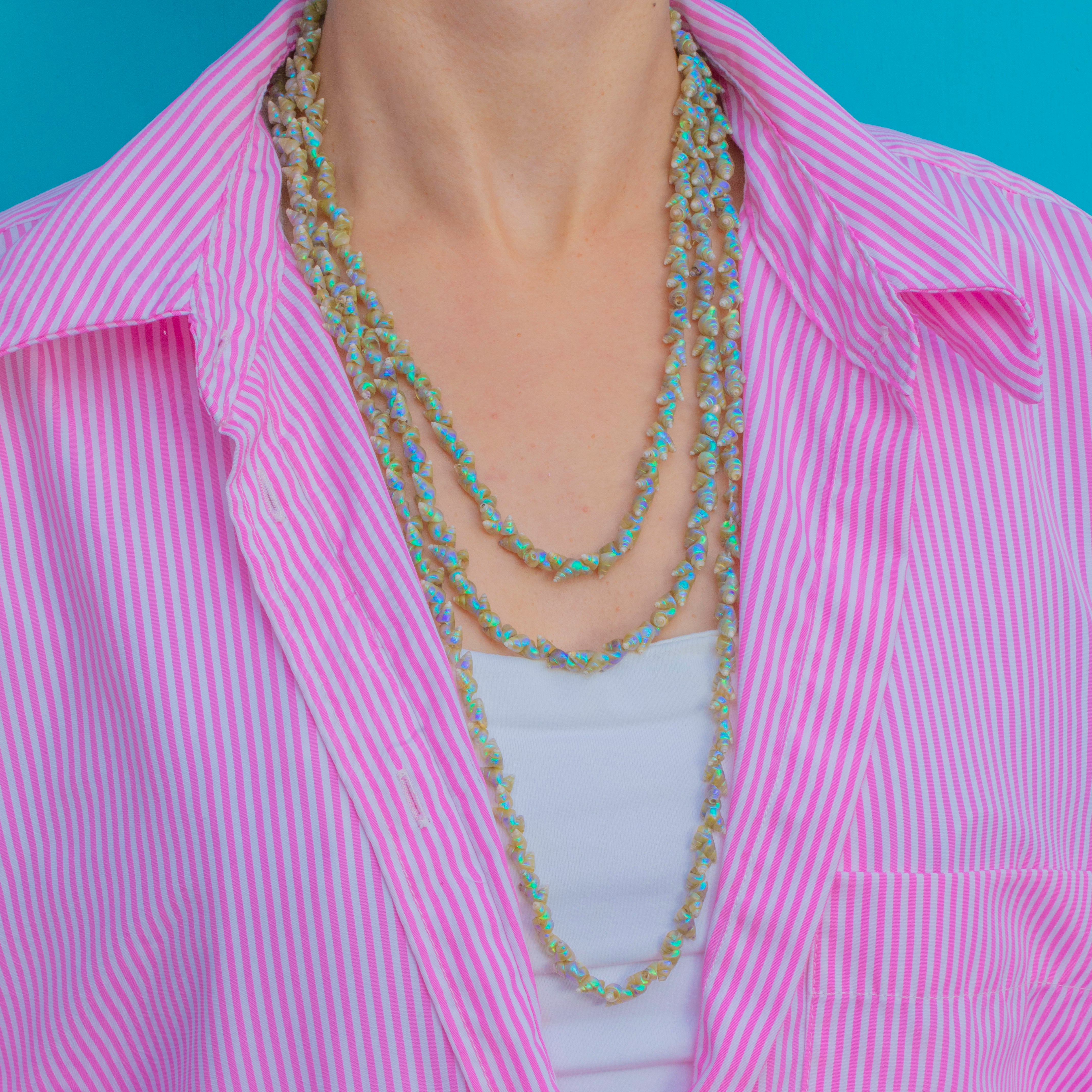 A beautiful example of Victorian natural history jewellery, this exceptionally long 72" Tasmanian Mariner shell necklace is both delicate and captivating. Each iridescent shell glows with soft natural lustre, carefully hand-strung in a continuous rope that can be layered for versatile styling.