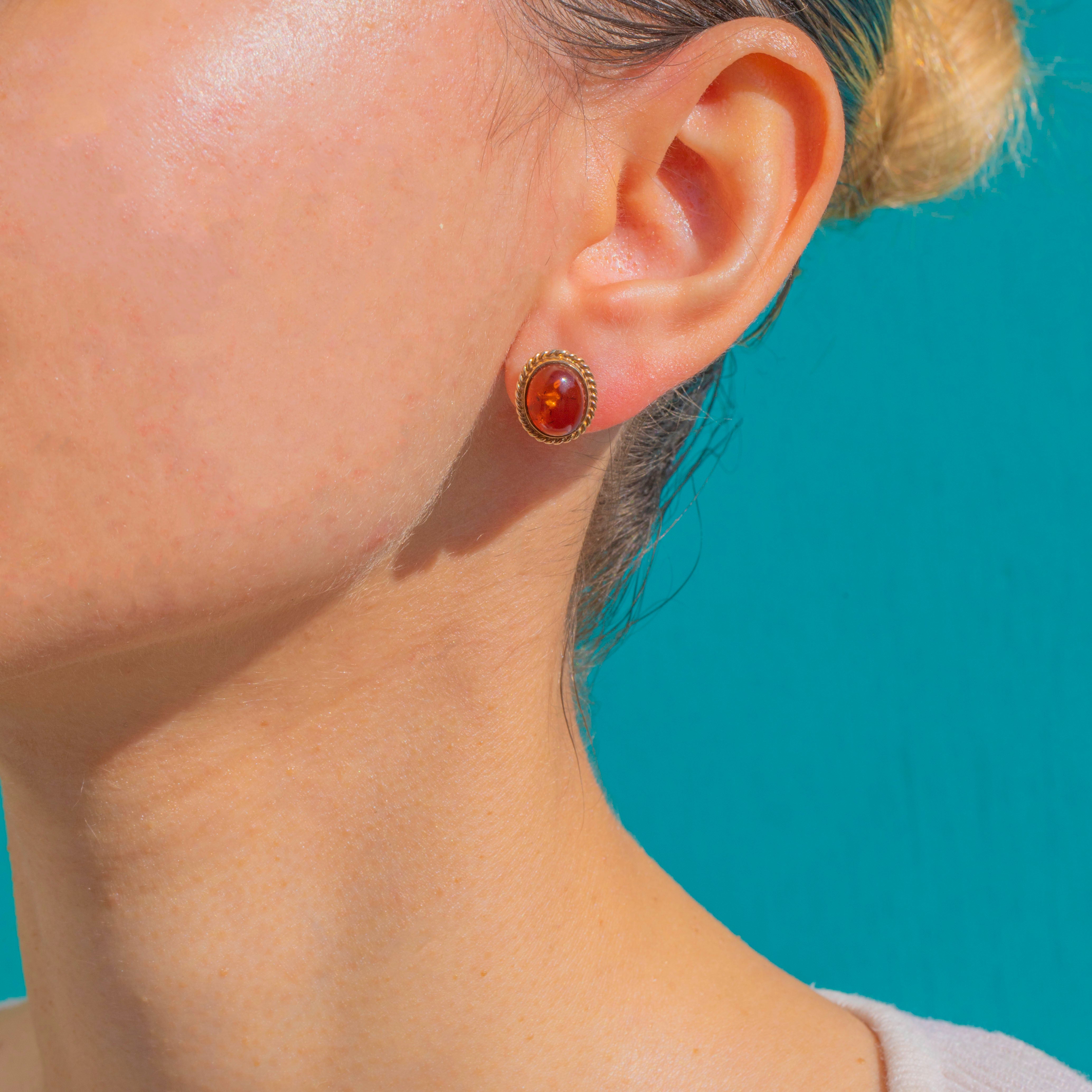 EXCELLENT: The Amber cabochons are glossy with natural internal inclusions and no chips or cracks visible. The 9ct Gold rope borders and bezels are crisp and secure with only light surface wear and a gentle patina. Posts and fittings present beautifully with no visible repairs.
