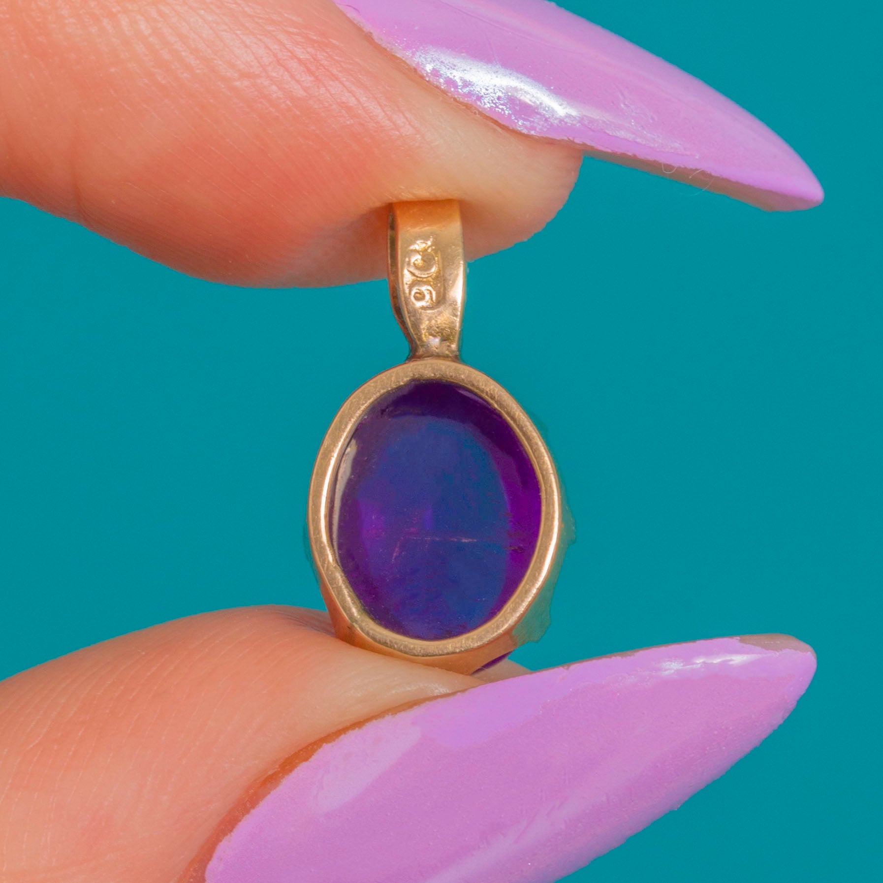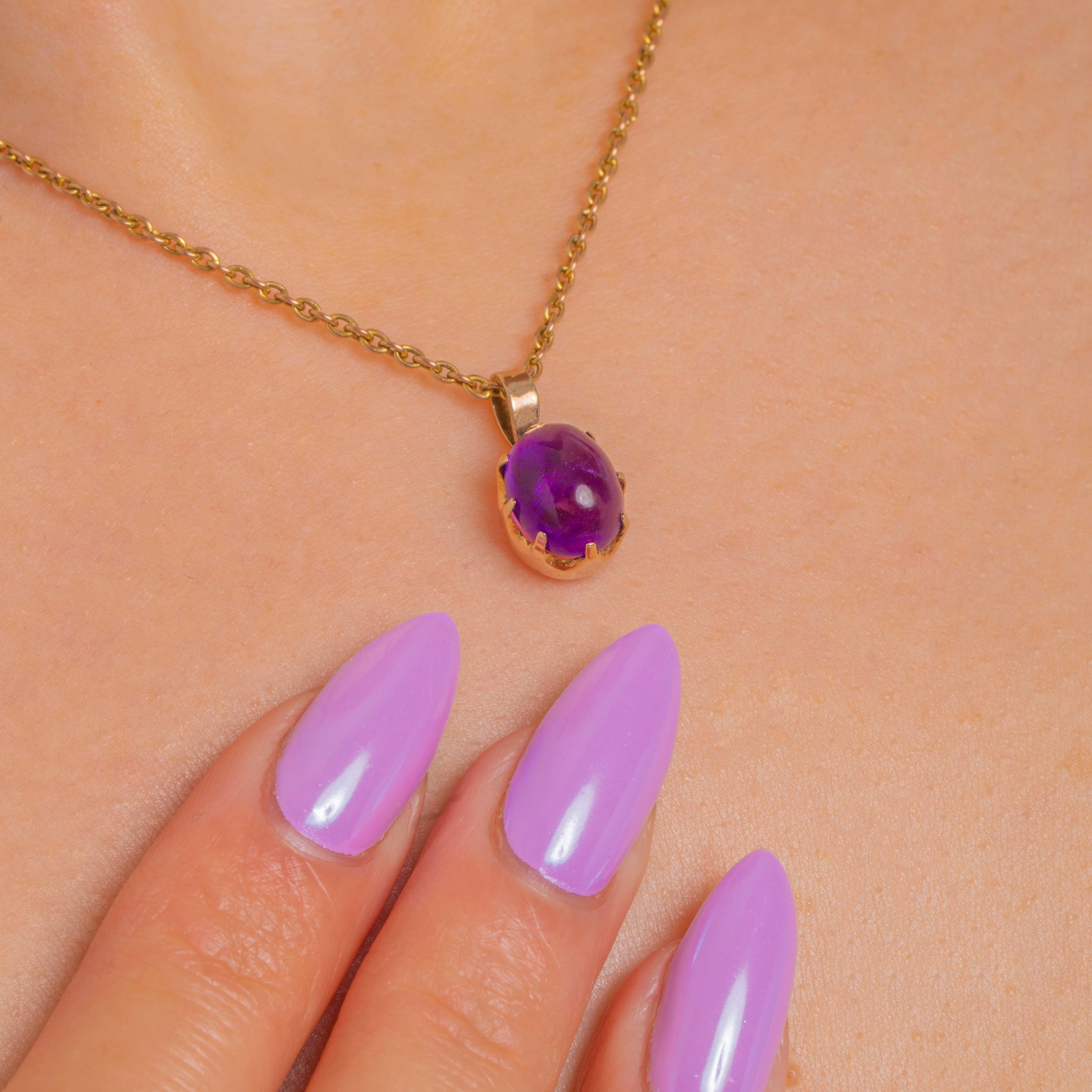 EXCELLENT: The Amethyst cabochon is smooth and lustrous with only the lightest surface wear visible under close inspection. The 9ct Gold setting and scalloped bezel are secure and well-preserved with a clean bail and no visible repairs. Overall, this piece has been well cared for.