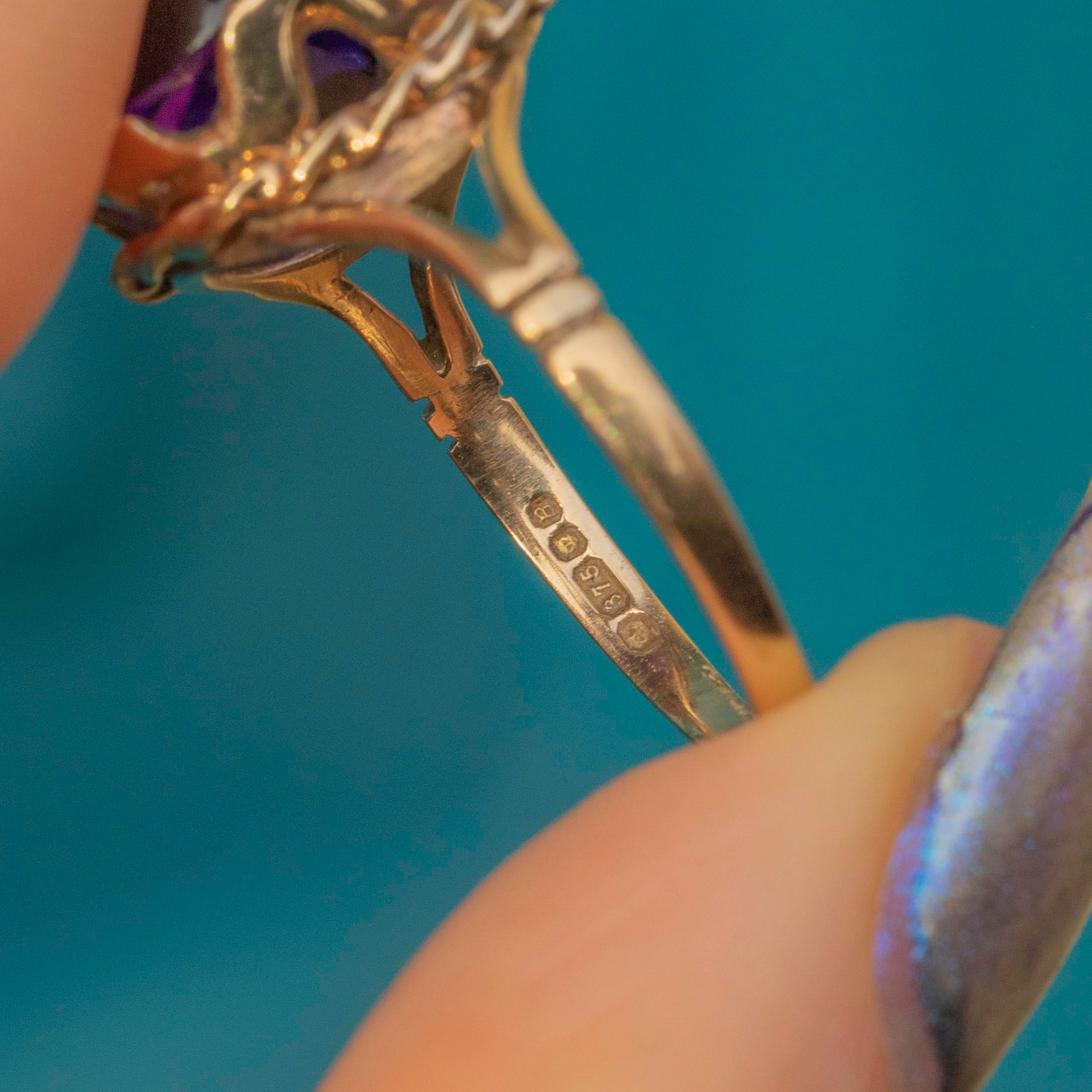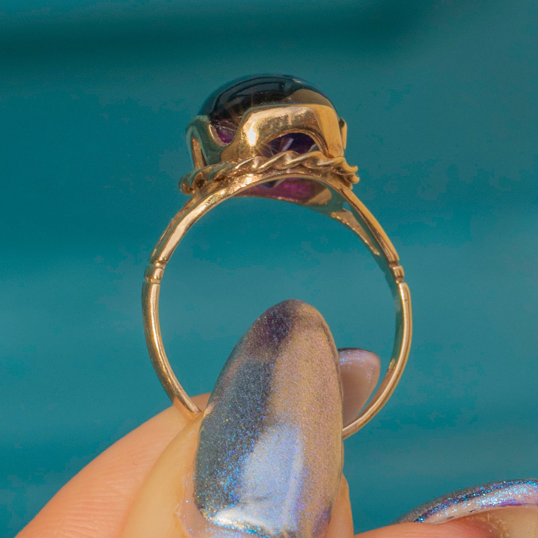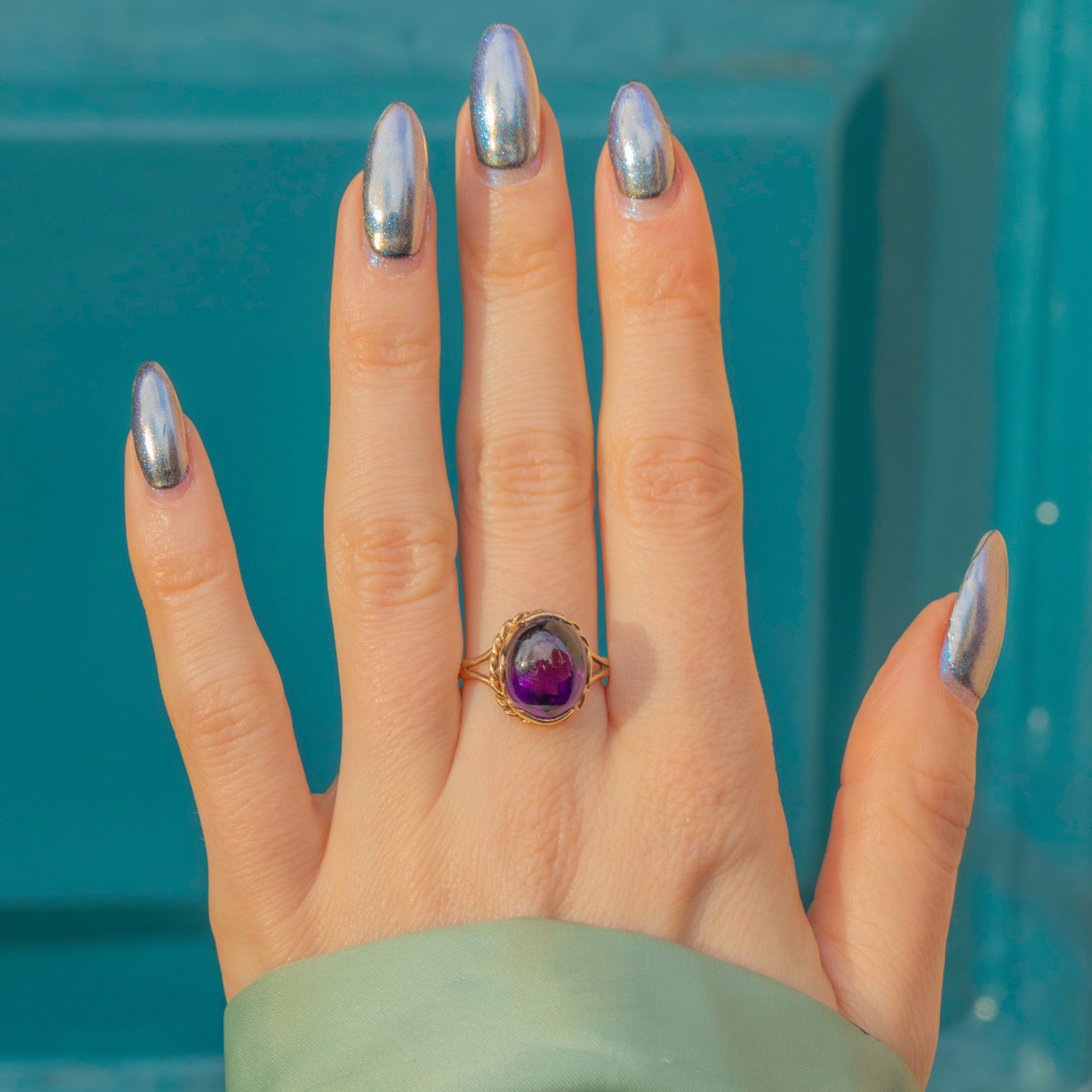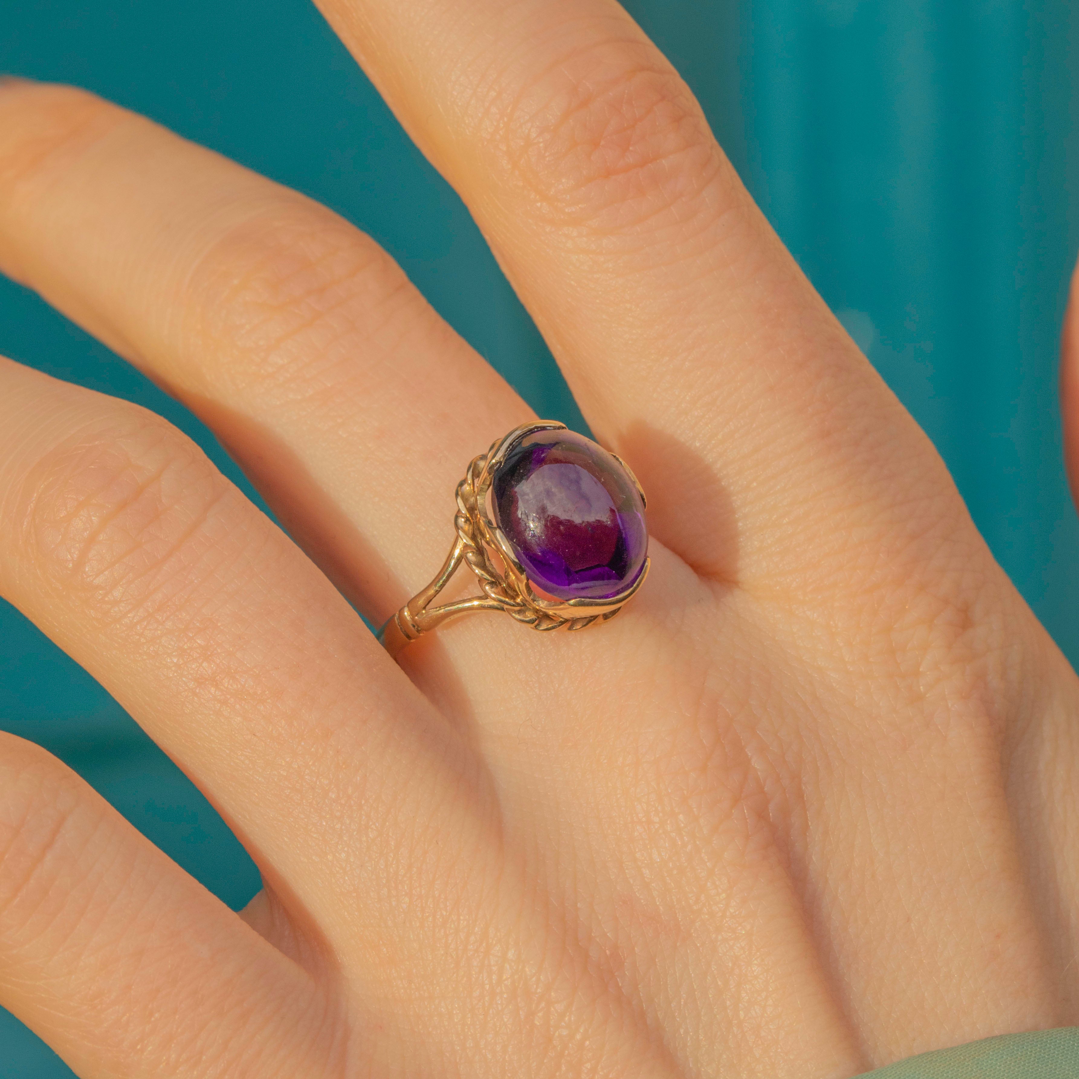 EXCELLENT This 9ct Gold Amethyst Cabochon Ring is in very good condition. The Amethyst is richly hued and well set into her 9ct Gold. There is a very slight scuff to the Amethyst, however, this is only truly visible under close inspection. The ring band has got a well-rounded shape, making her uber comfortable to wear.