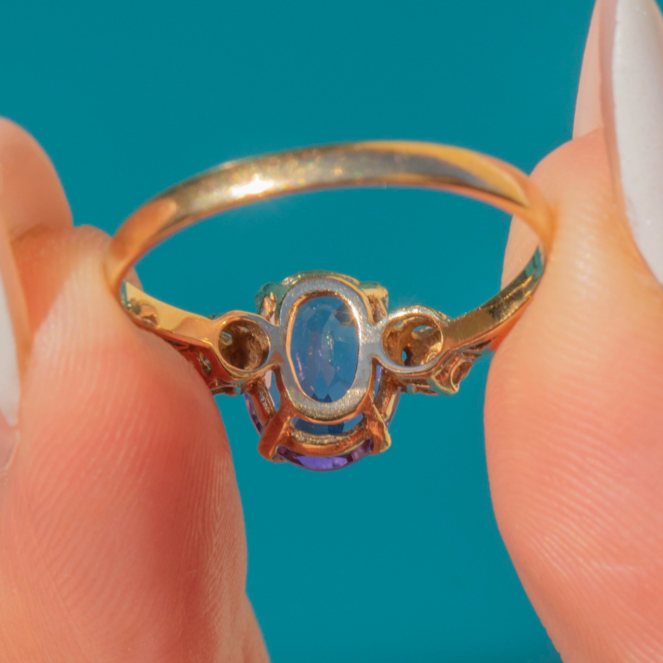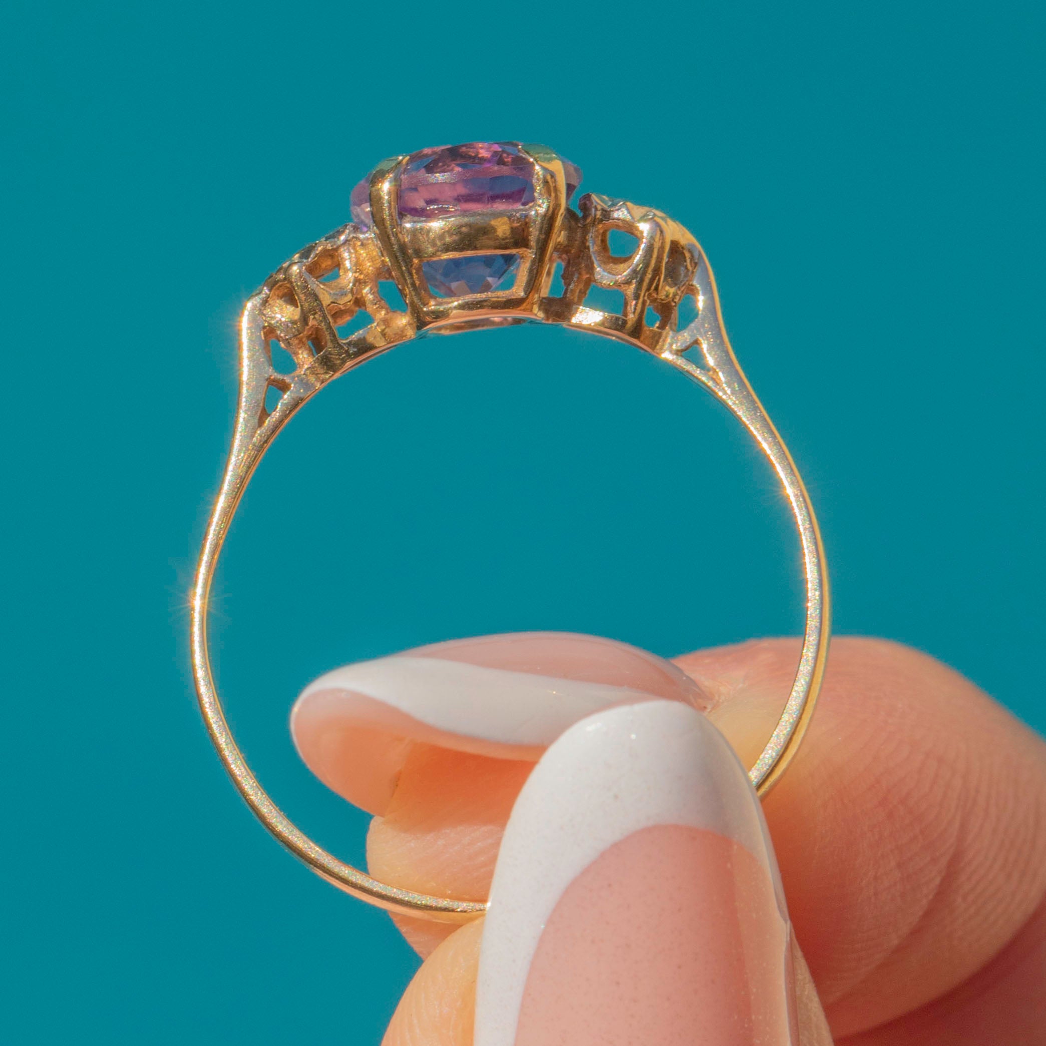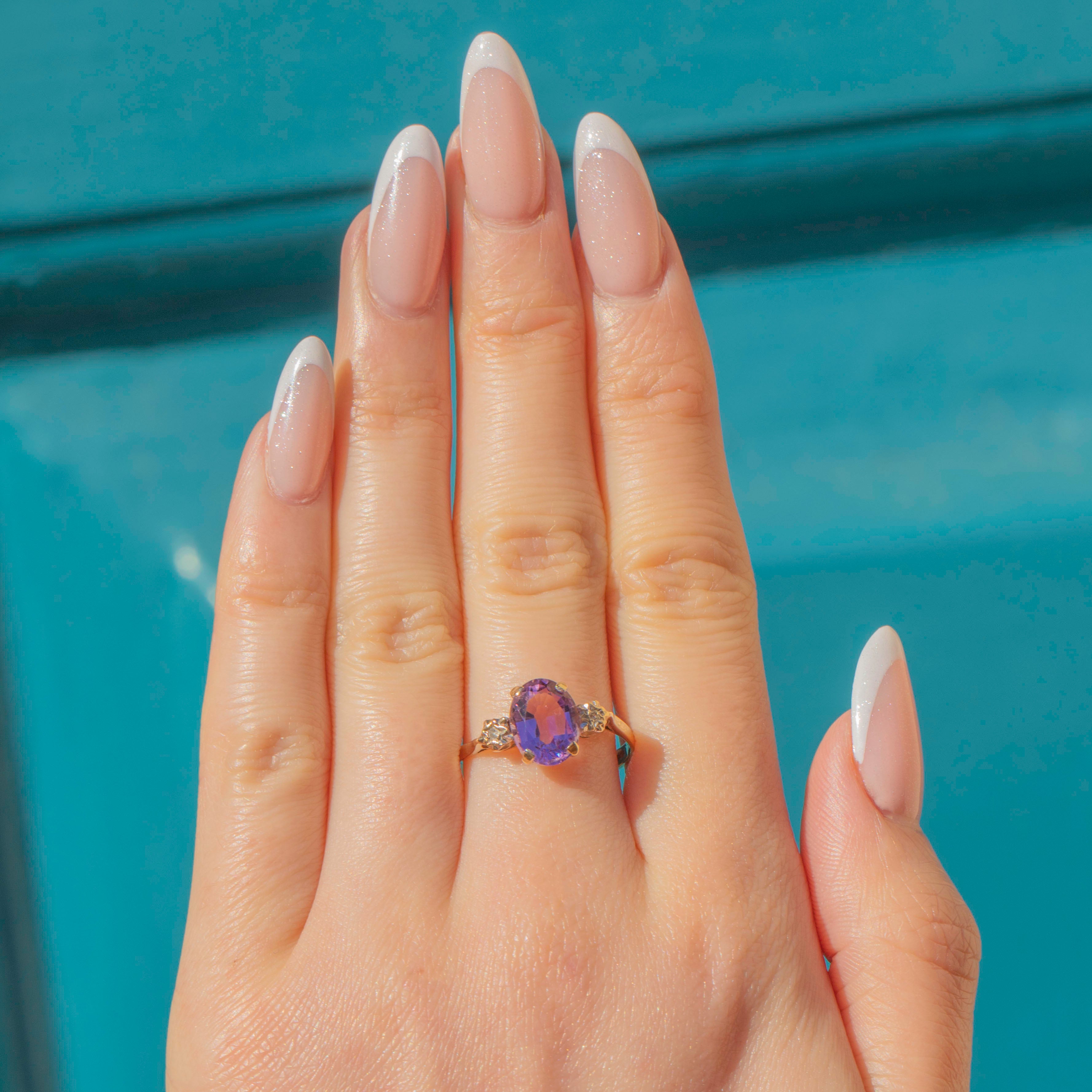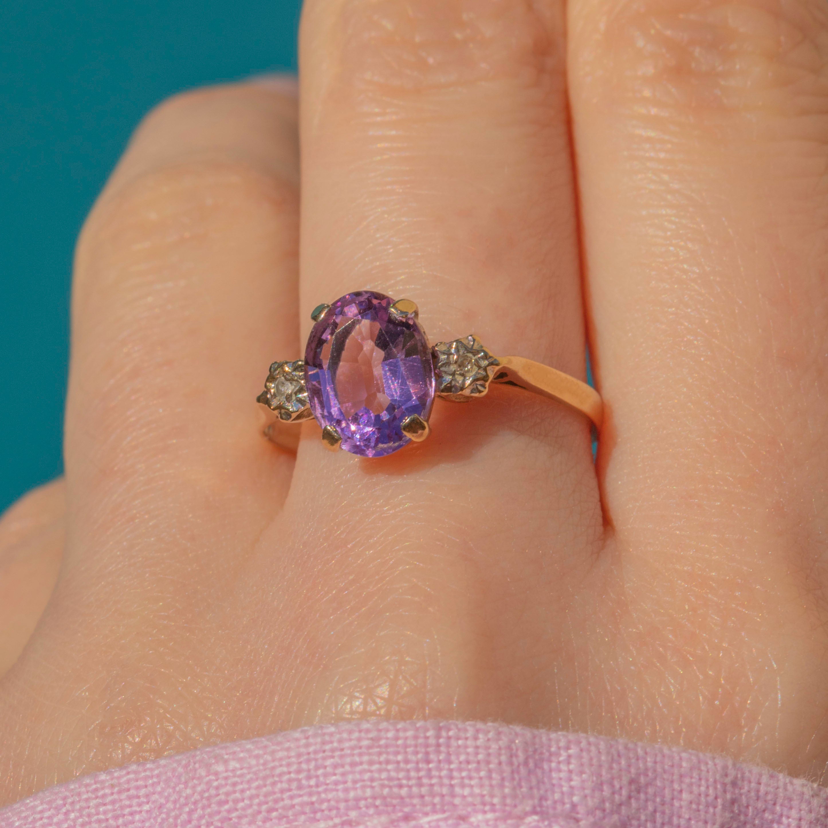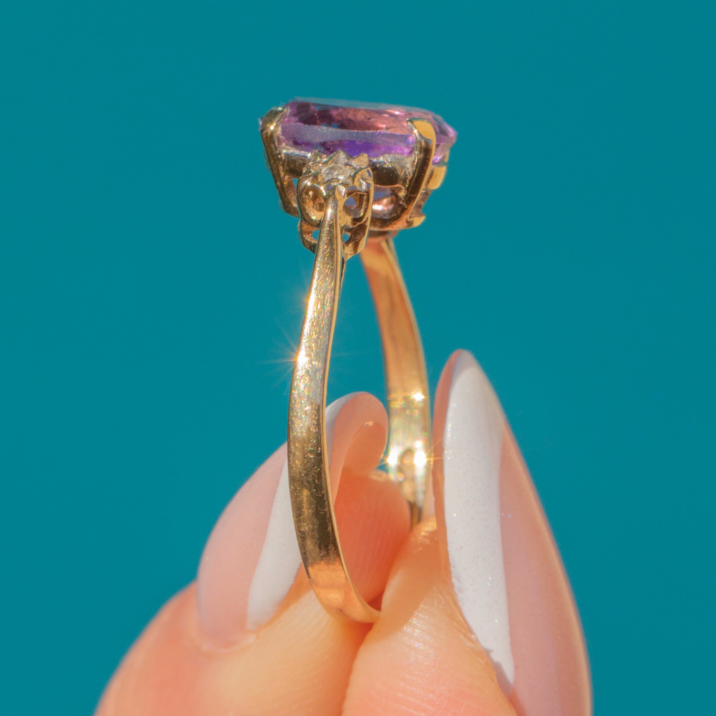 In her centre sits a crisply faceted 1.25ct Amethyst, radiating gorgeous lavender hues as she catches the light. It is flanked by two scintillating Diamonds, with each gemstone married by the warmth of their buttery 9ct Gold settings and band.
