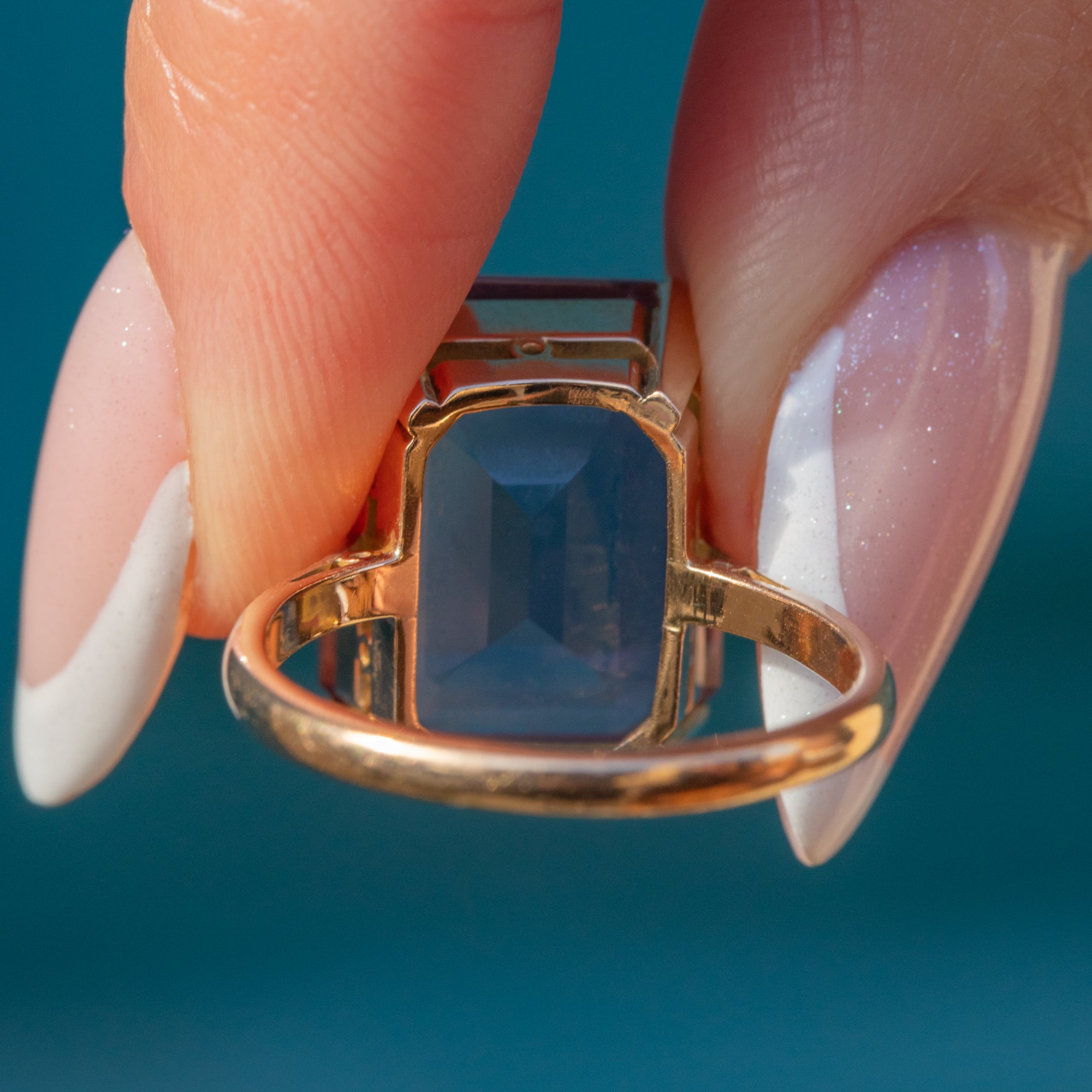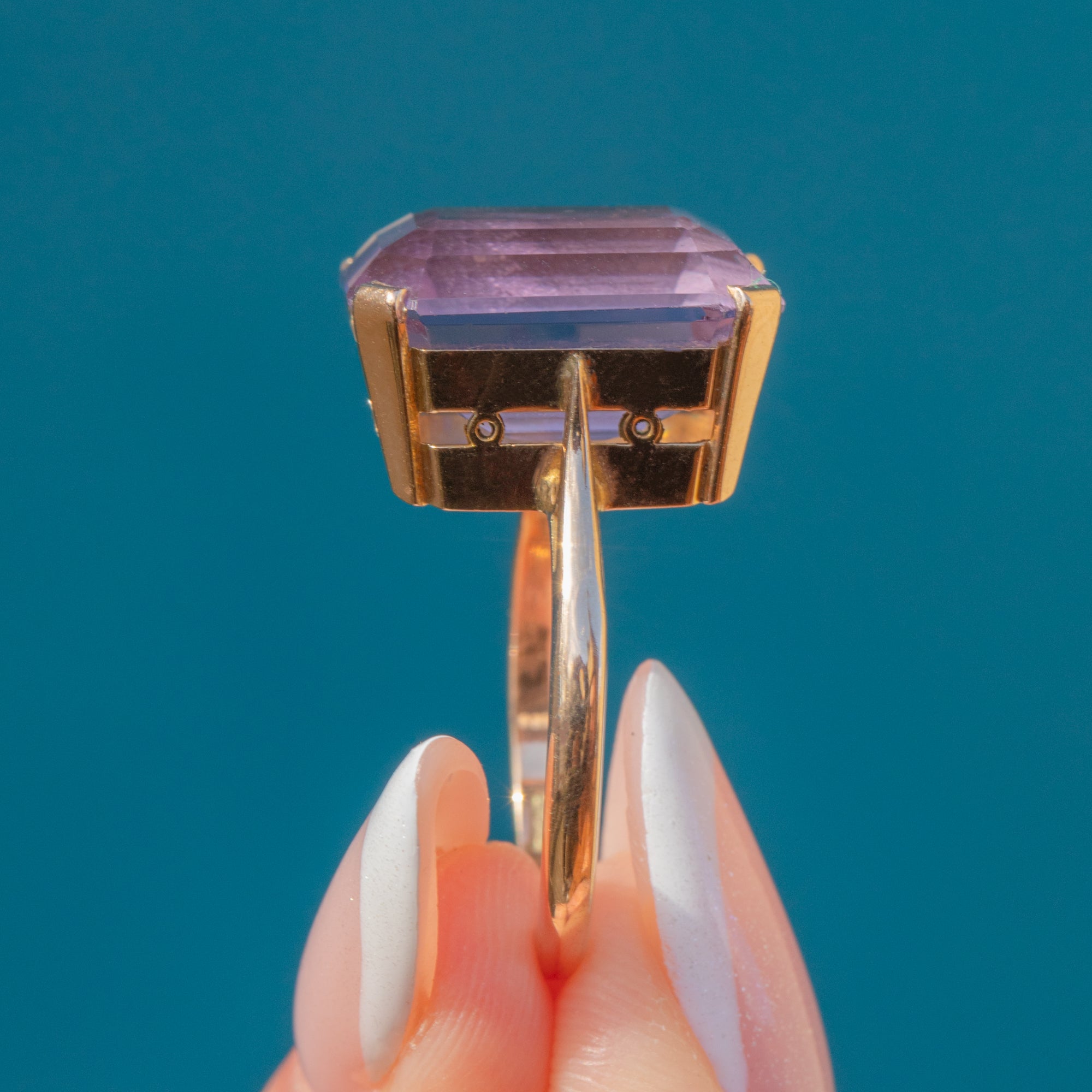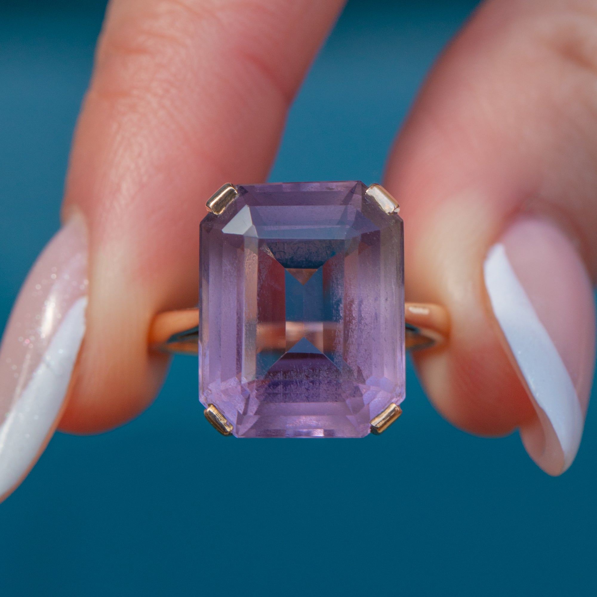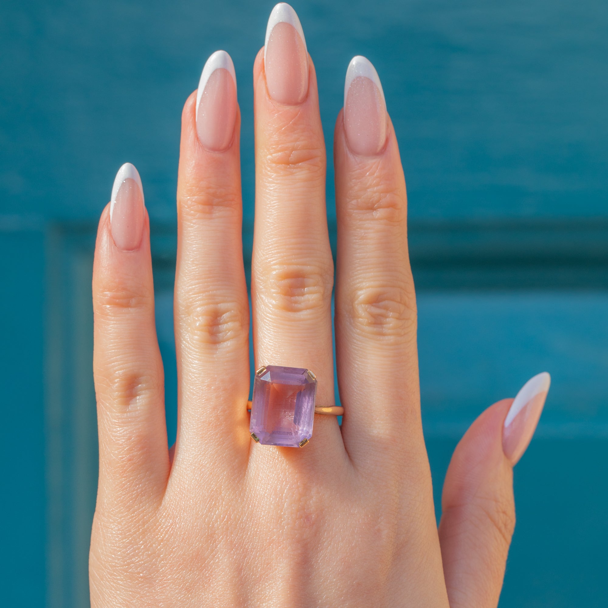 This elegant Art Deco 9ct Gold Amethyst dress ring is effortlessly beautiful. Boasting a spectacular 2.30ct rectangular Amethyst, her deep purple and lilac tones glisten in the light.