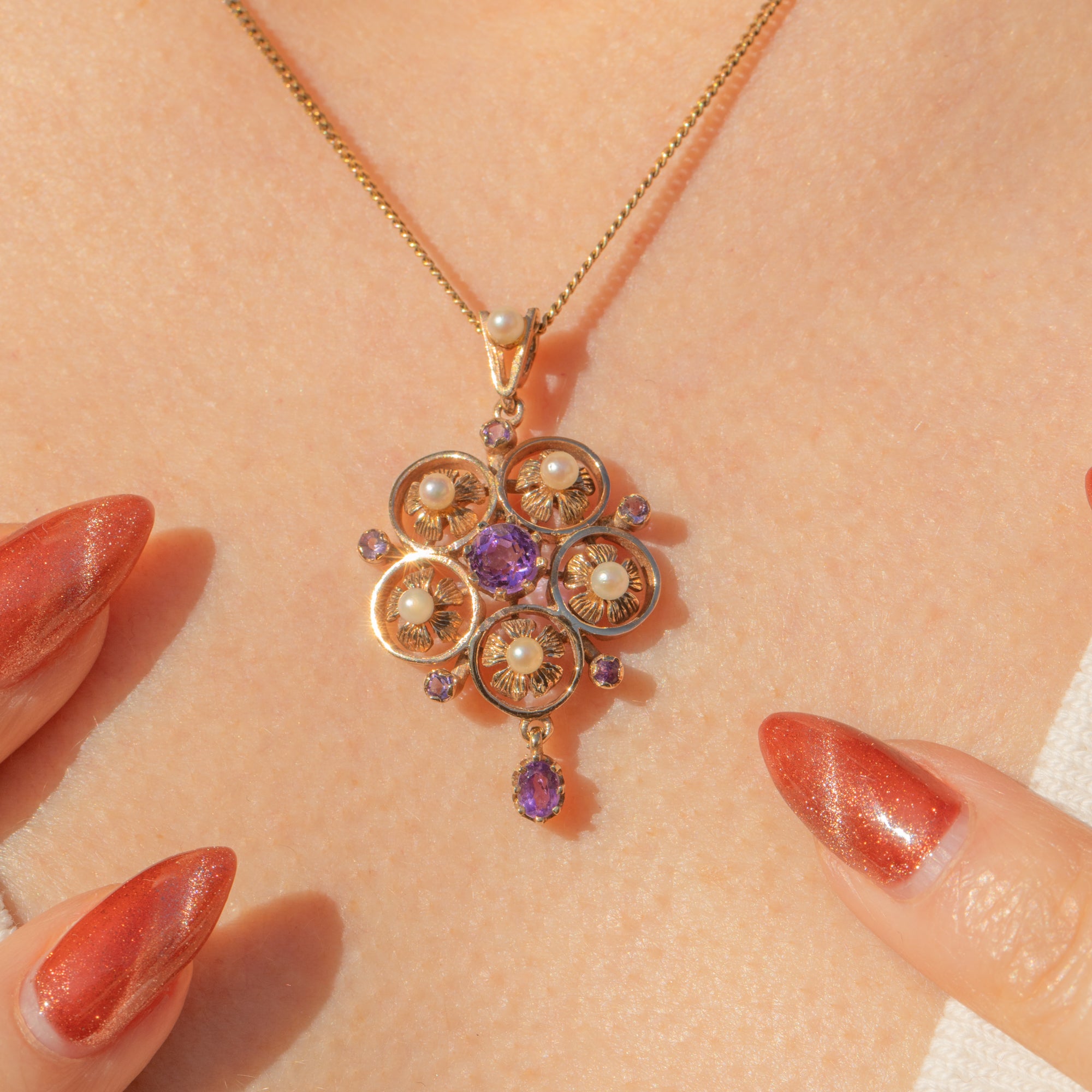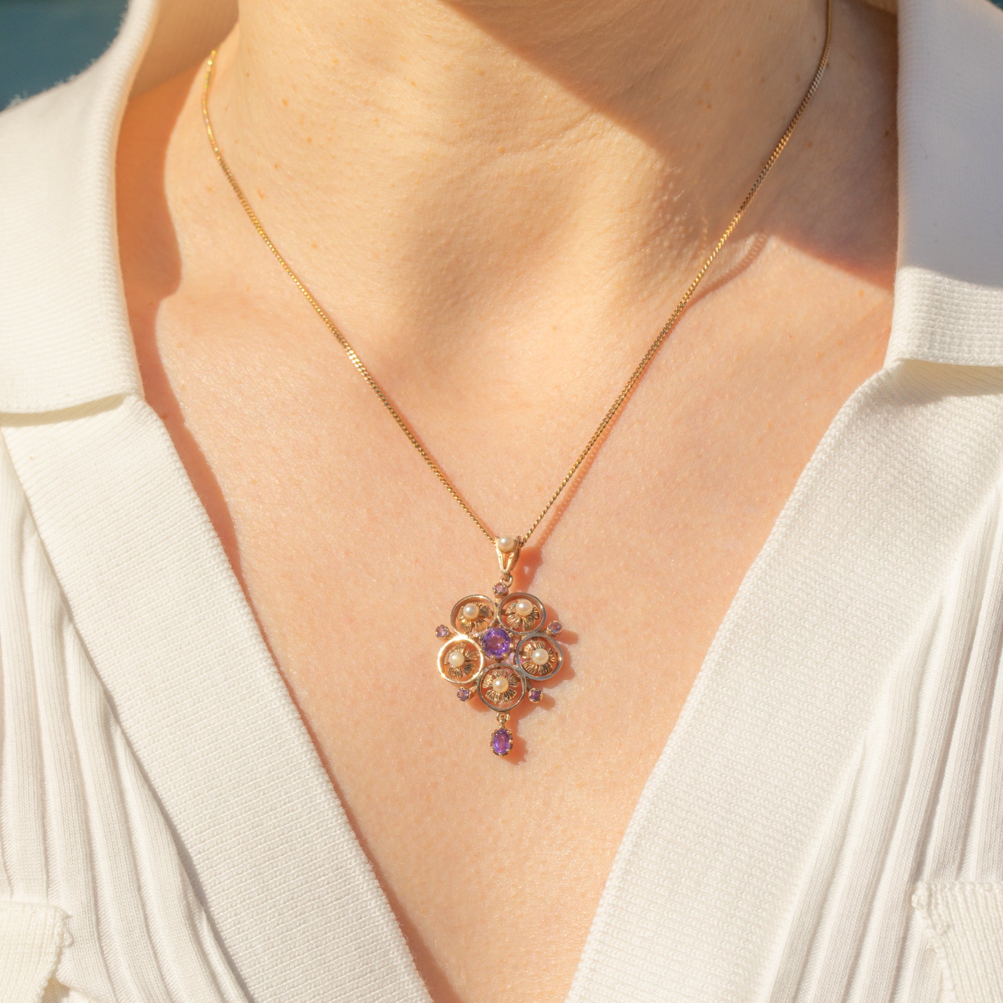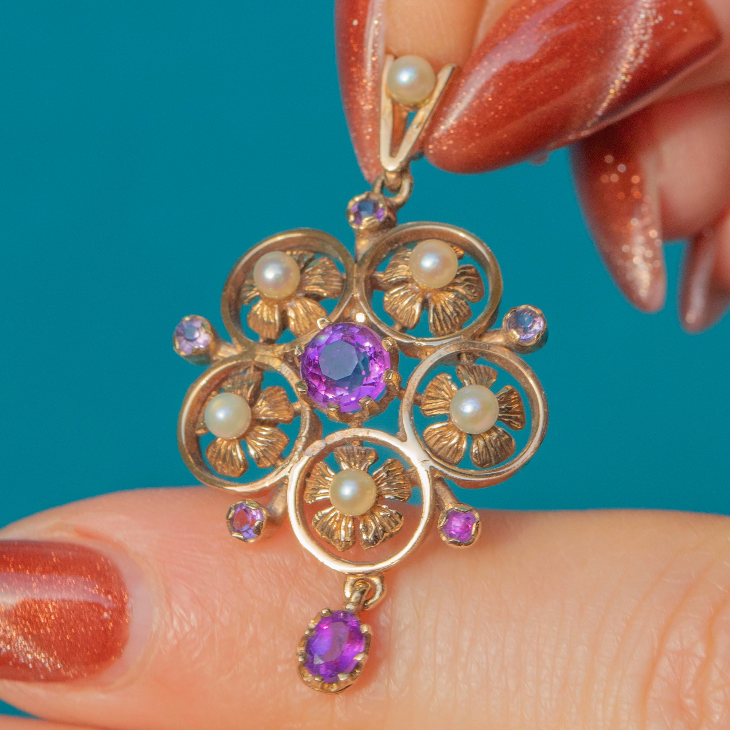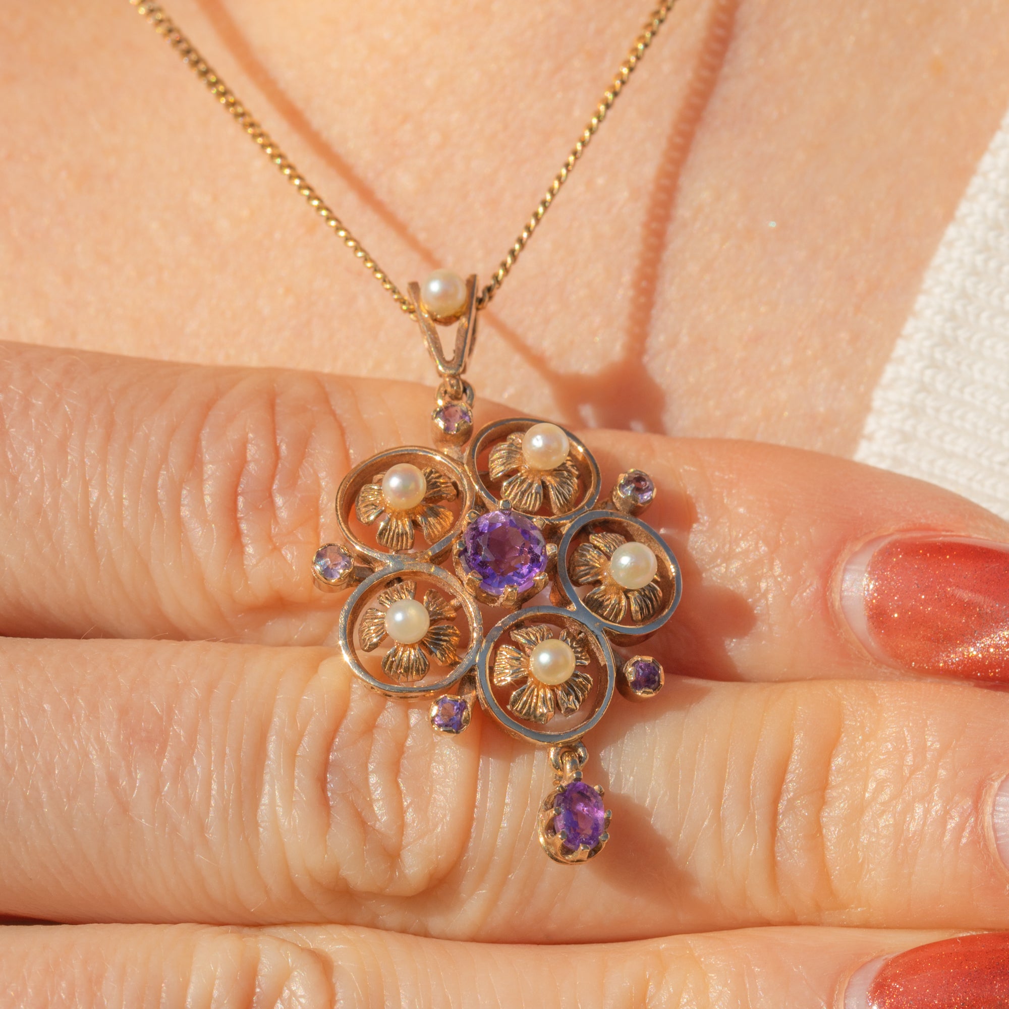 EXCELLENT: This 9ct Gold Amethyst Pearl flower cluster pendant is in excellent condition. The Gold has an even rosy hue throughout and the design of the pendant makes it a robust piece. The gemstones are all present and securely set, with no signs or surface wear. The Amethysts do vary slightly in hue, which we feel adds to their vintage charm. With a secure and study bale, you can enjoy wearing this vintage Amethyst pendant with utmost confidence!