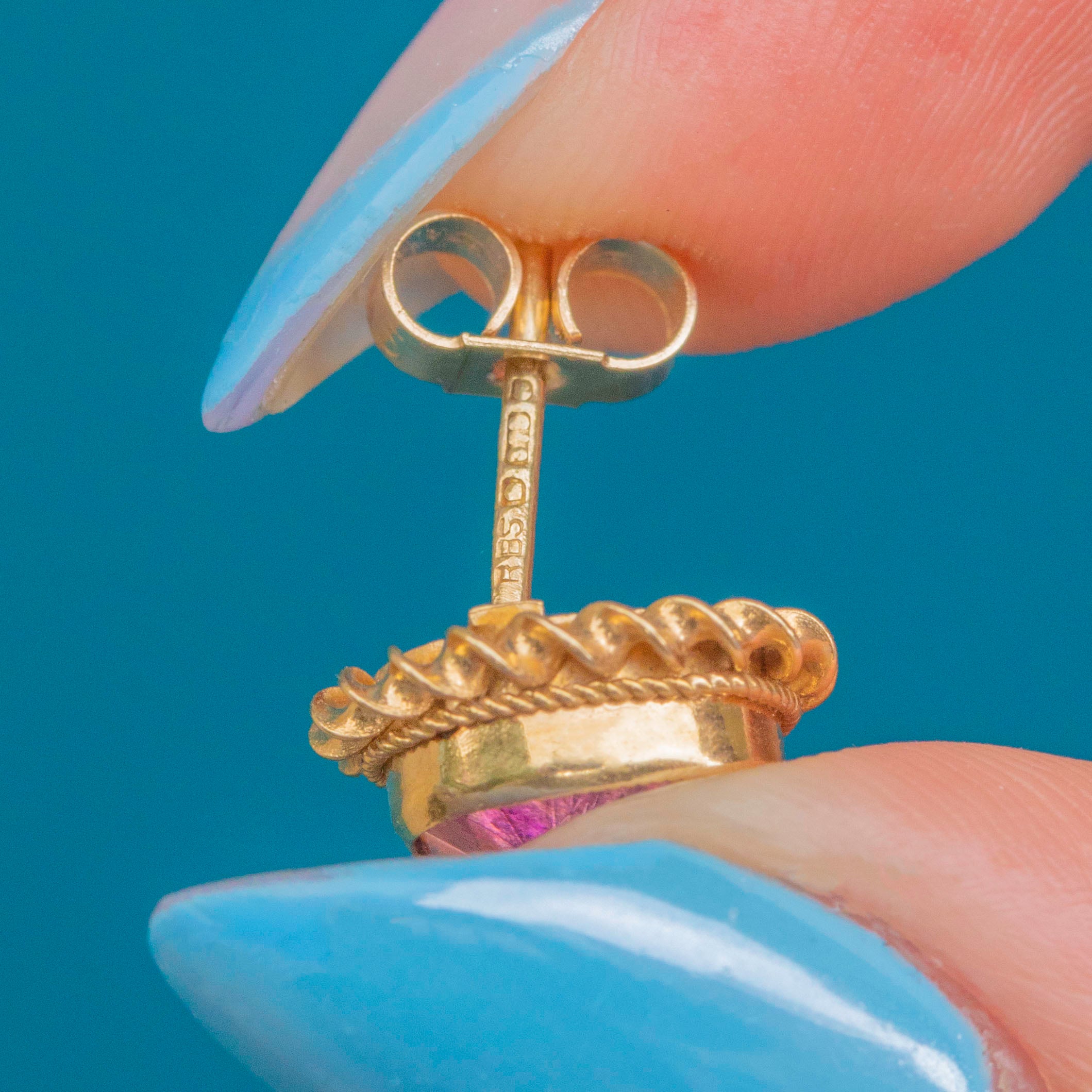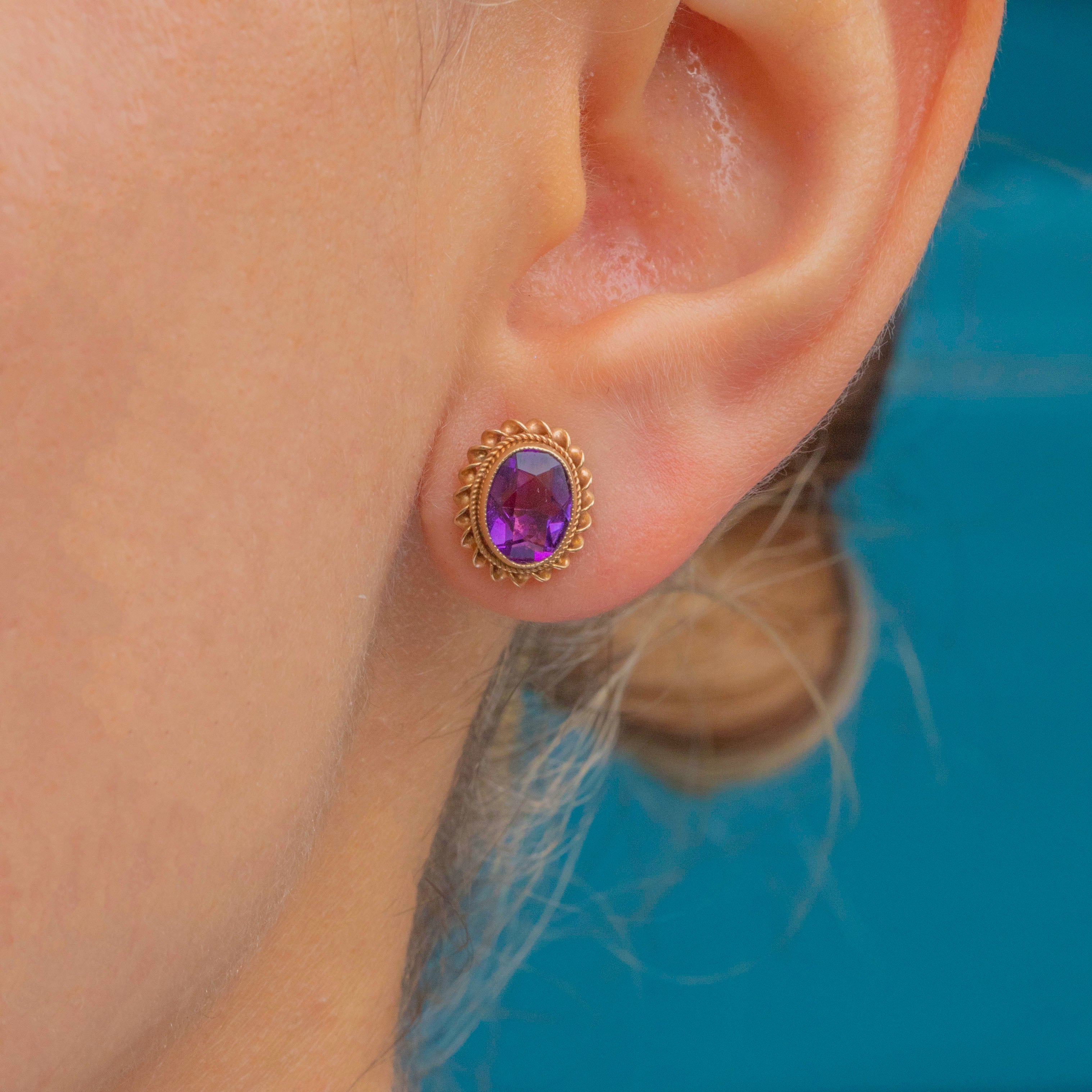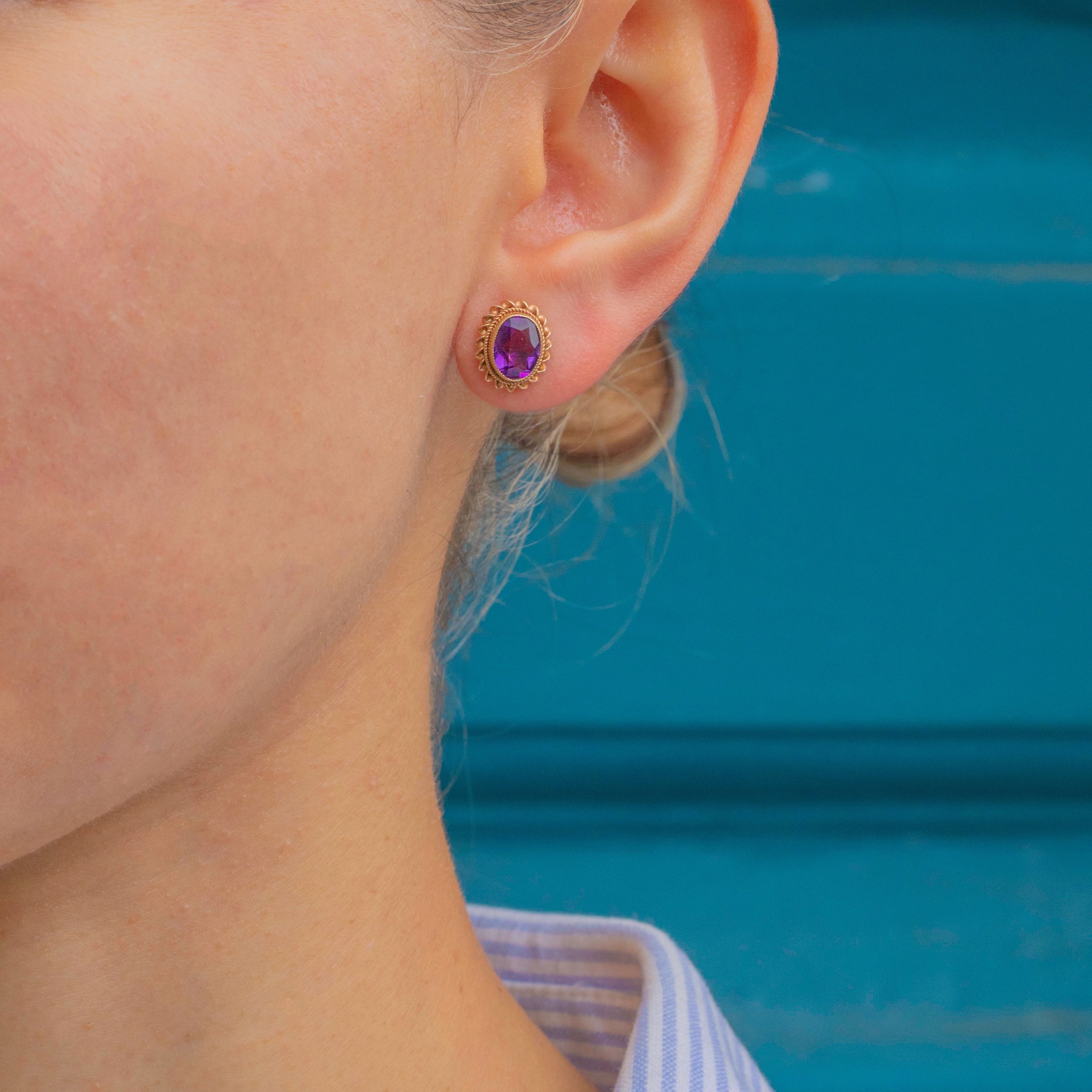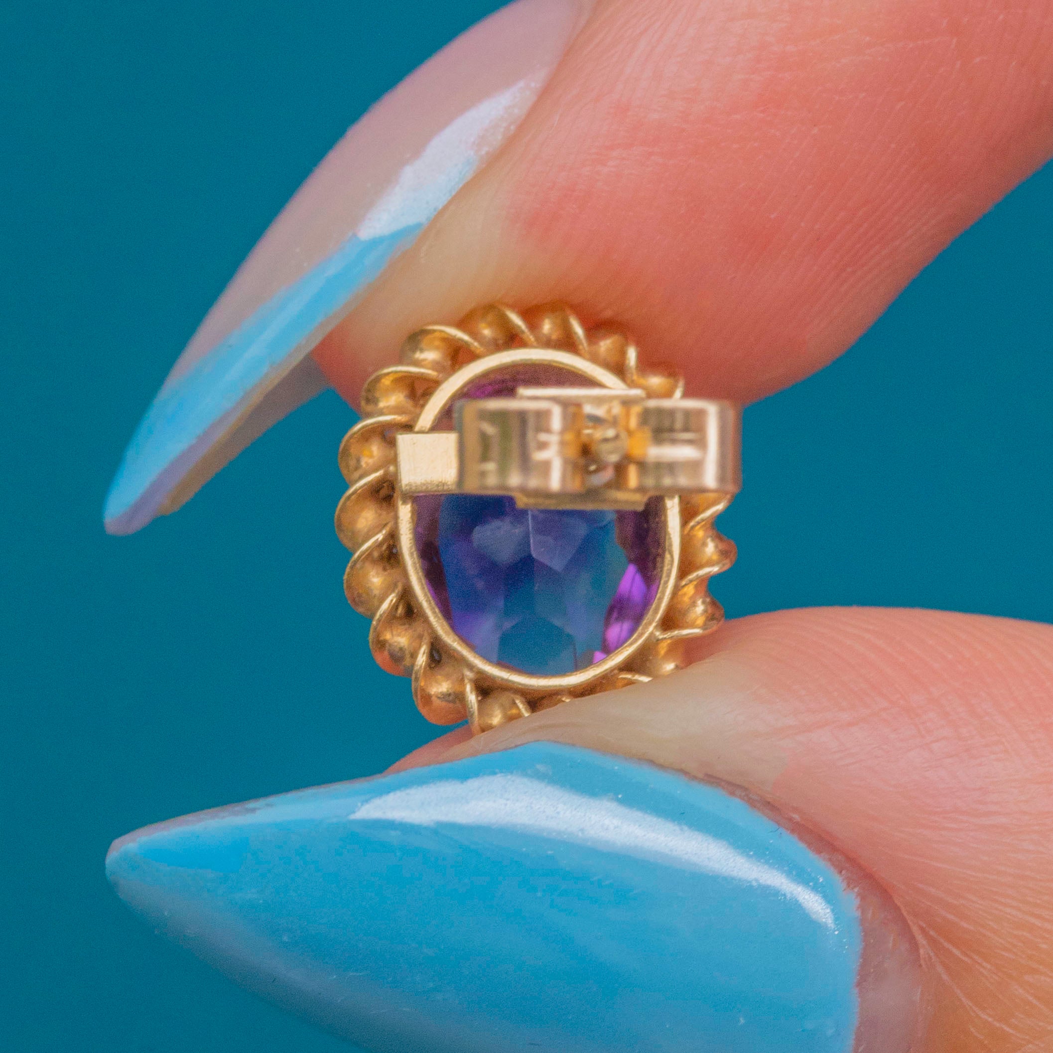 The gemstones are set within glossy 9ct Gold bezels, with an ornately formed twisted rope border providing a striking, decorative finish. Complete with a full set of hallmarks, these mid-century Amethyst studs radiate vintage charm.