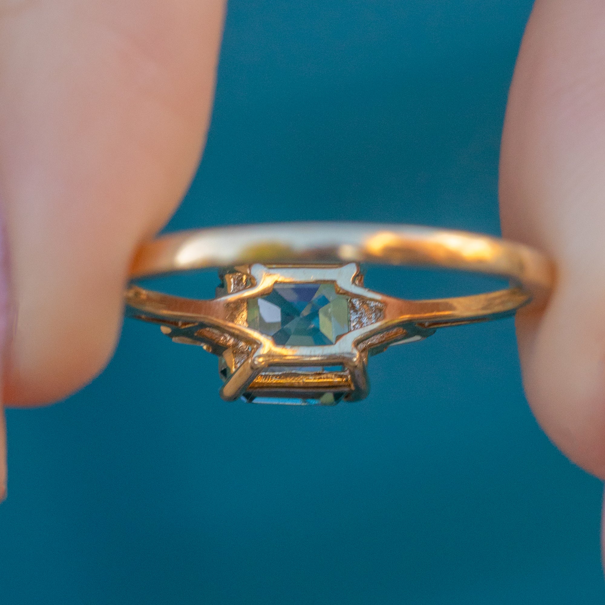 EXCELLENT. This 9ct Gold Asscher-cut Zircon ring is in excellent condition. Her 9ct Gold is well preserved and glossy, while her Diamond shoulders have retained their elegance. Her Zircon is free from wear, maintaining its neat facets and vibrant colour. With securely set gemstones and a smooth ring band, this Vintage Zircon Diamond ring will provide you with years of wear!