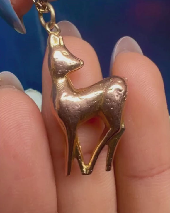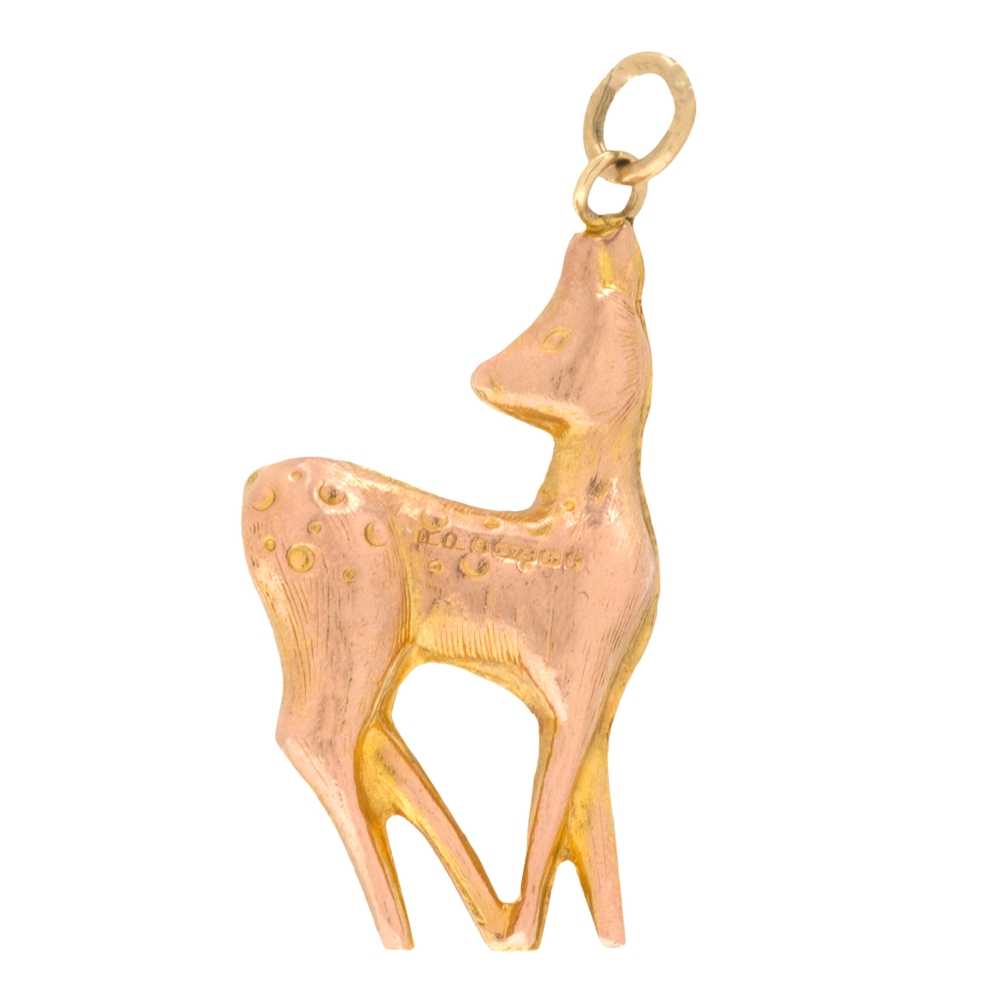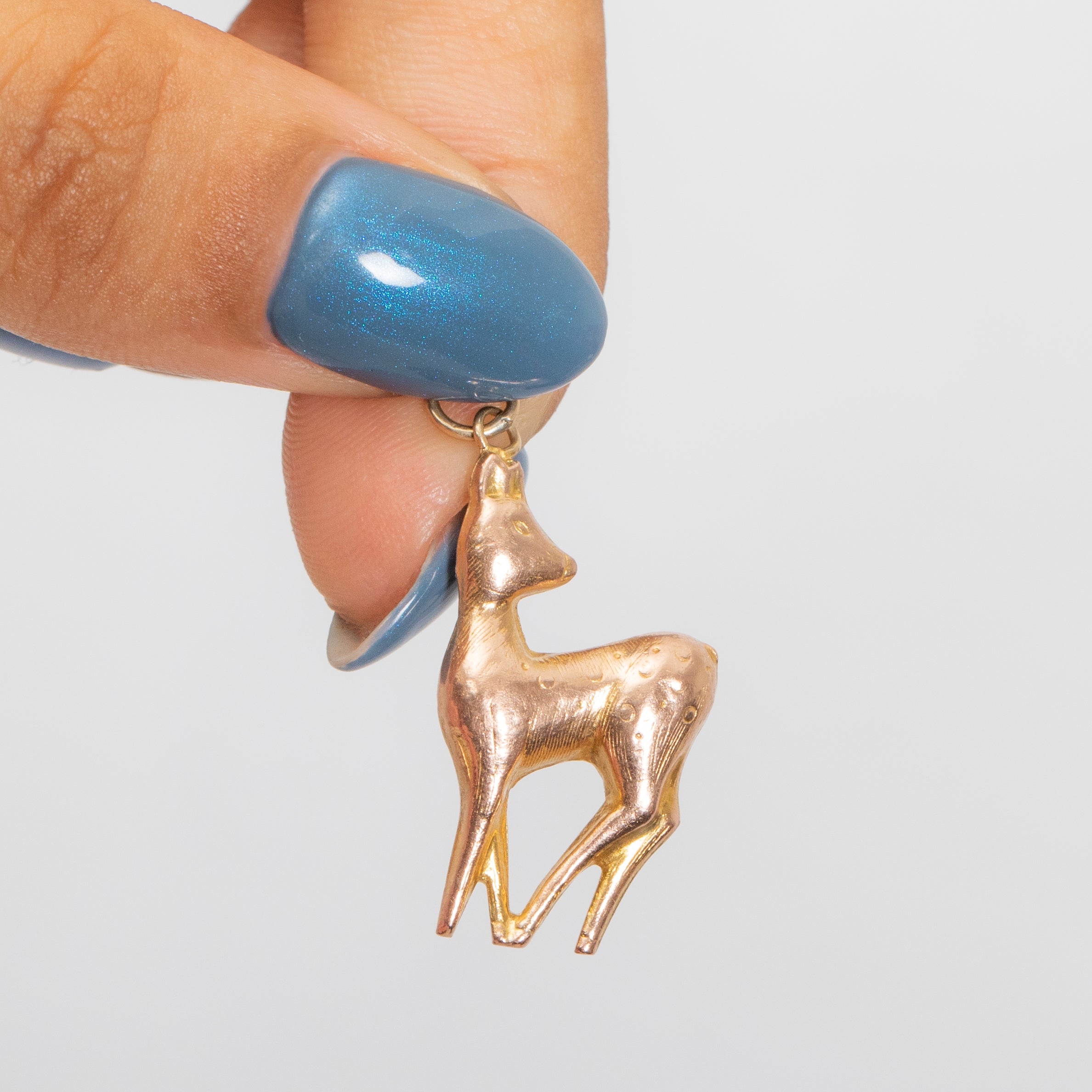 VERY GOOD. This 9ct Gold Bambi pendant is offered in excellent condition. The 9ct Gold is buttery and smooth, free from dents or dings. Some of the engraved details have worn over time, but the pendant has retained its form impeccably. With a soldered jump ring, you can suspend this vintage Gold charm from a chain with ease and wear her confidently!
