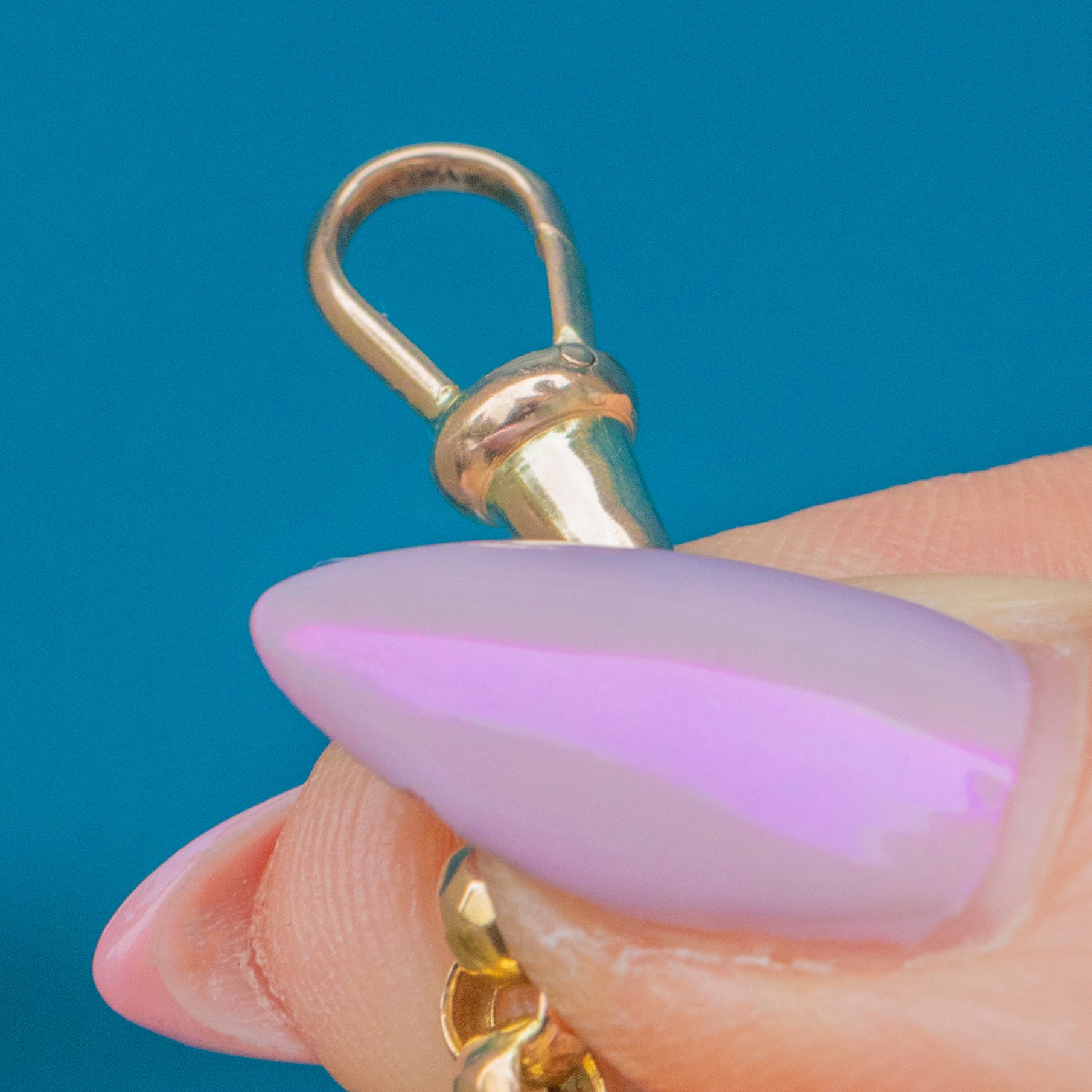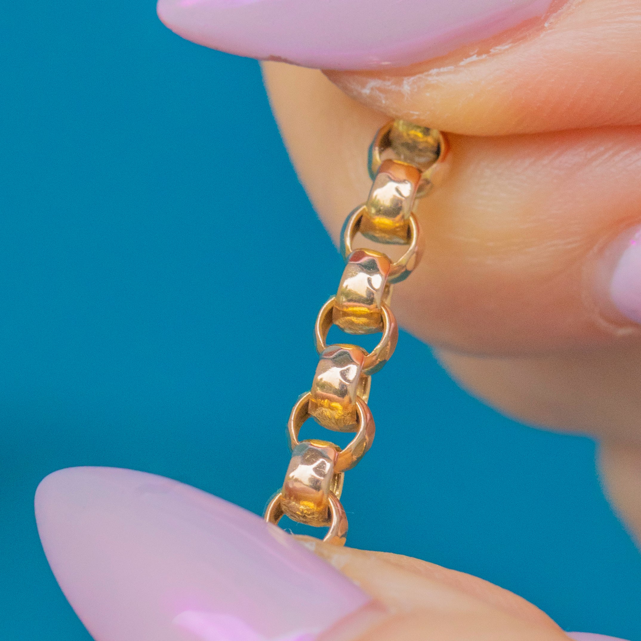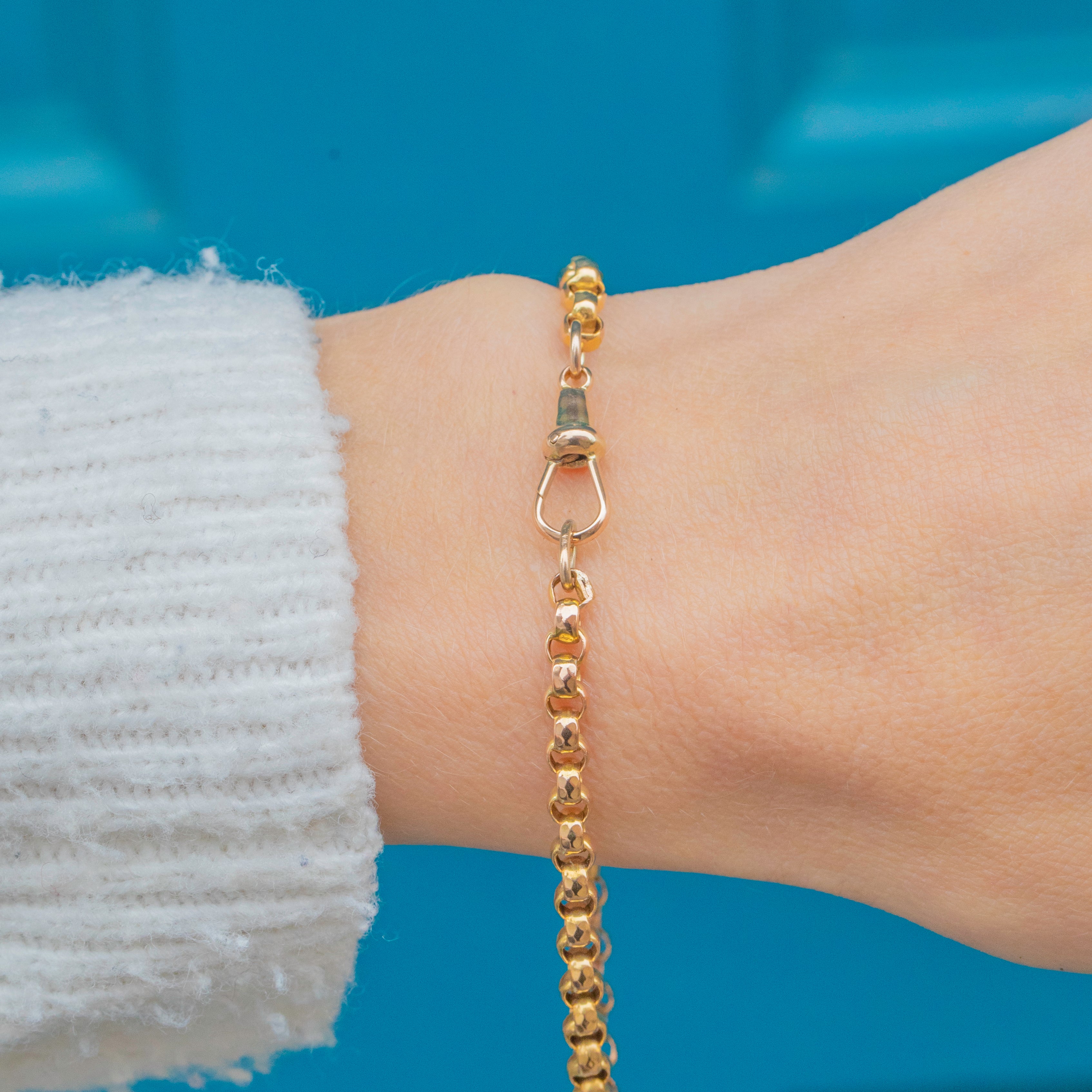 A lovely Antique 9ct Gold bracelet featuring classic round links with a bright, polished finish. Measuring 8" long, this versatile piece comes complete with a dog clip to which you could affix a charm for a personal touch.