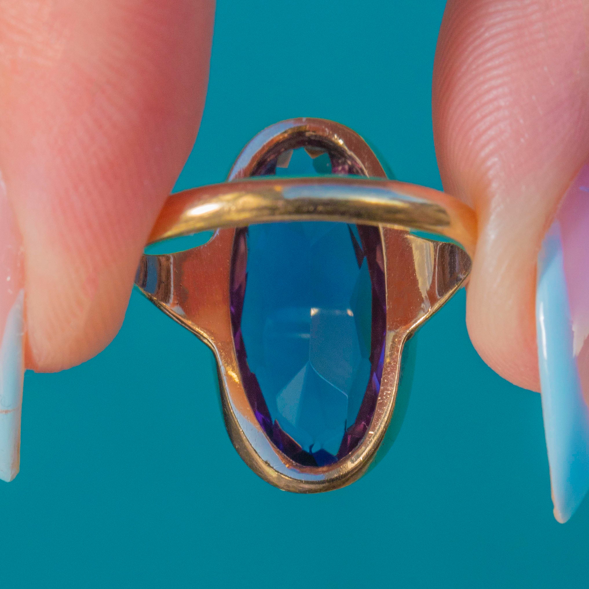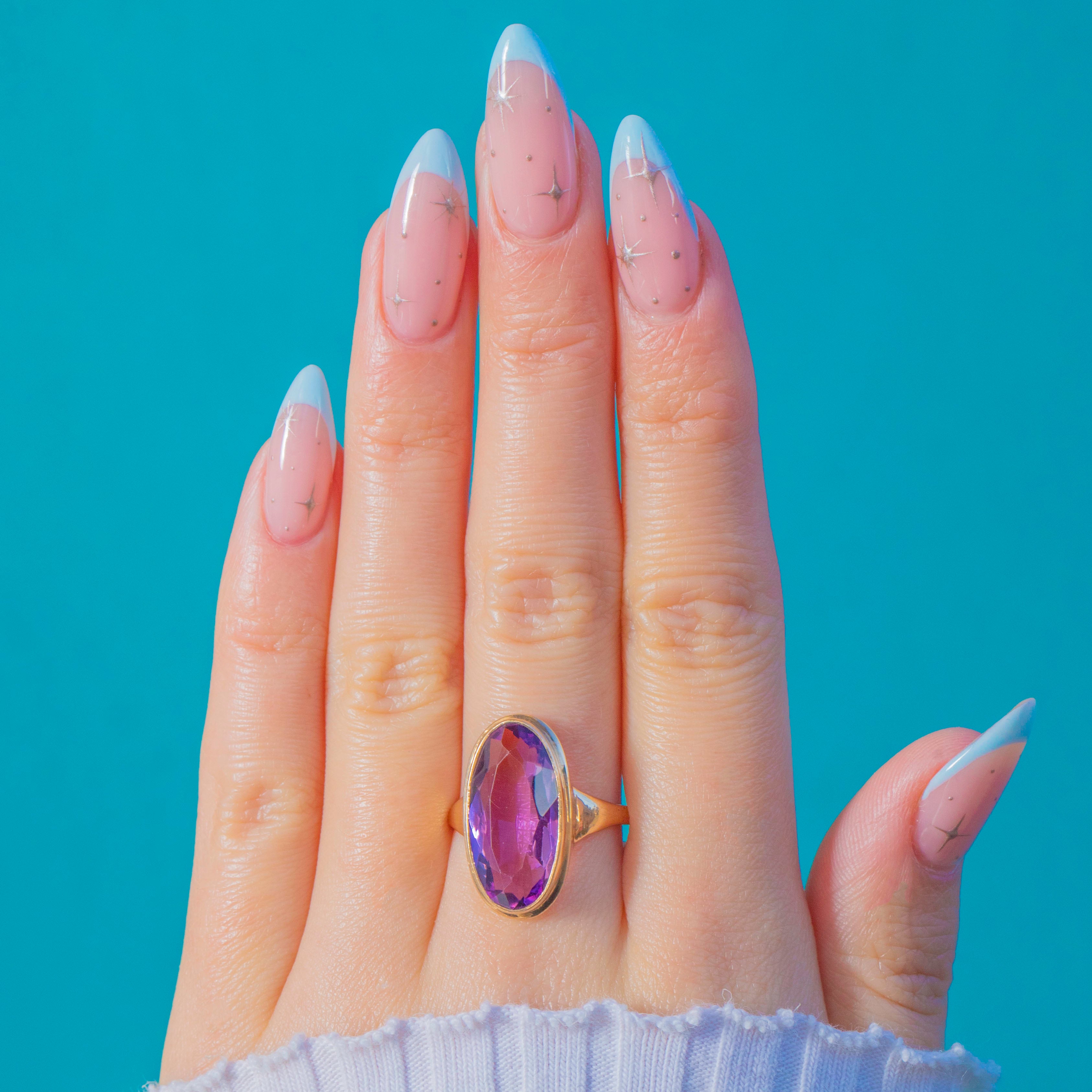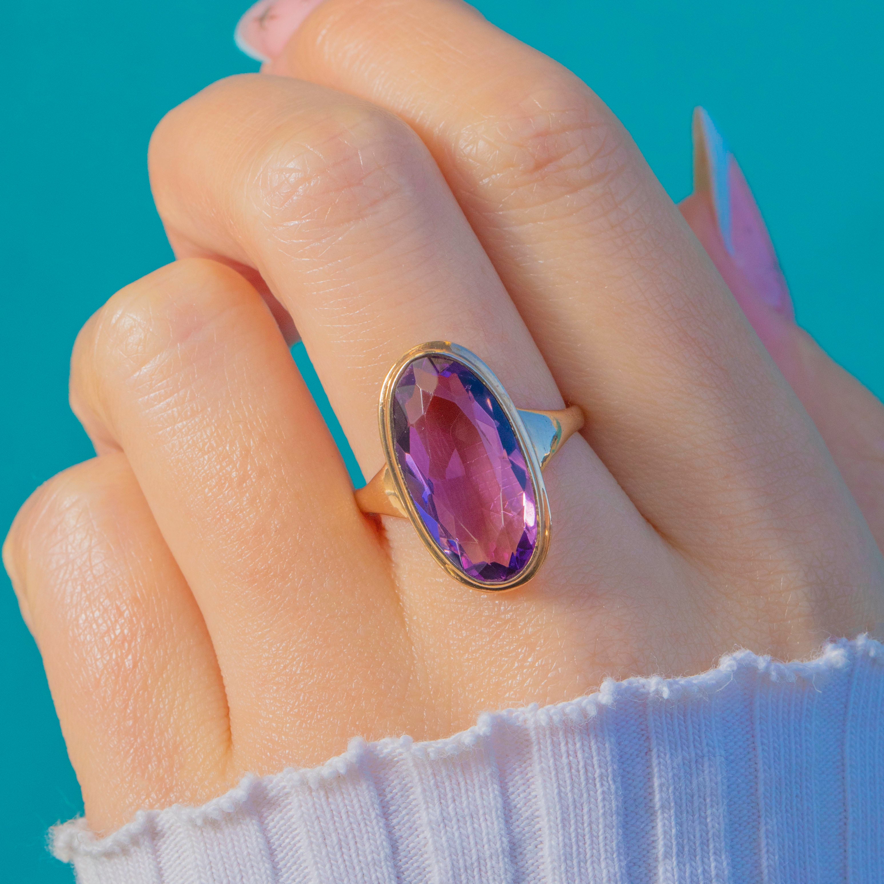 A striking Vintage 1950s solitaire, this 9ct Gold ring sets a beautifully elongated oval Amethyst in a smooth rub-over bezel for a sleek silhouette. The Amethyst is richly saturated, showing vibrant purple with violet-blue flashes that dance across its facets, and the open-backed bezel lets the stone glow.