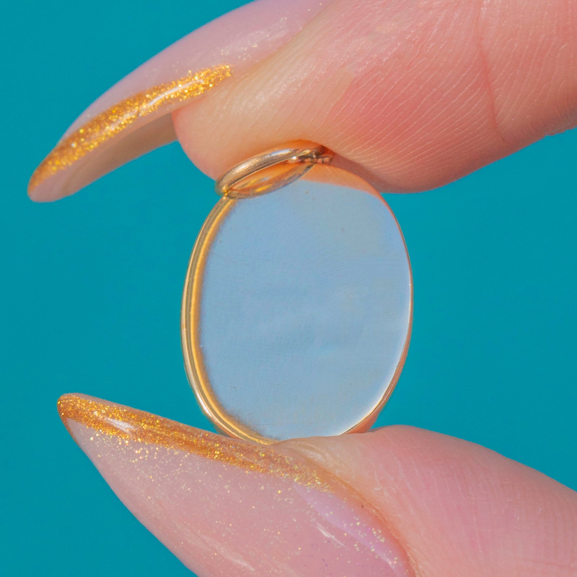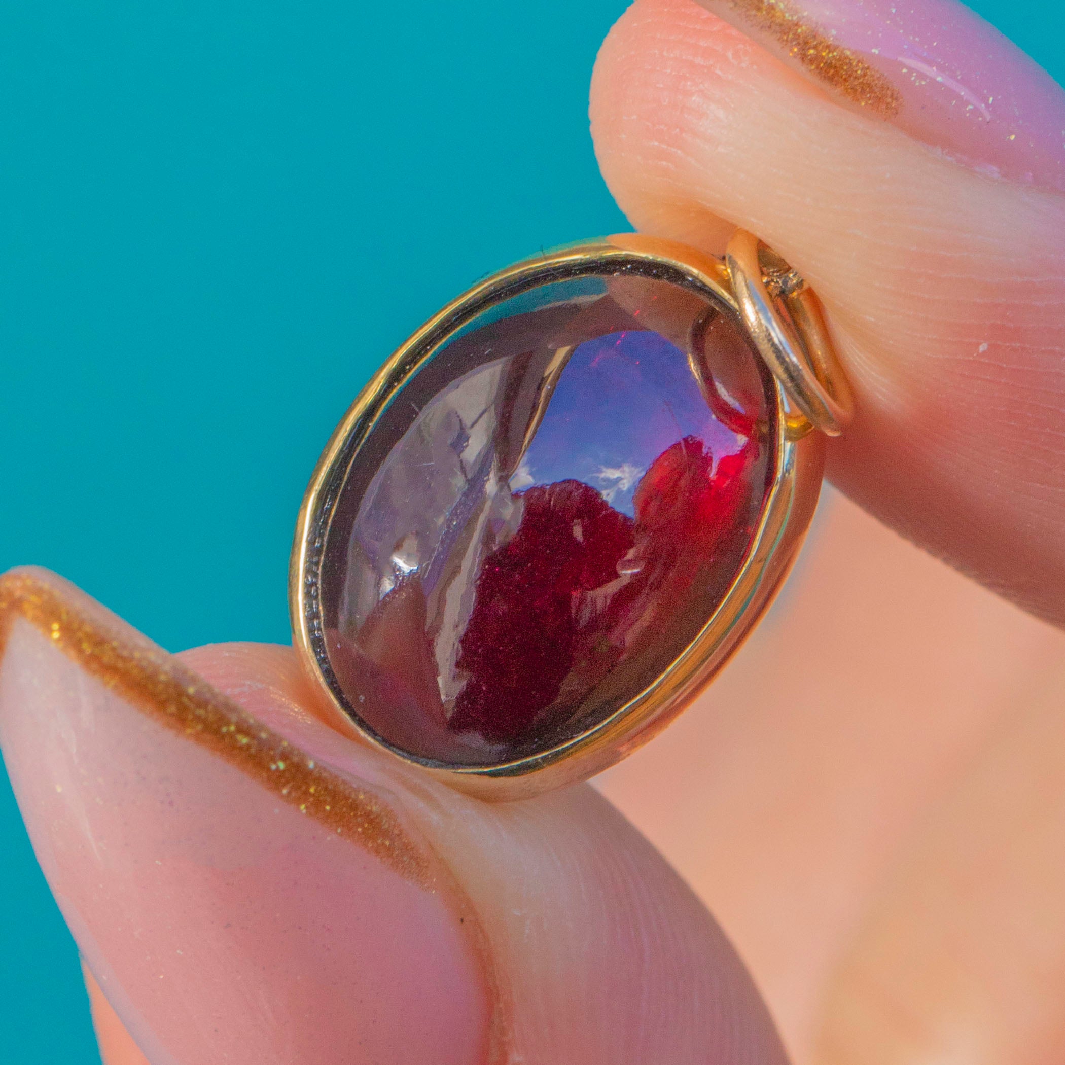 This vintage 9ct Gold charm showcases a luscious Garnet cabochon in rich shades of berry-red, magenta and plum. Beautifully domed with a glossy finish, the cabochon glows with depth and warmth, catching the light with every movement.