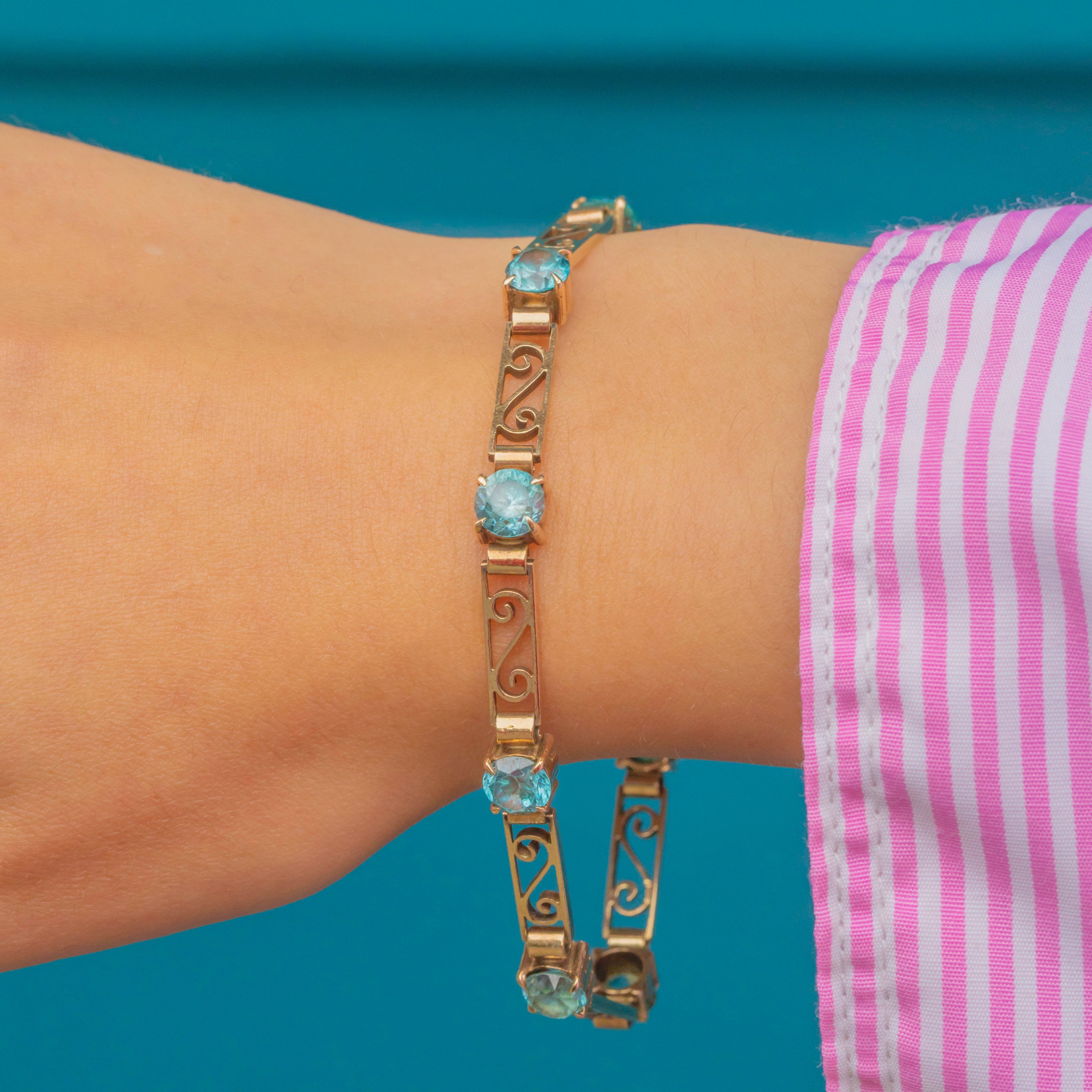 The Blue Zircons weigh an impressive total of 4.56 carats, glowing with their characteristic brilliance and vivid teal-blue hue. This piece is both refined and eye-catching, making it a perfect statement bracelet for evening wear or as a treasured addition to a vintage jewellery collection.