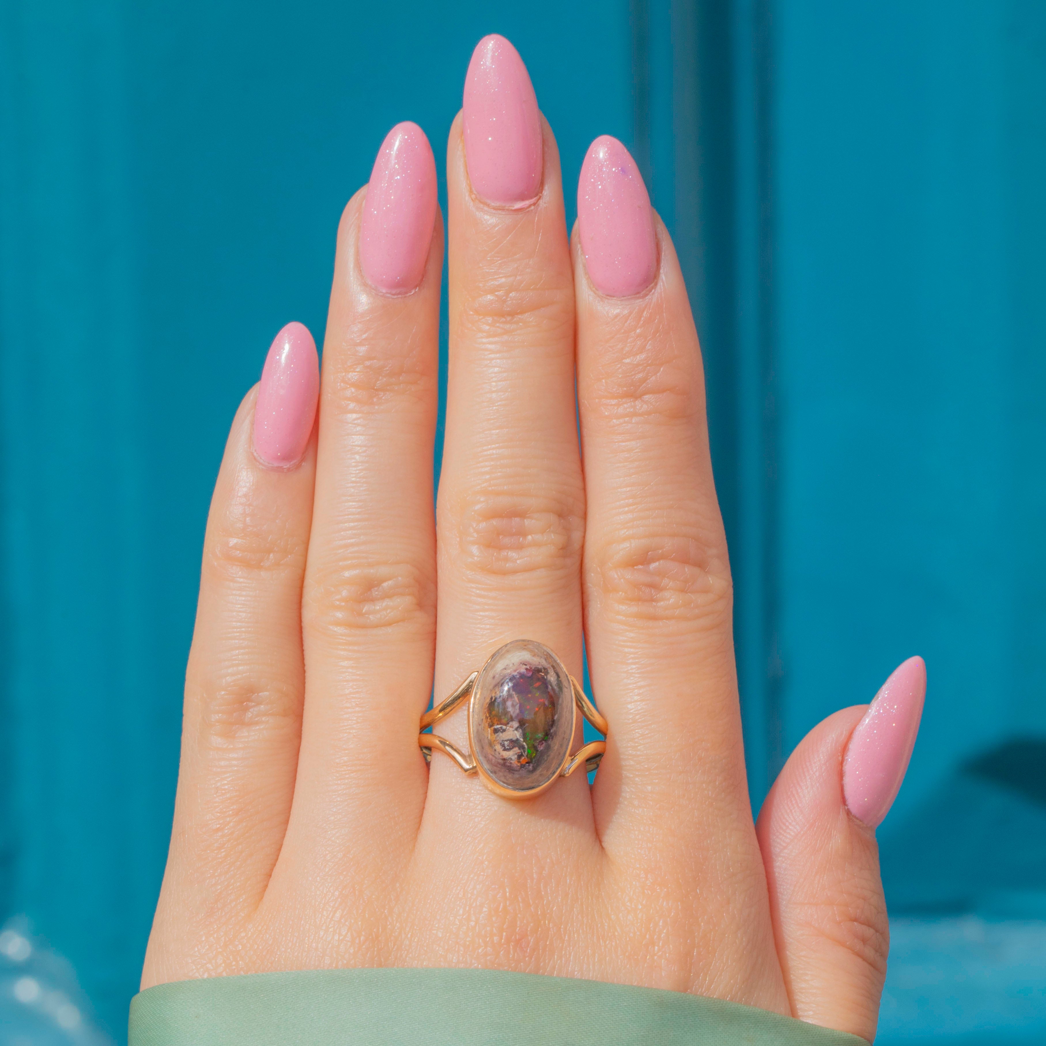 This 9ct Gold Boulder Opal cabochon ring is absolutely divine! Homing an exceptional Boulder Opalm mined in the depths of Australia, this vintage ring is a unique treasure.