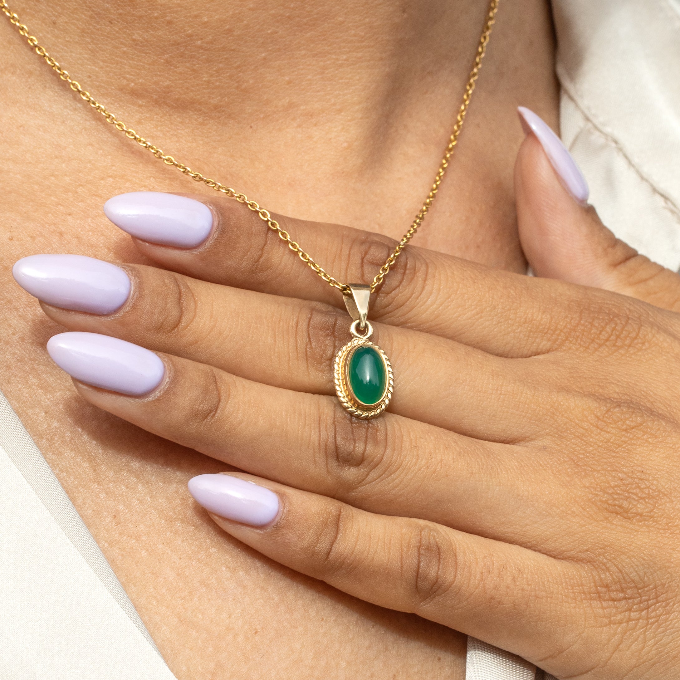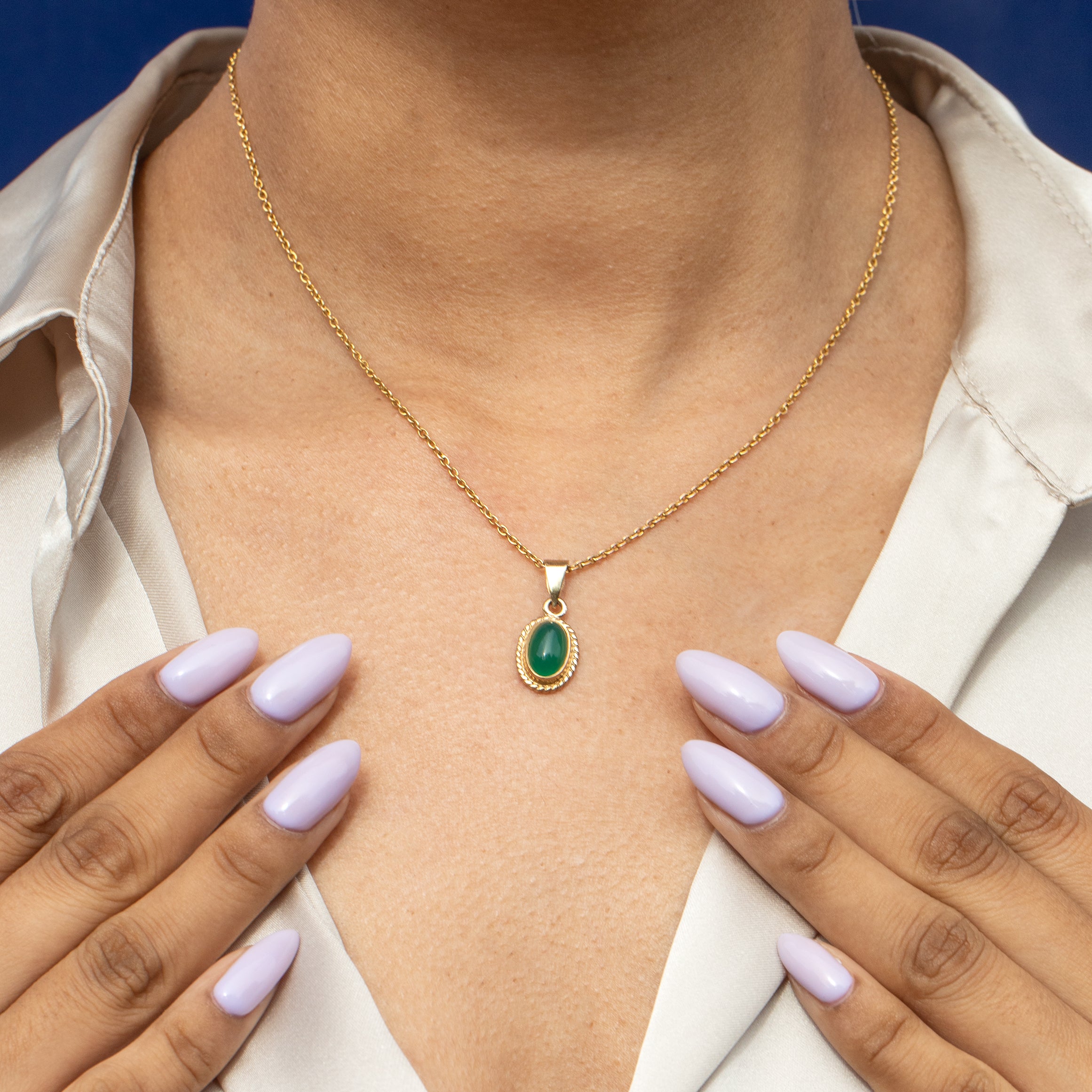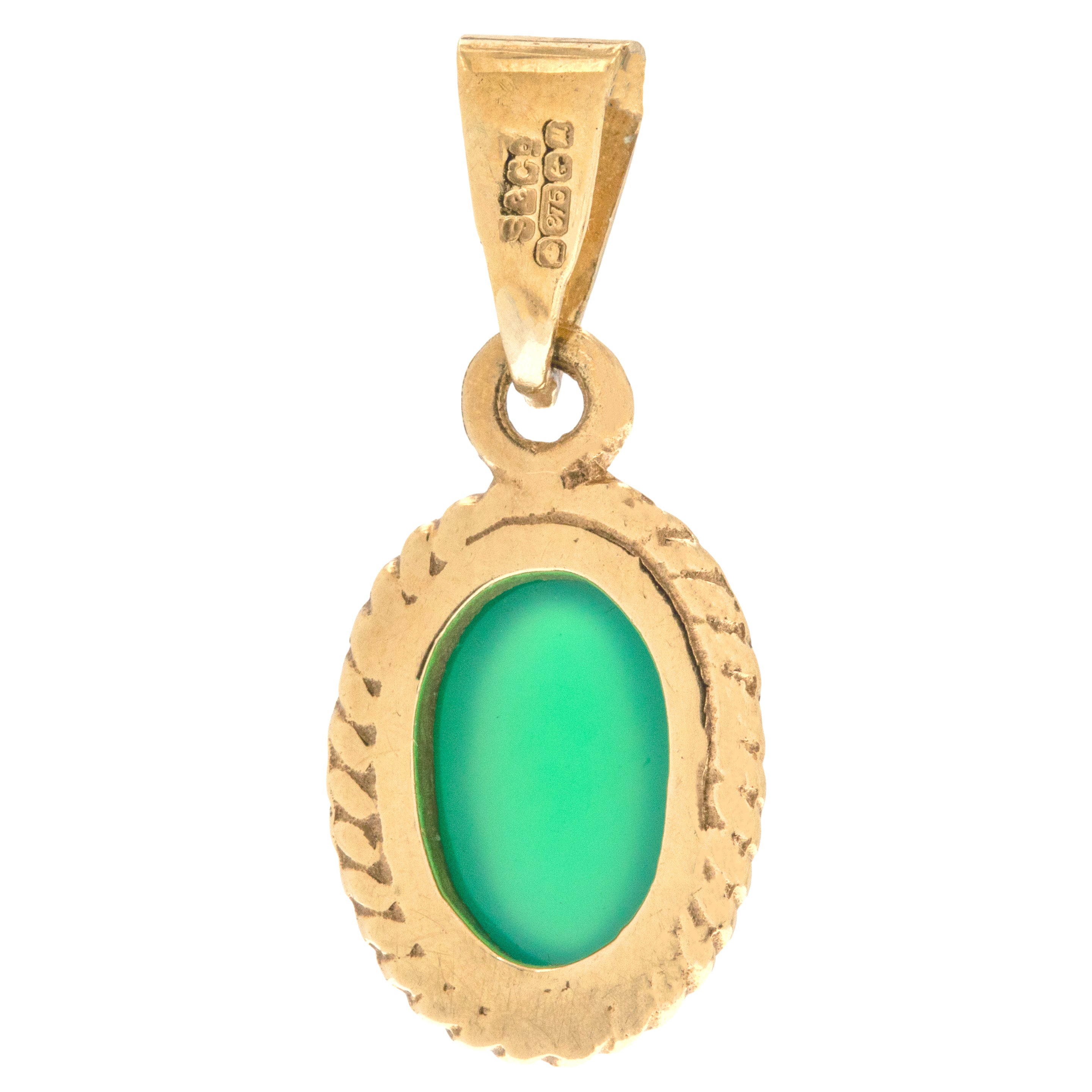 EXCELLENT. This 9ct Gold Chrysoprase charm is in excellent condition! The cabochon cut Chrysoprase is smooth to the touch, secure within the bezel setting, and flaunts mouthwatering hues. The rope detailing is securely soldered and crisp, with no dings to note. This vintage pendant is ready to wear straight from your Lillicoco box!