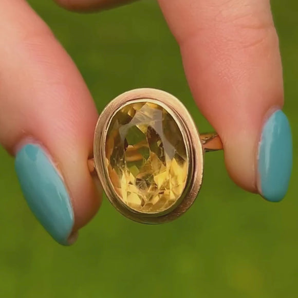 A sensational pairing, her 5.89ct syrupy Citrine is displayed in a honey-hued 9ct Gold bezel. This vintage cocktail ring is hallmarked to the year 1992, she's a piece you won't be able to keep your eyes off!