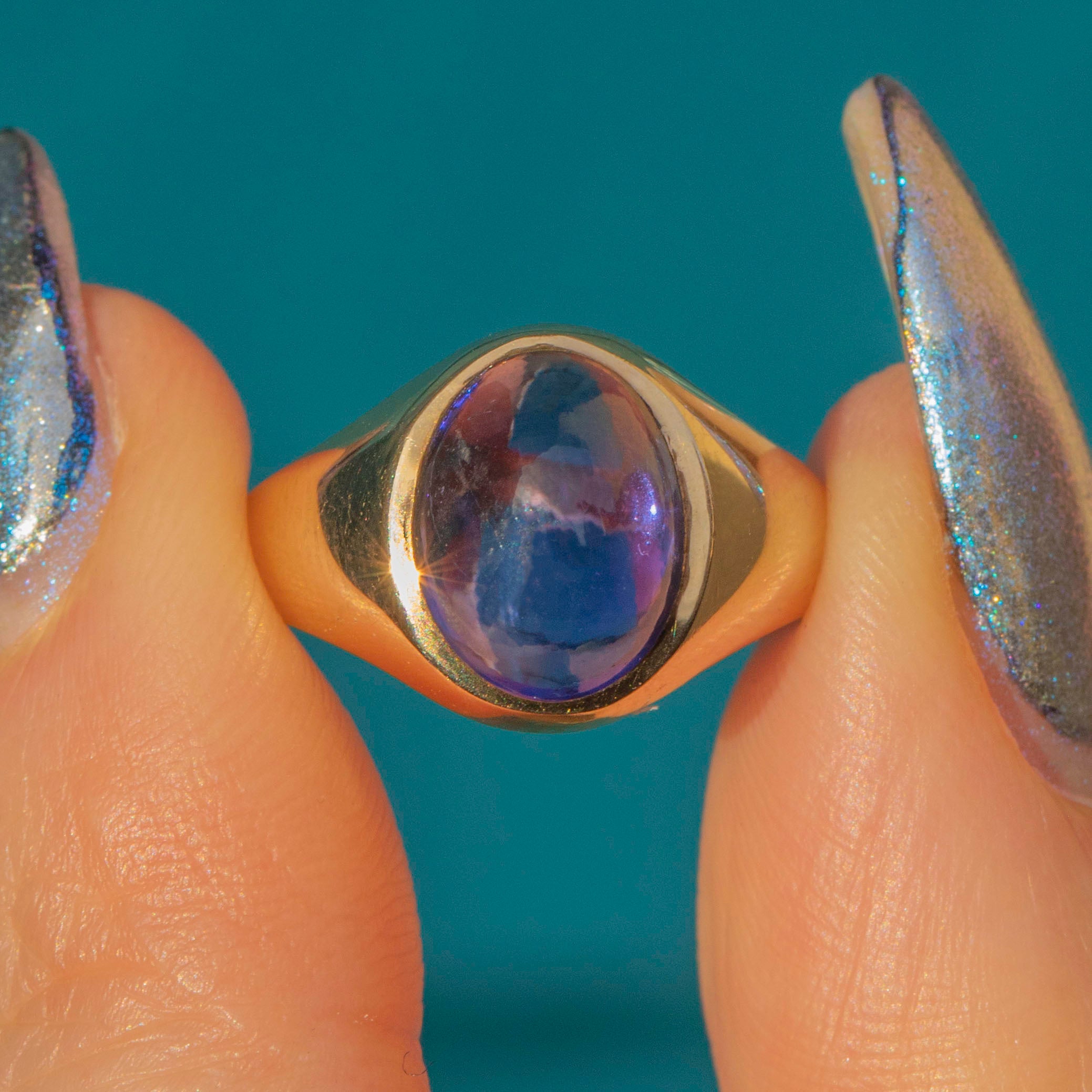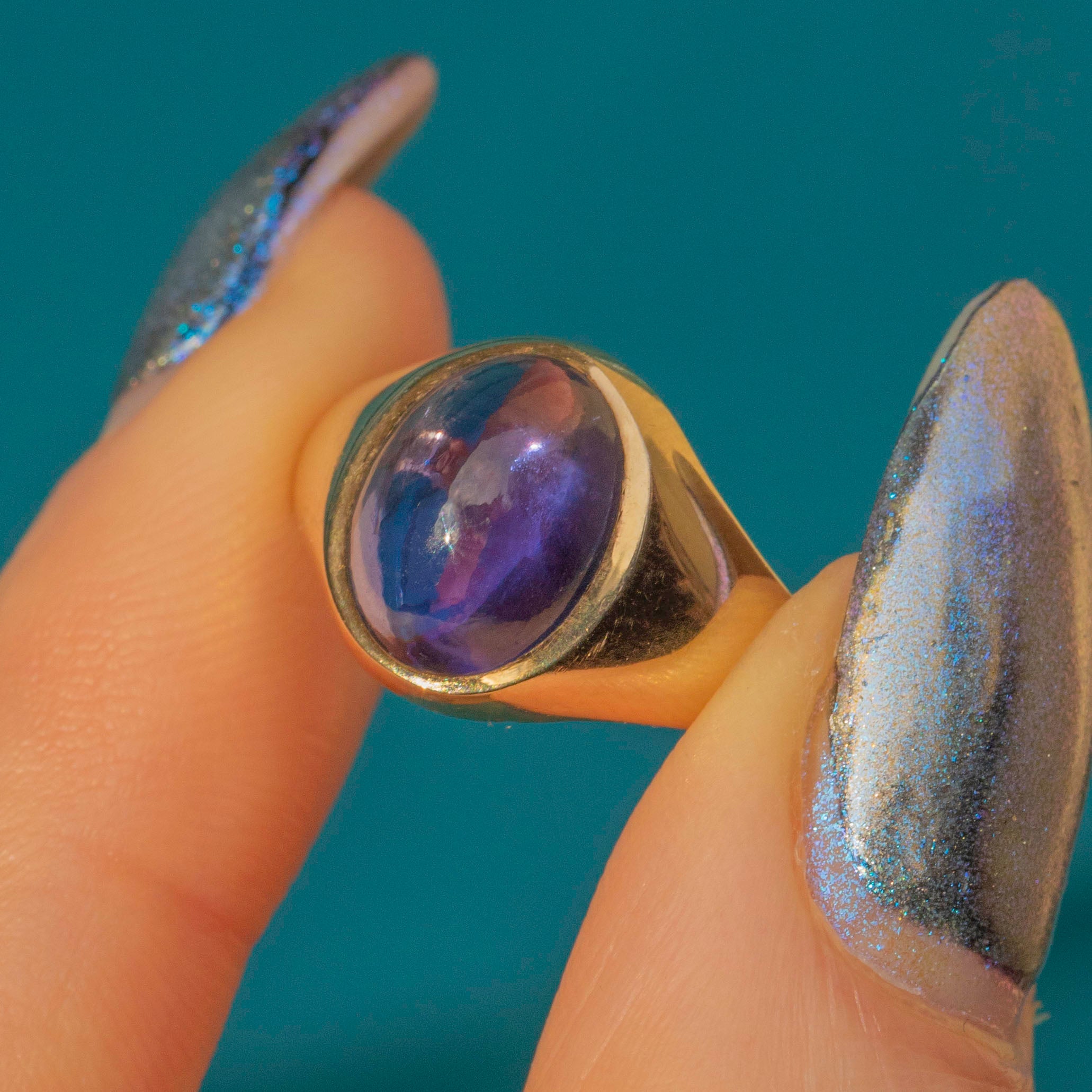 A fabulous glowing 9ct Gold purple Sapphire cabochon ring full of life and light! This mid-century delight boasts a pretty 3.20ct, with blue-purple base tones and flashes of indigo and mauve she is spectactular.