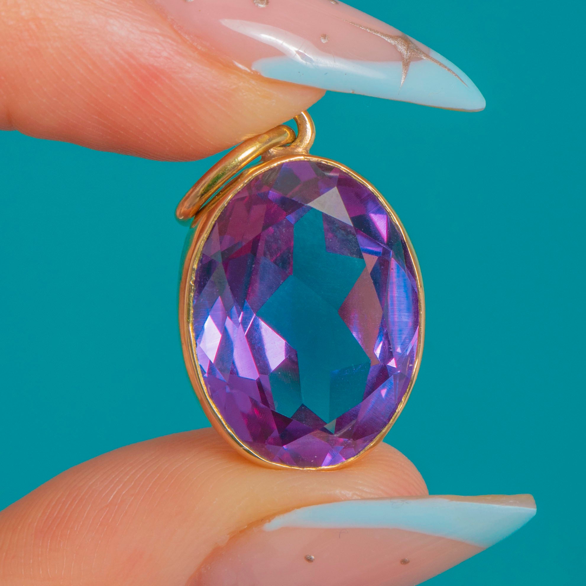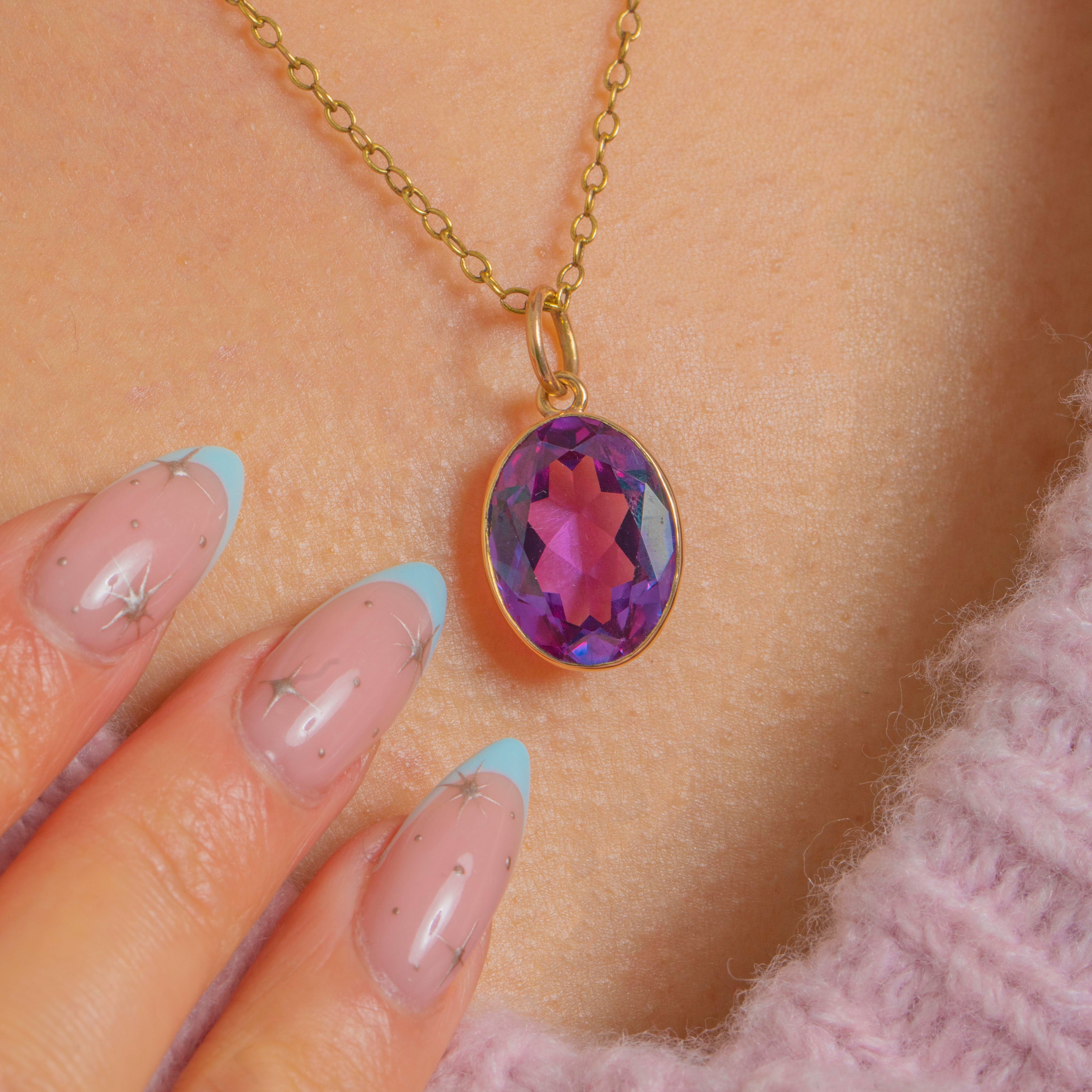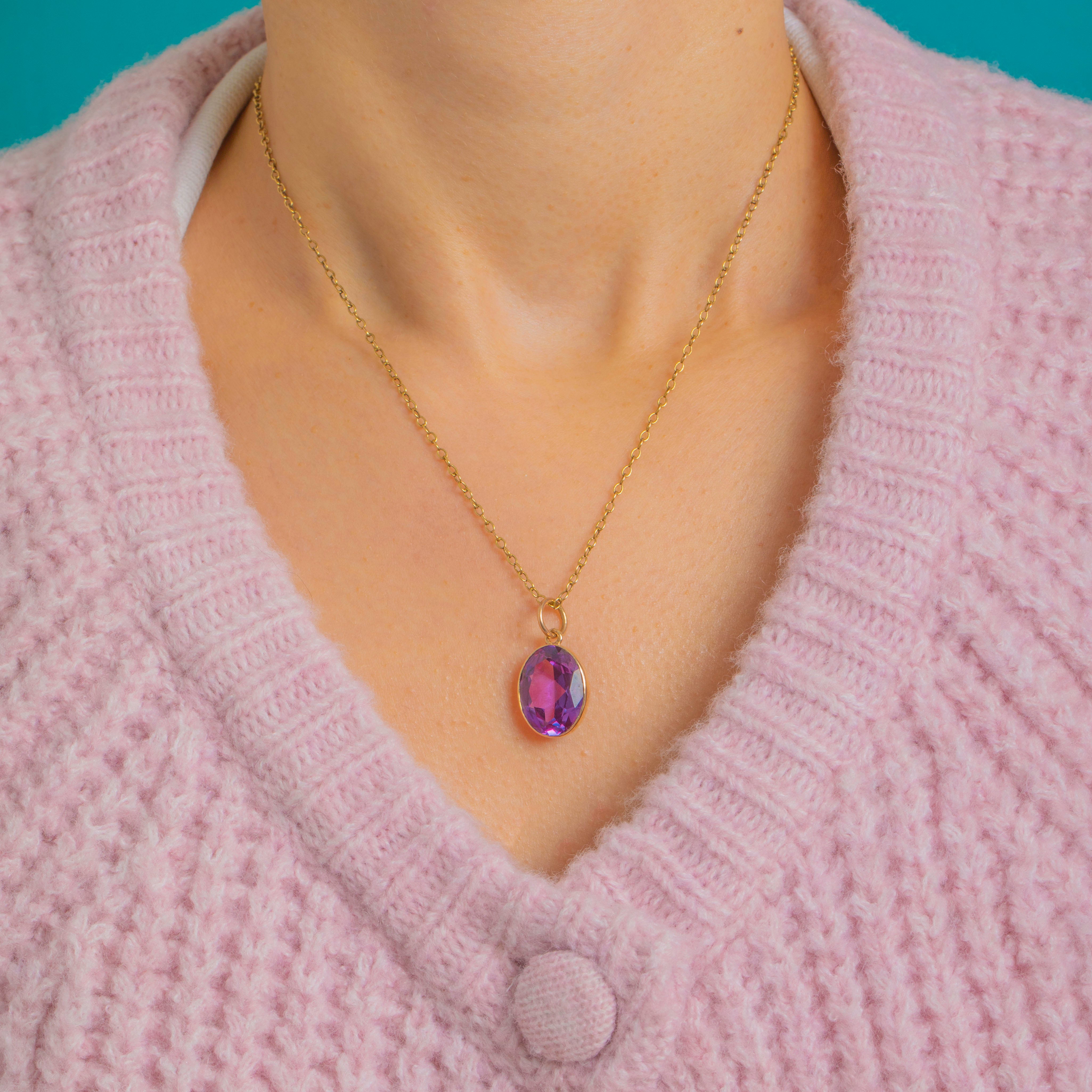 We are pleased to present this rare 9ct Gold colour change Sapphire pendant! You will be mesmerised by the array of spectacular deep violet hues as the Art Deco pendant catches the light; she is truly a sight to behold.