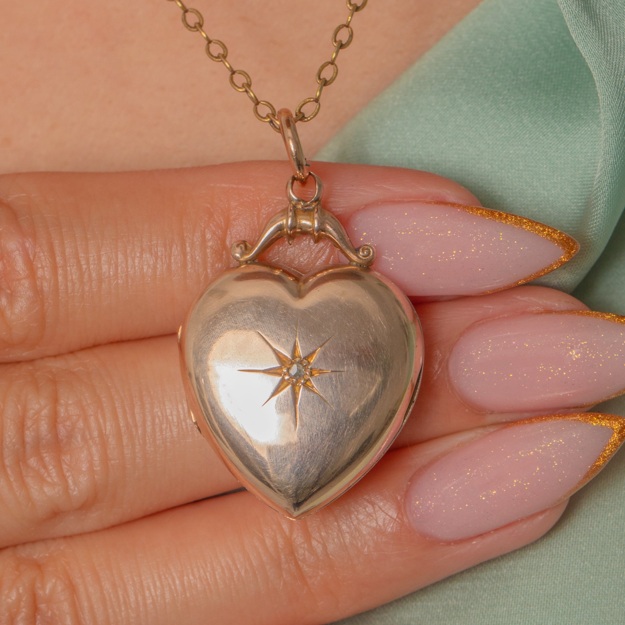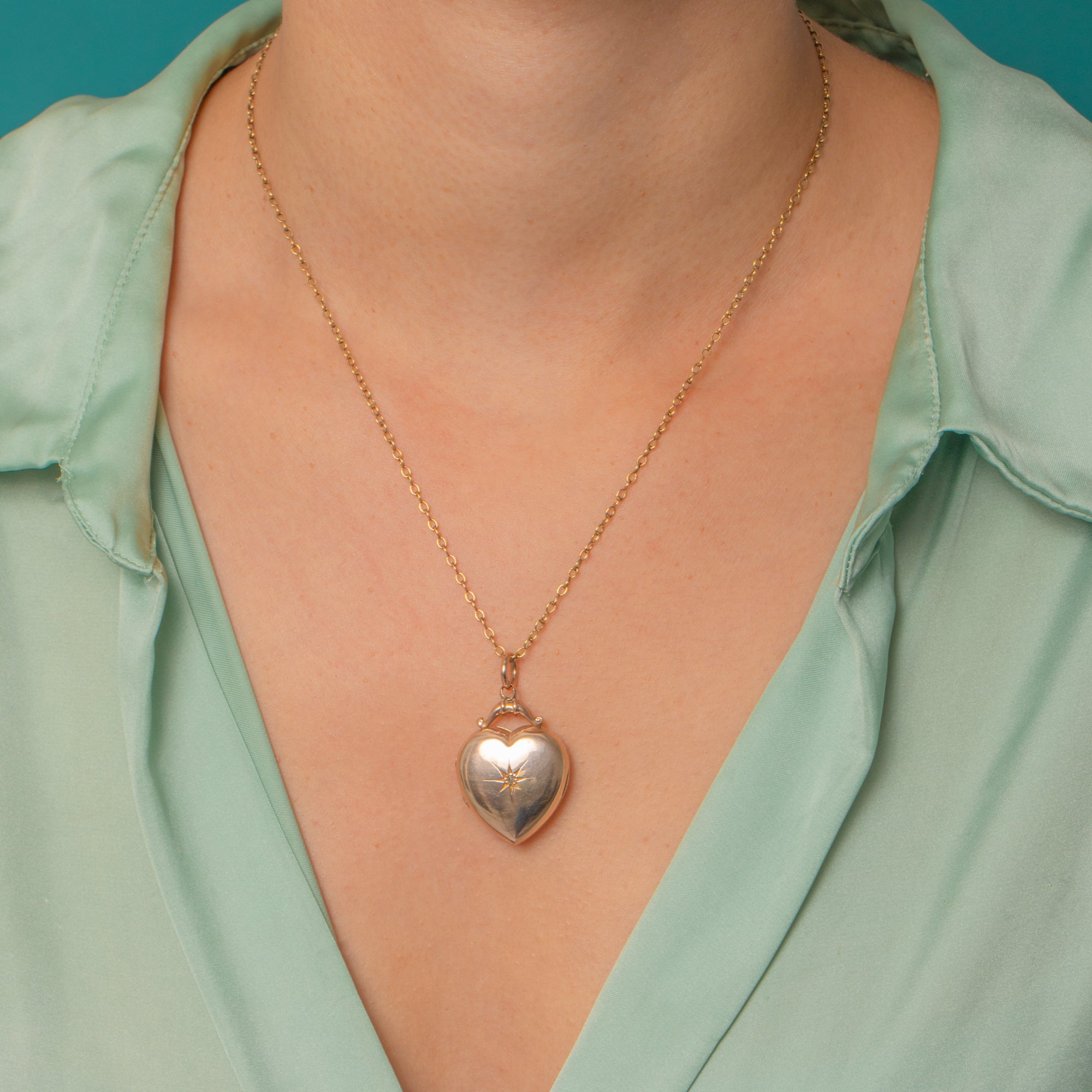 This beautiful Vintage locket is crafted in warm 9ct Gold and styled into a romantic heart shape. The softly puffed heart form features a hand-engraved starburst set with a single twinkling Diamond at its centre, giving just the right amount of sparkle.