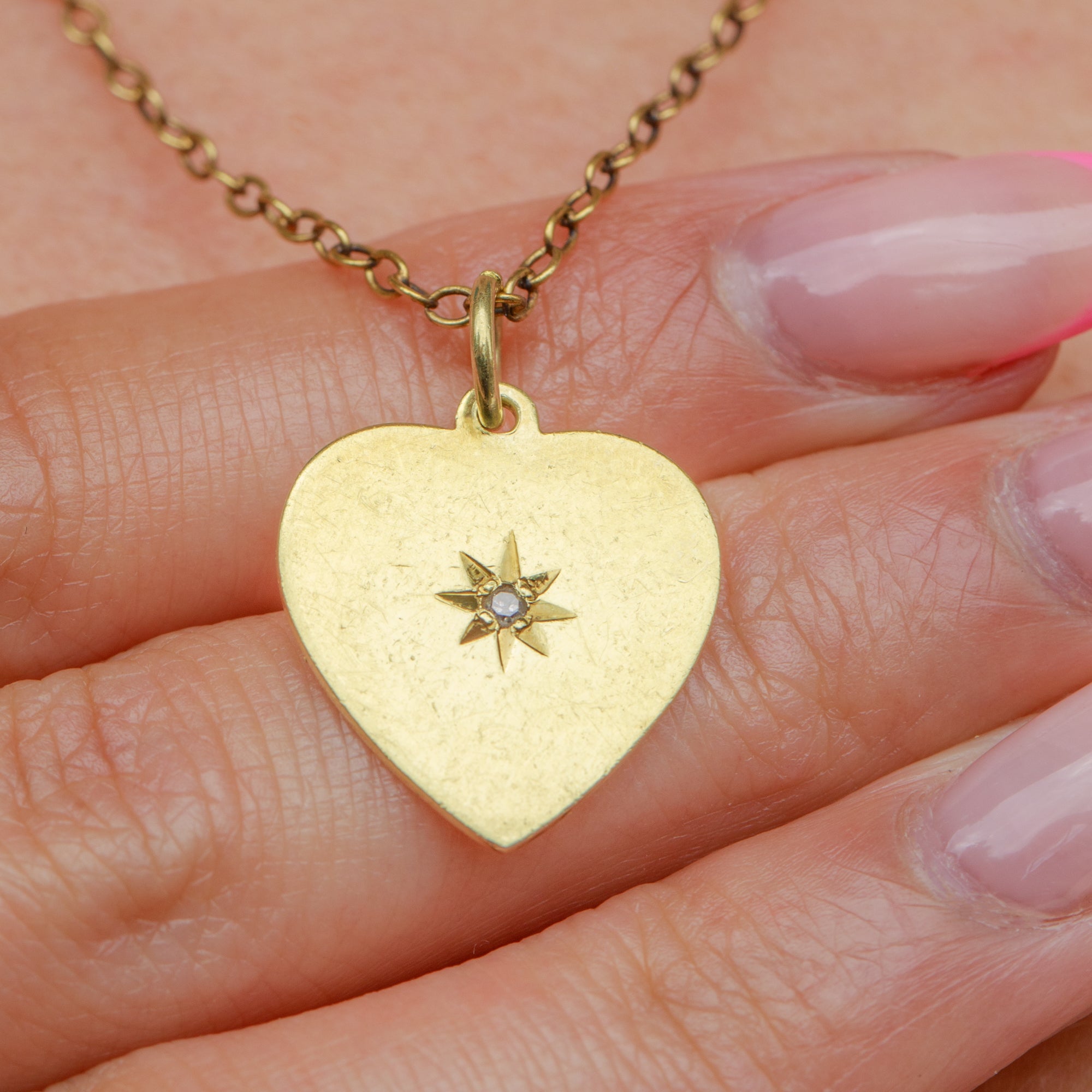 The perfect piece to add a touch of elegance and romance to your décolletage, this 9ct Gold heart pendant displays a scintillating rose-cut Diamond in her centre, set within a bold star setting.