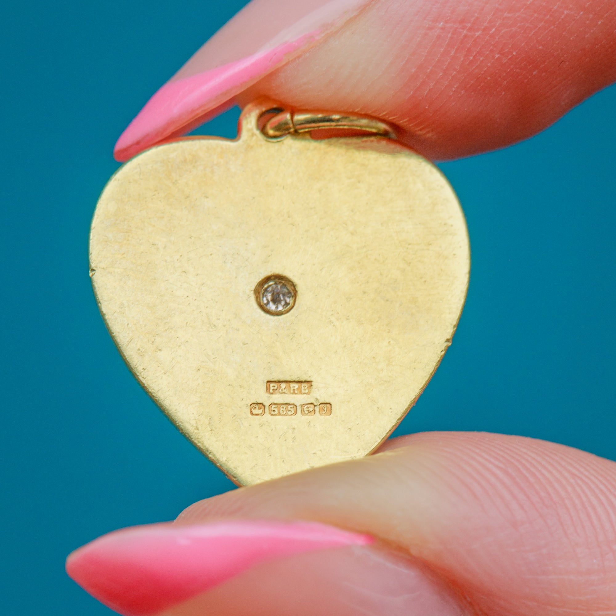 VERY GOOD-EXCELLENT: This 9ct Gold Diamond heart pendant is in great condition. The Diamond is bright and securely set. There are some signs of wear to the Gold, including surface scratches, though this is difficult to spot without a jeweller's loupe. With a secure jump ring, you can wear this vintage Gold heart pendant with confidence!
