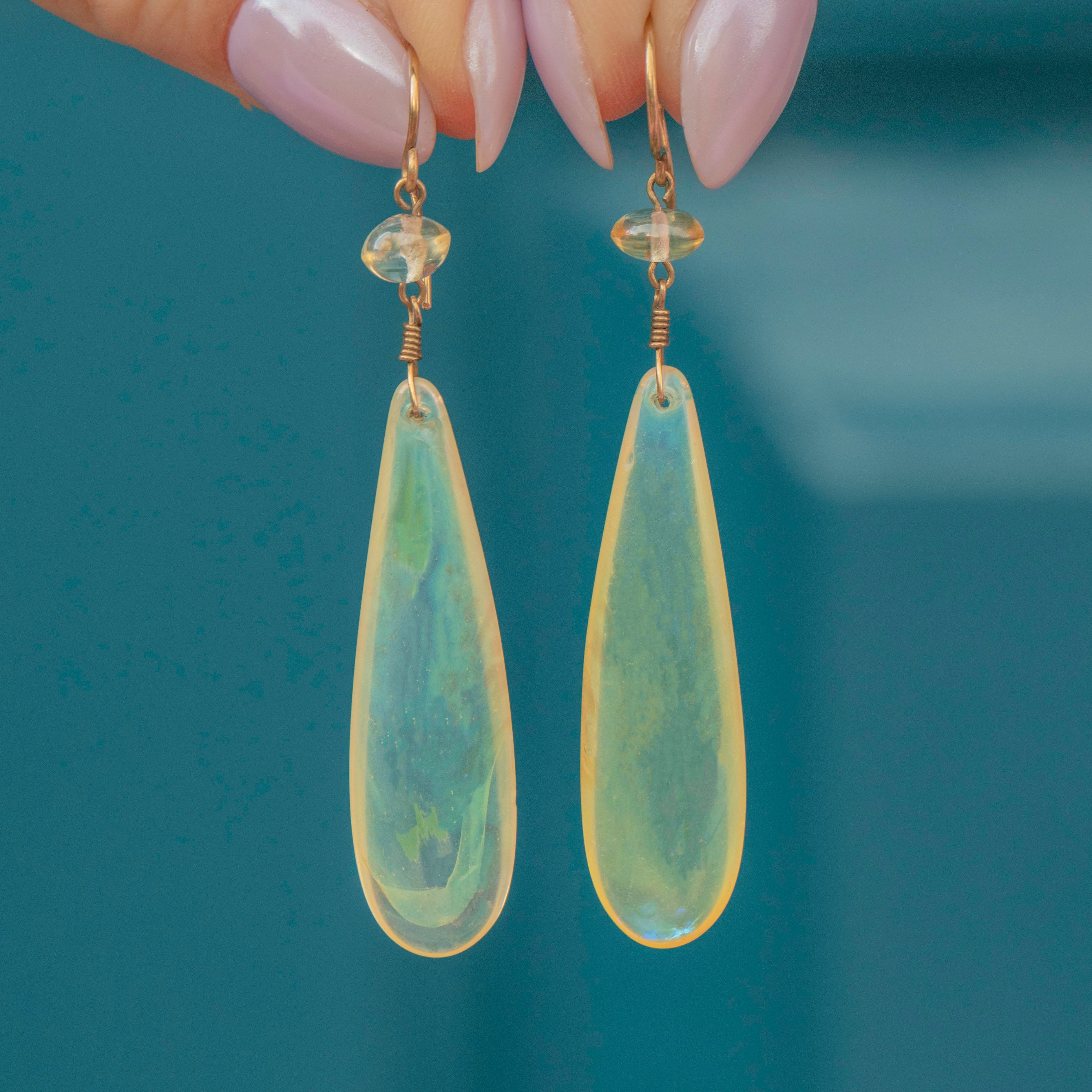 VERY GOOD. These 9ct Gold Dragon’s Breath drop earrings are in very good condition, with the glass displaying vibrant opalescent hues. There is minor wear on the surface of the glass, which is only visible under close inspection with a jeweller's loupe. The 9ct Gold hooks are hallmarked to the year 1990, with a gorgeous saturated tone, and provide comfortable and confident wear