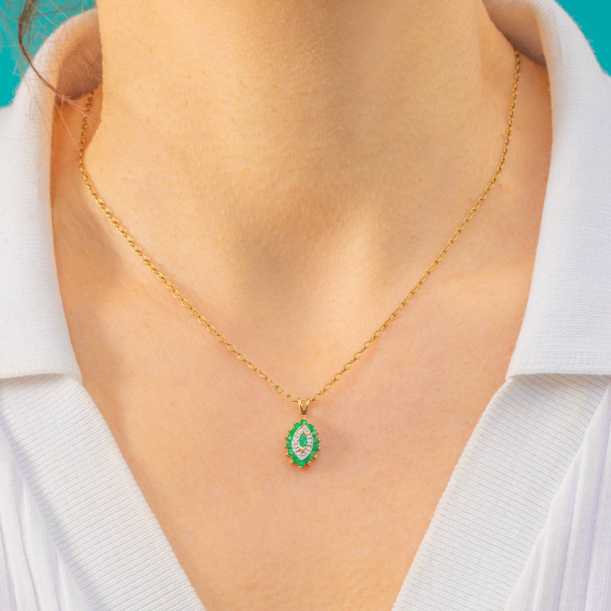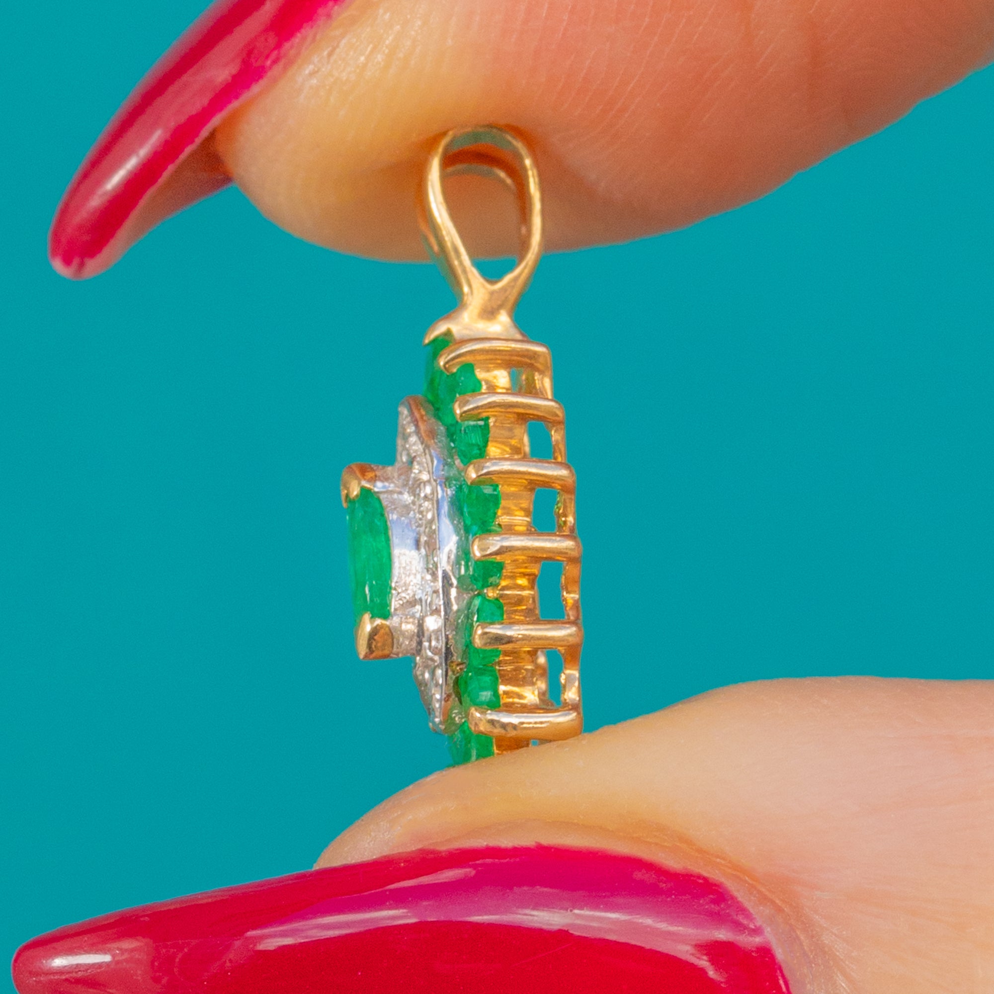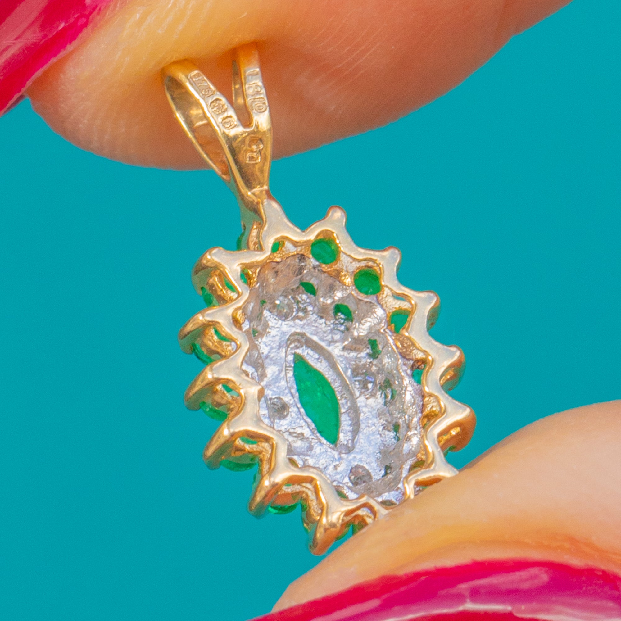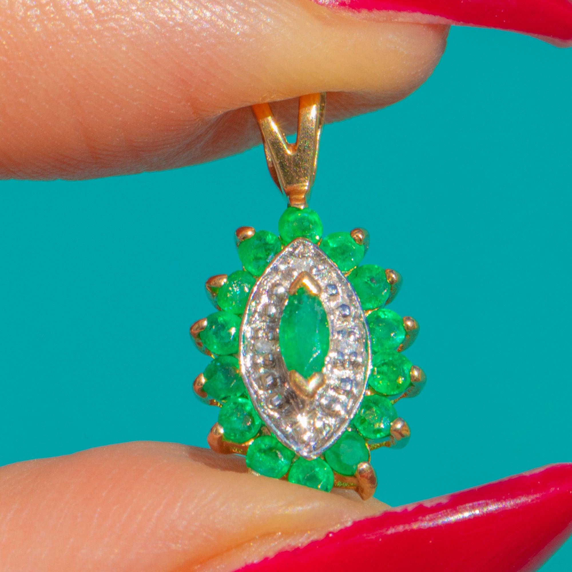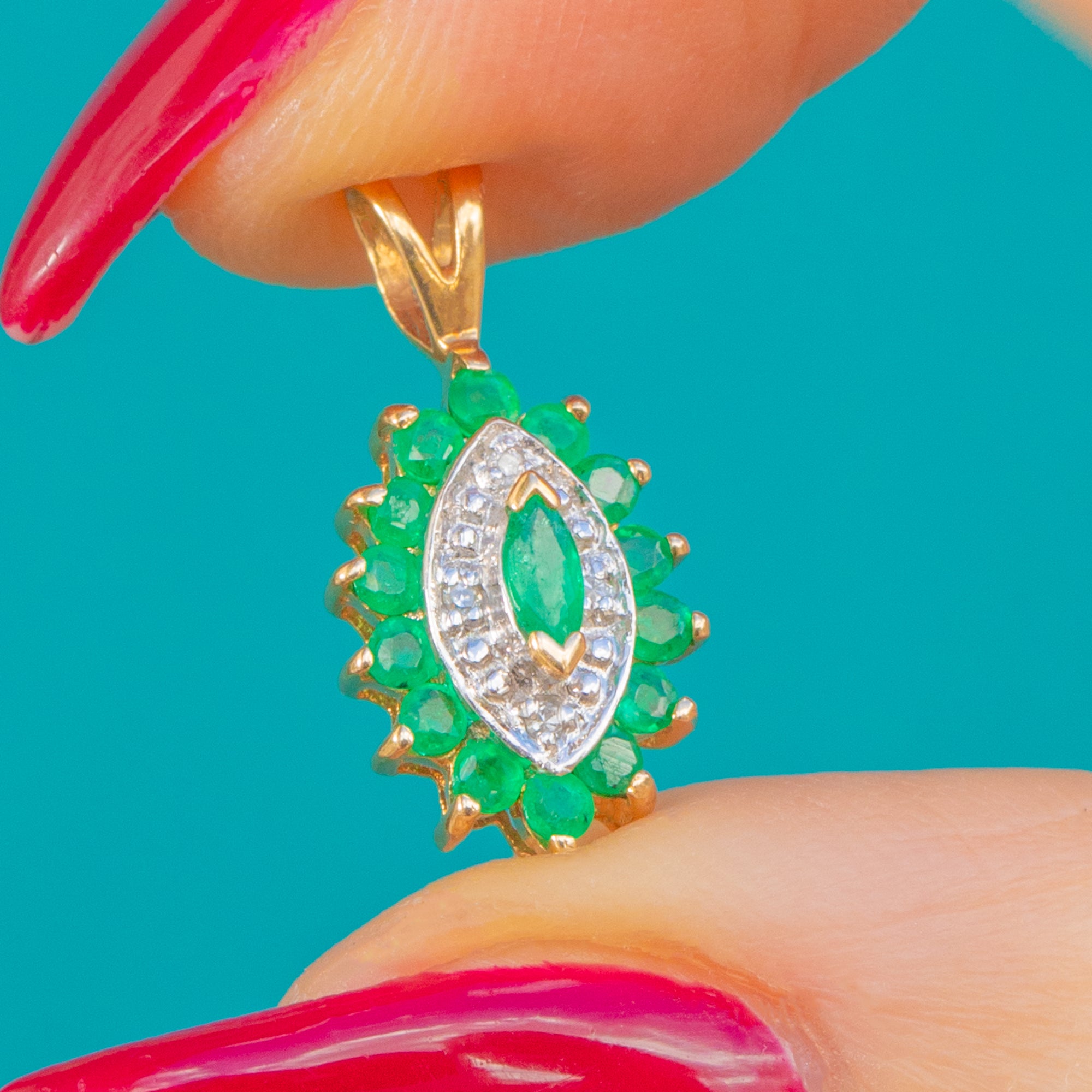 A petite burst of vivid green and sparkle, this Vintage 9ct Gold navette cluster pendant is a joy to behold. Lush Natural Emeralds form a bright halo around a scintillating cluster of petite Diamonds, all arranged in a classic marquise silhouette that flatters and elongates. Crafted in two-tone 9ct Gold, the contrast of white and yellow tones beautifully amplifies the gemstones’ colour and fire.
