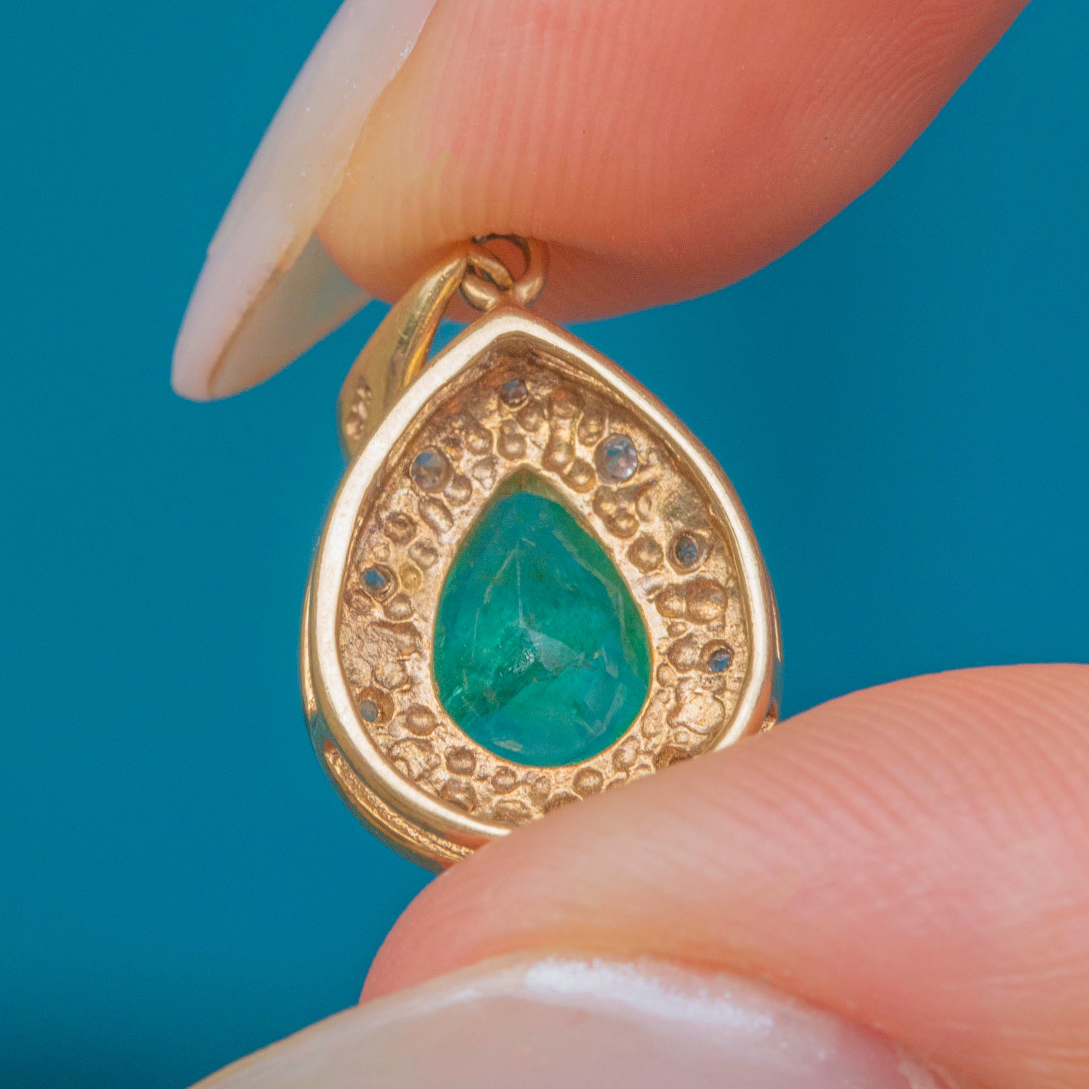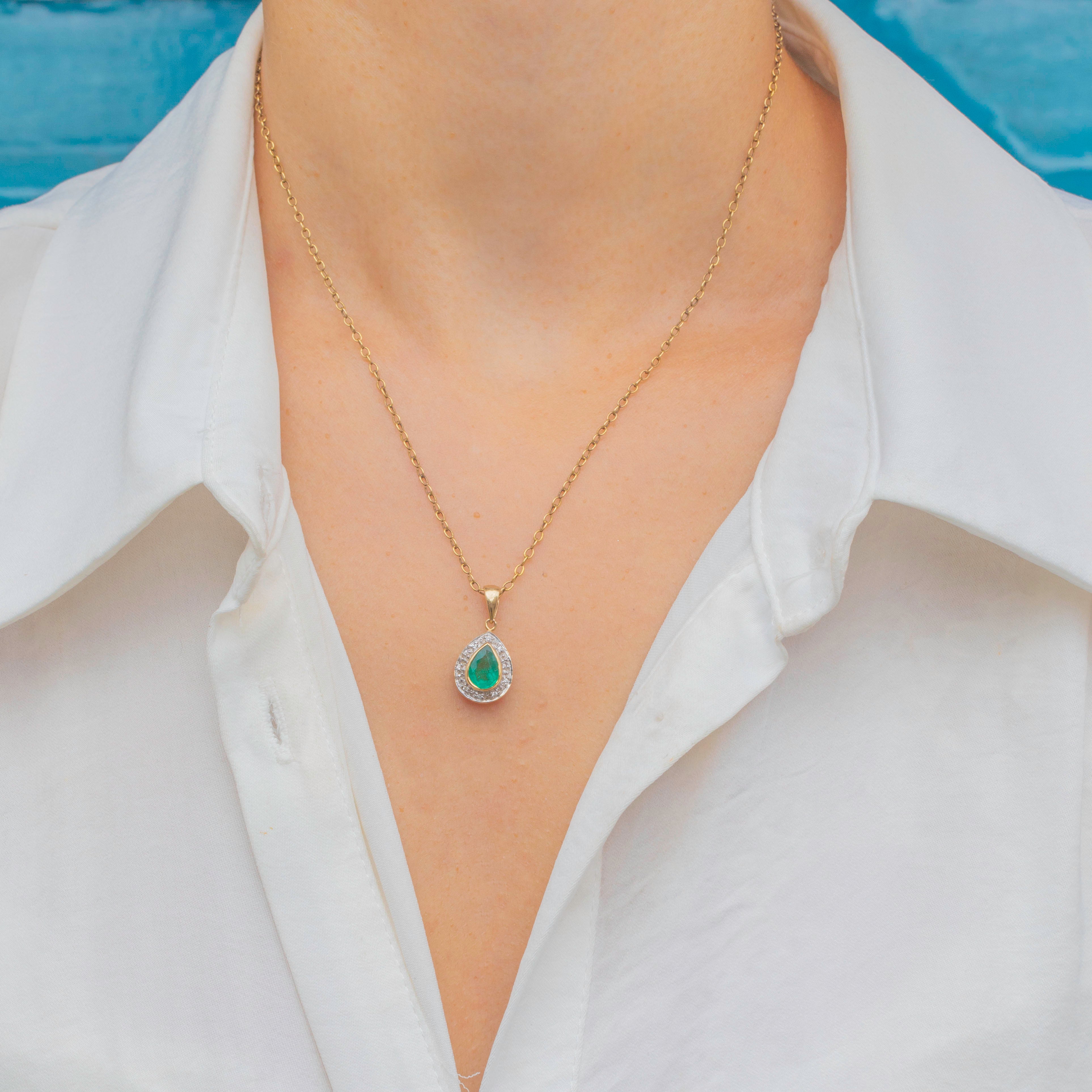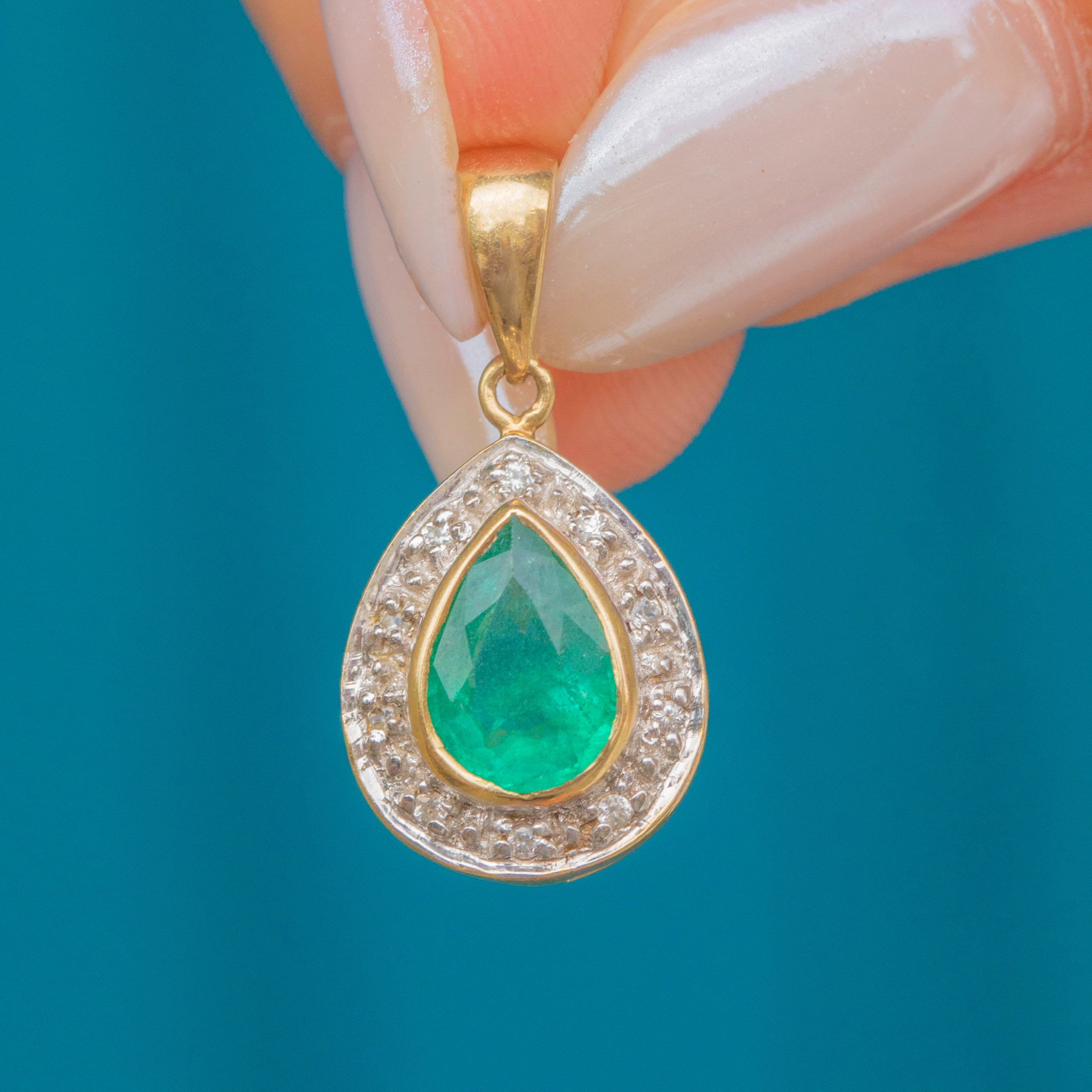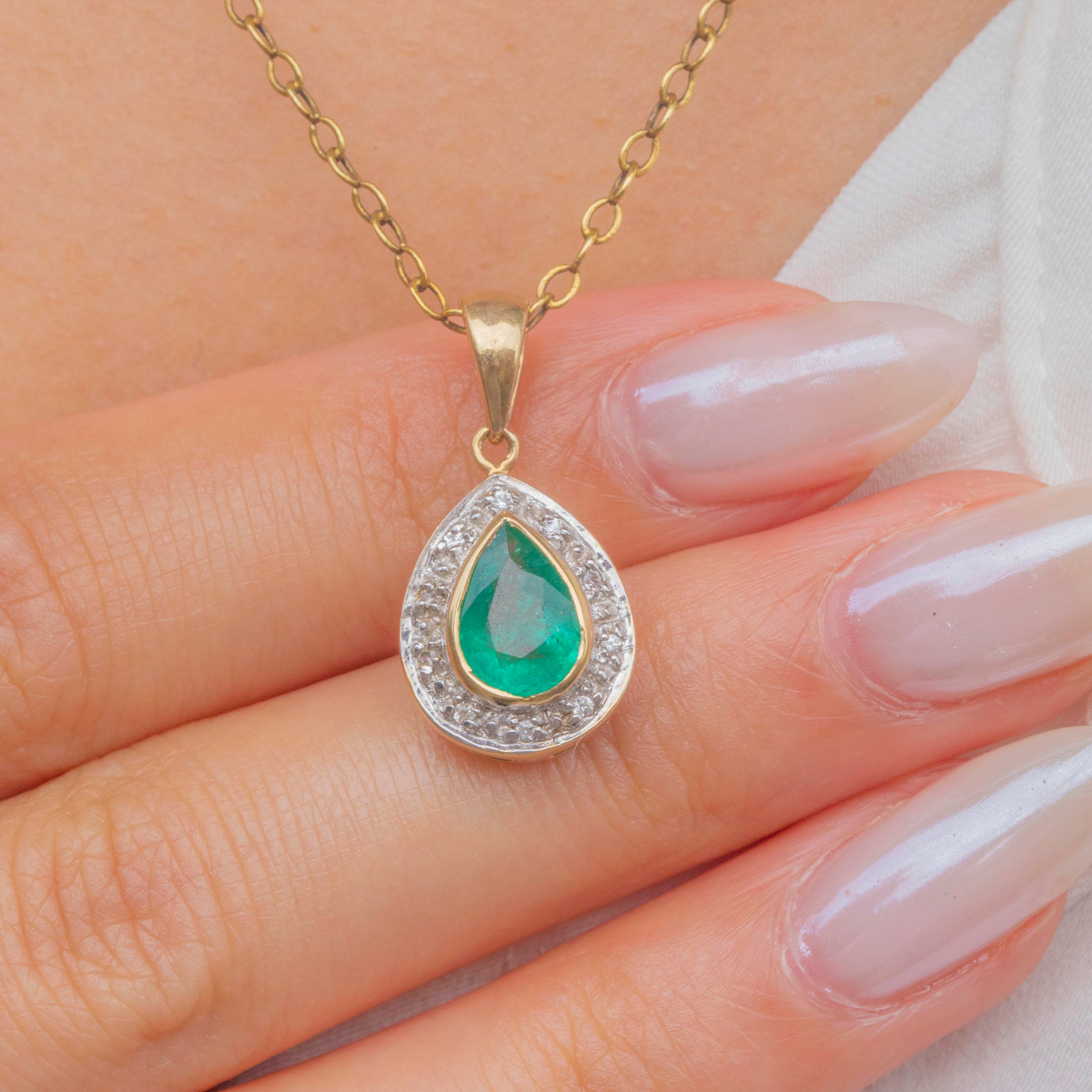Add a touch of elegance to your collection with this vintage pendant, boasting a vibrant 0.60ct pear-cut Emerald accented by a halo of twinkling Diamonds, set in buttery 9ct Gold.
