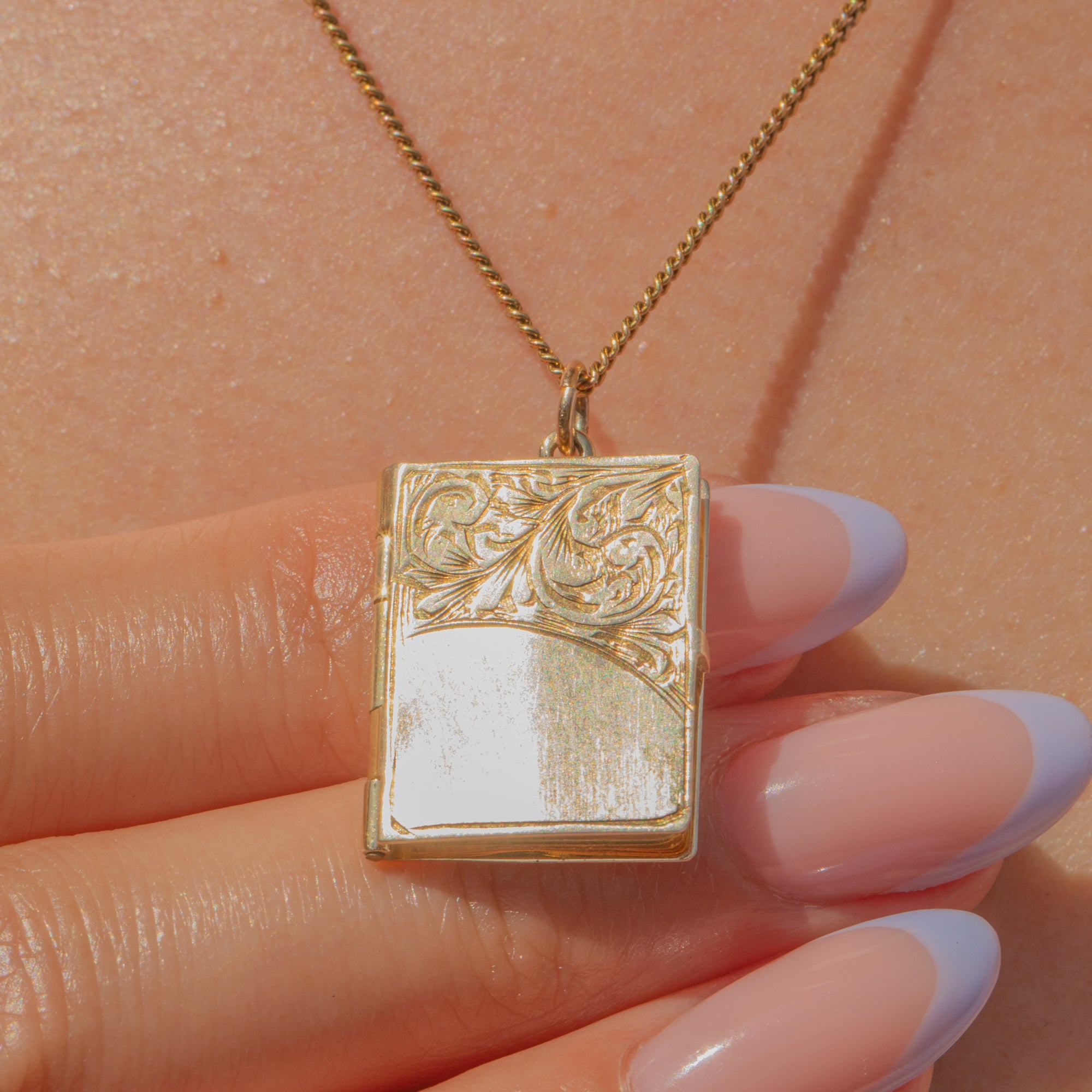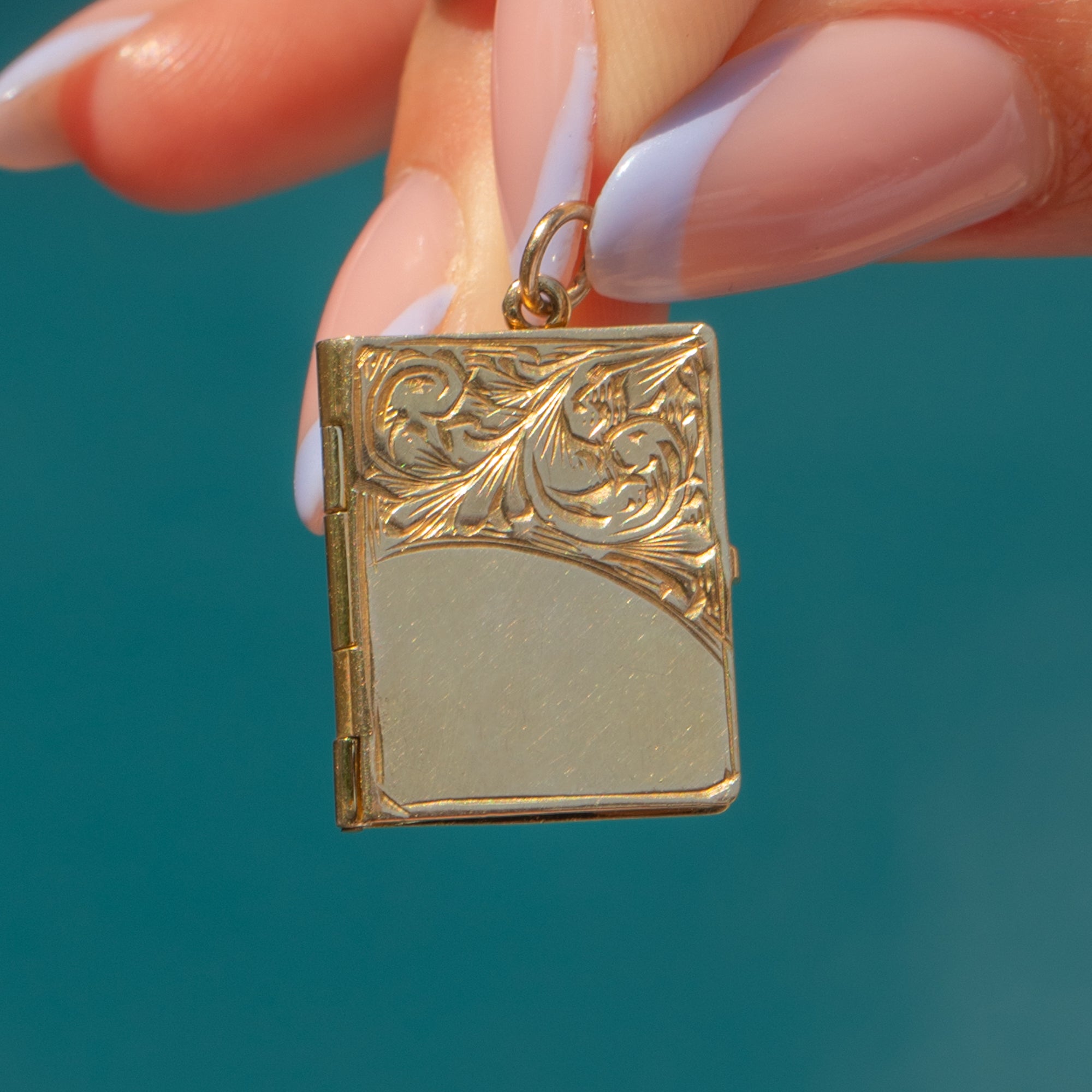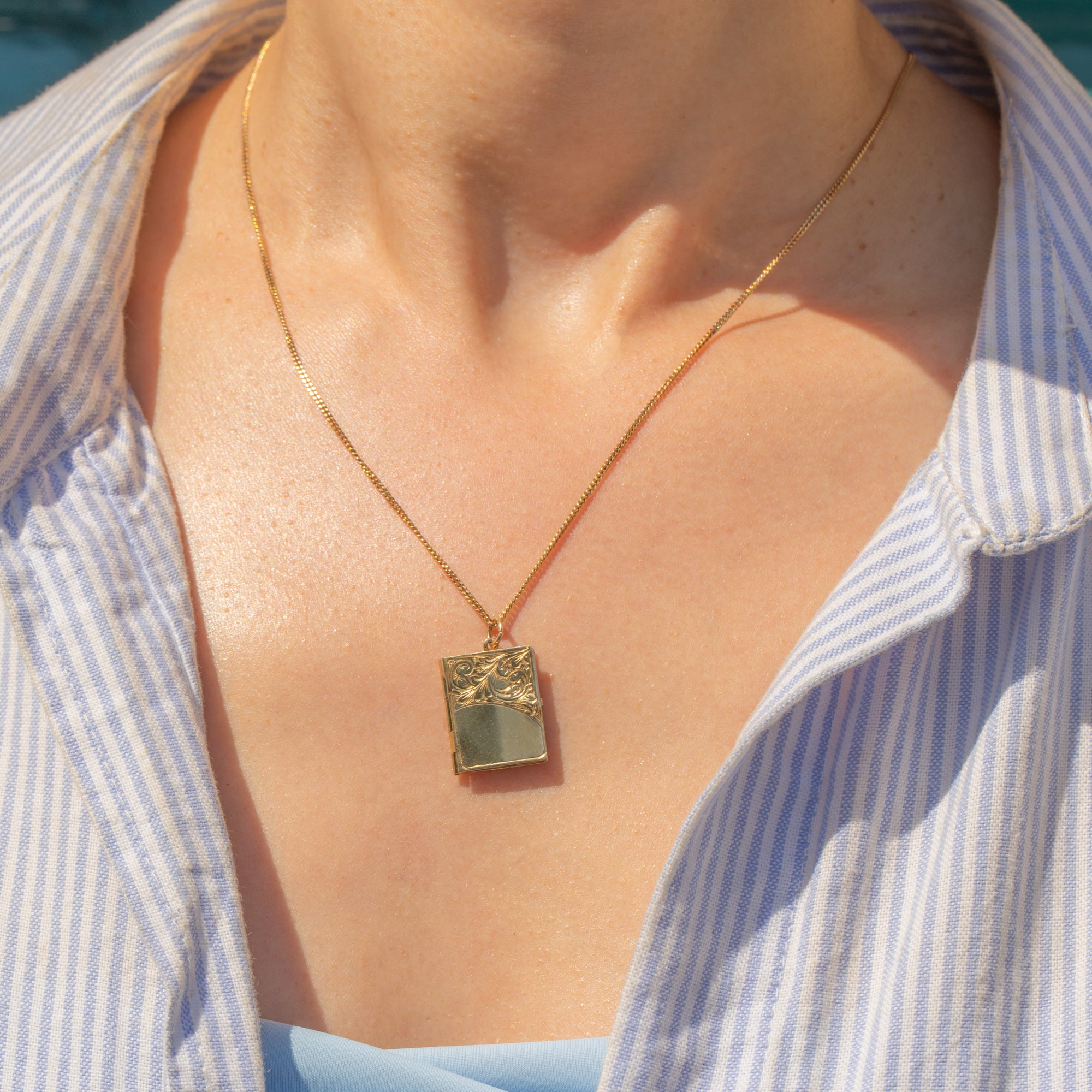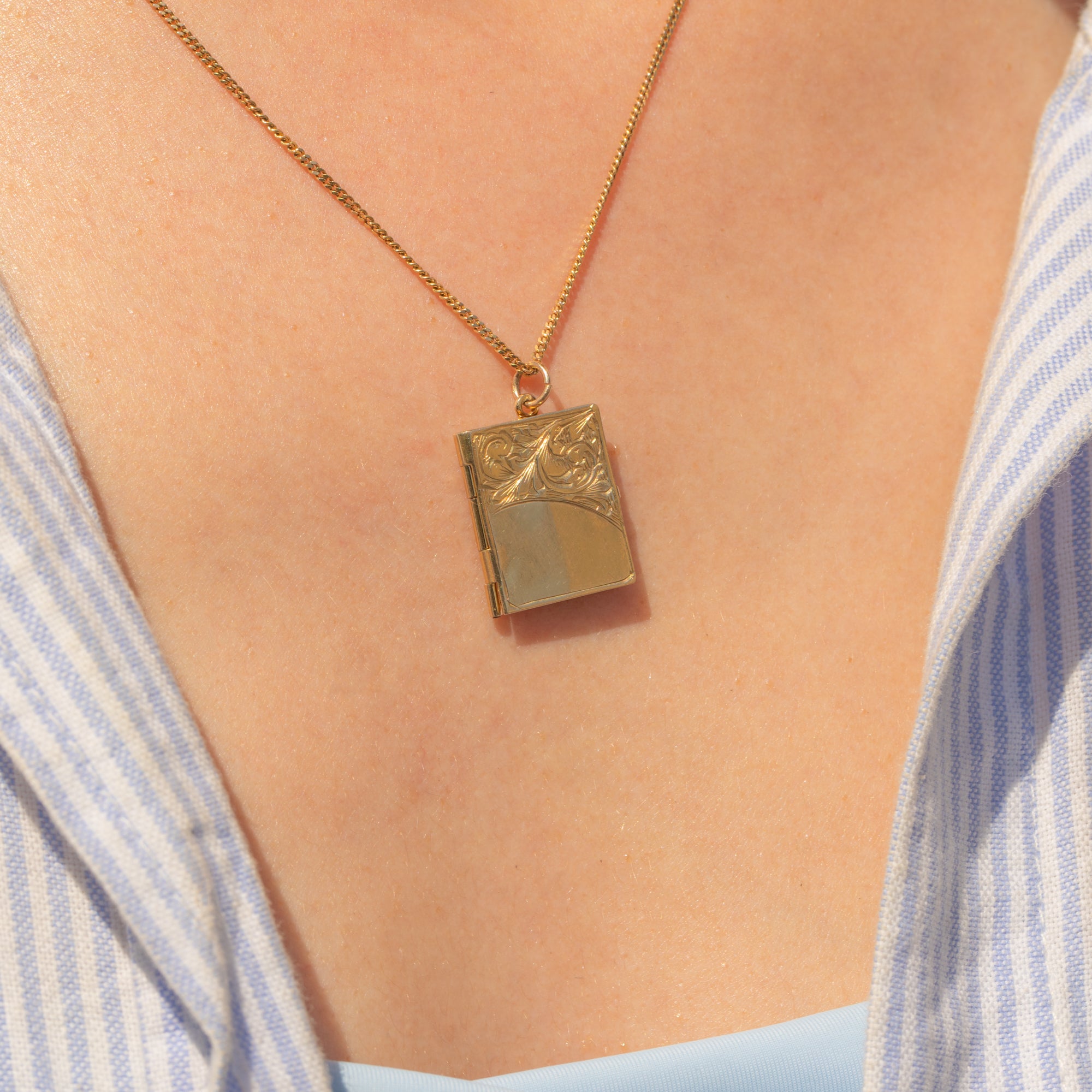 This 9ct Gold engraved book locket will make the perfect abode for your most cherished memories! Crafted from solid 9ct Gold, this vintage book locket is adorned with intricately engraved details sweeping across a blank cartouche to which you could add a personal engraving if you wish.