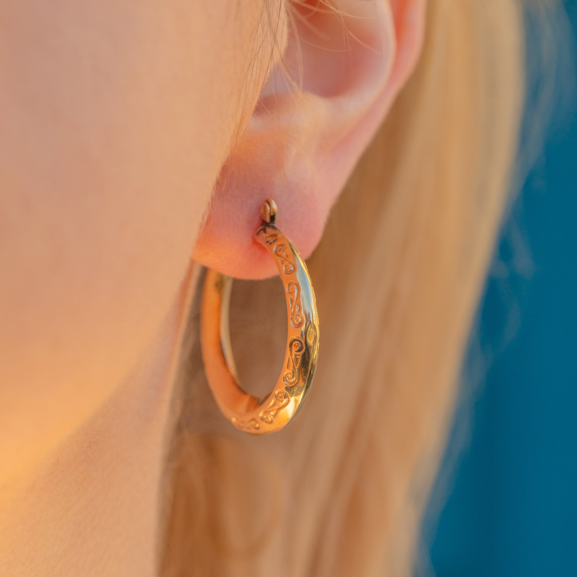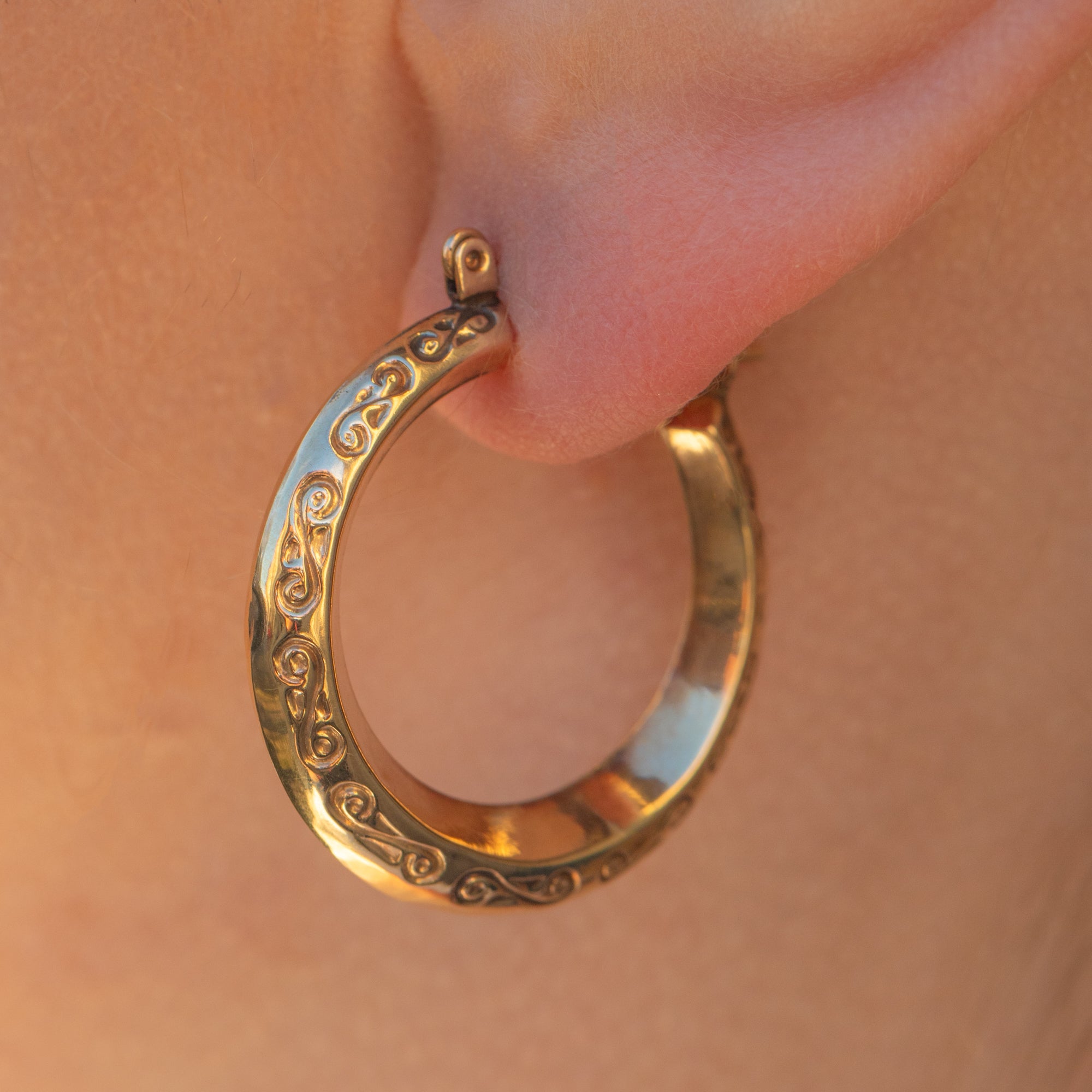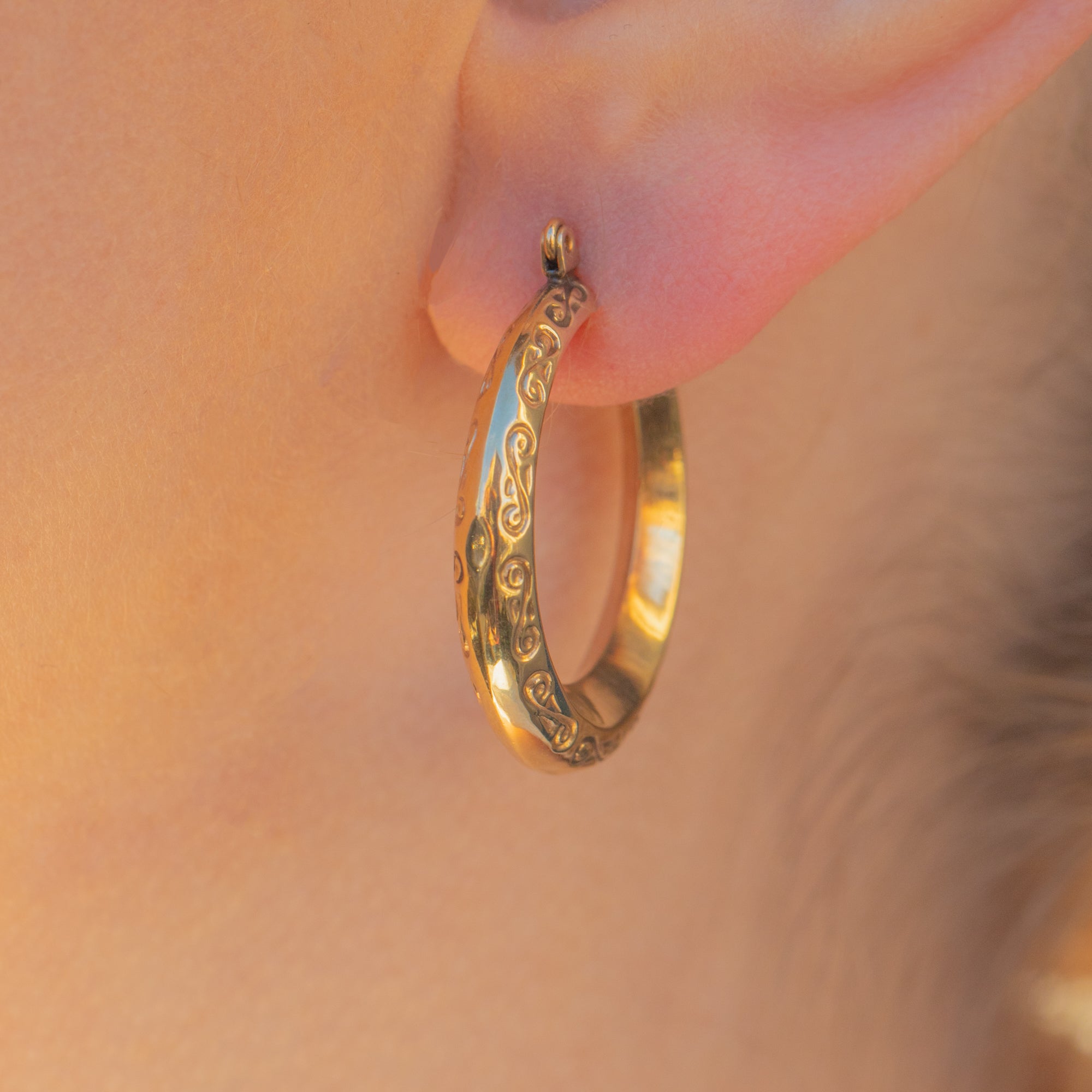 A staple pair of 9ct Gold engraved hoop earrings to add to your jewellery box. Perfect for everyday wear, these hoops have sweet wispy engravings on them on both sides so they're symmetrical.