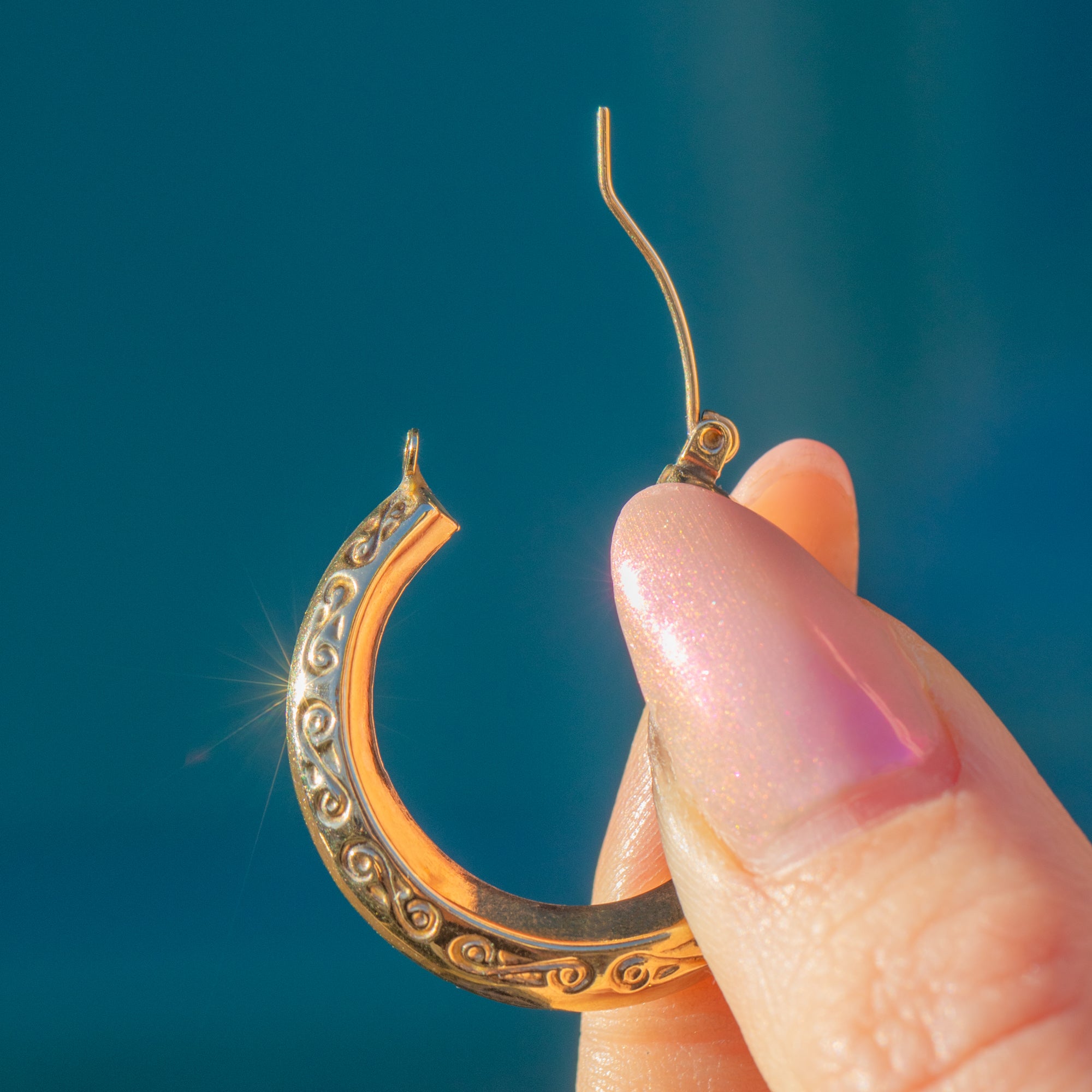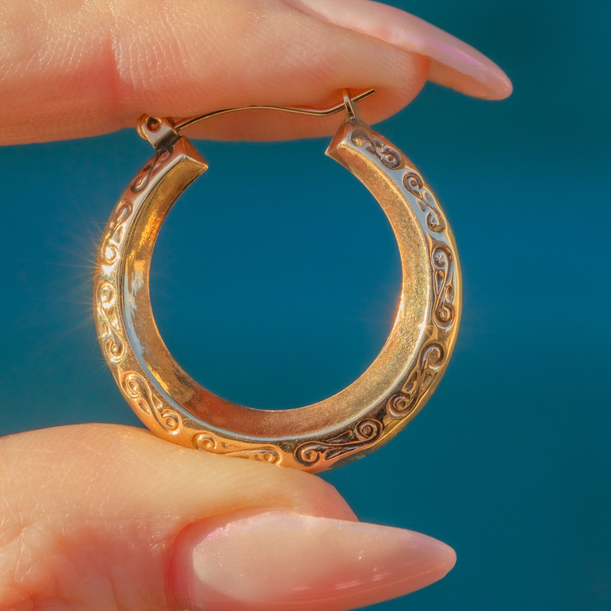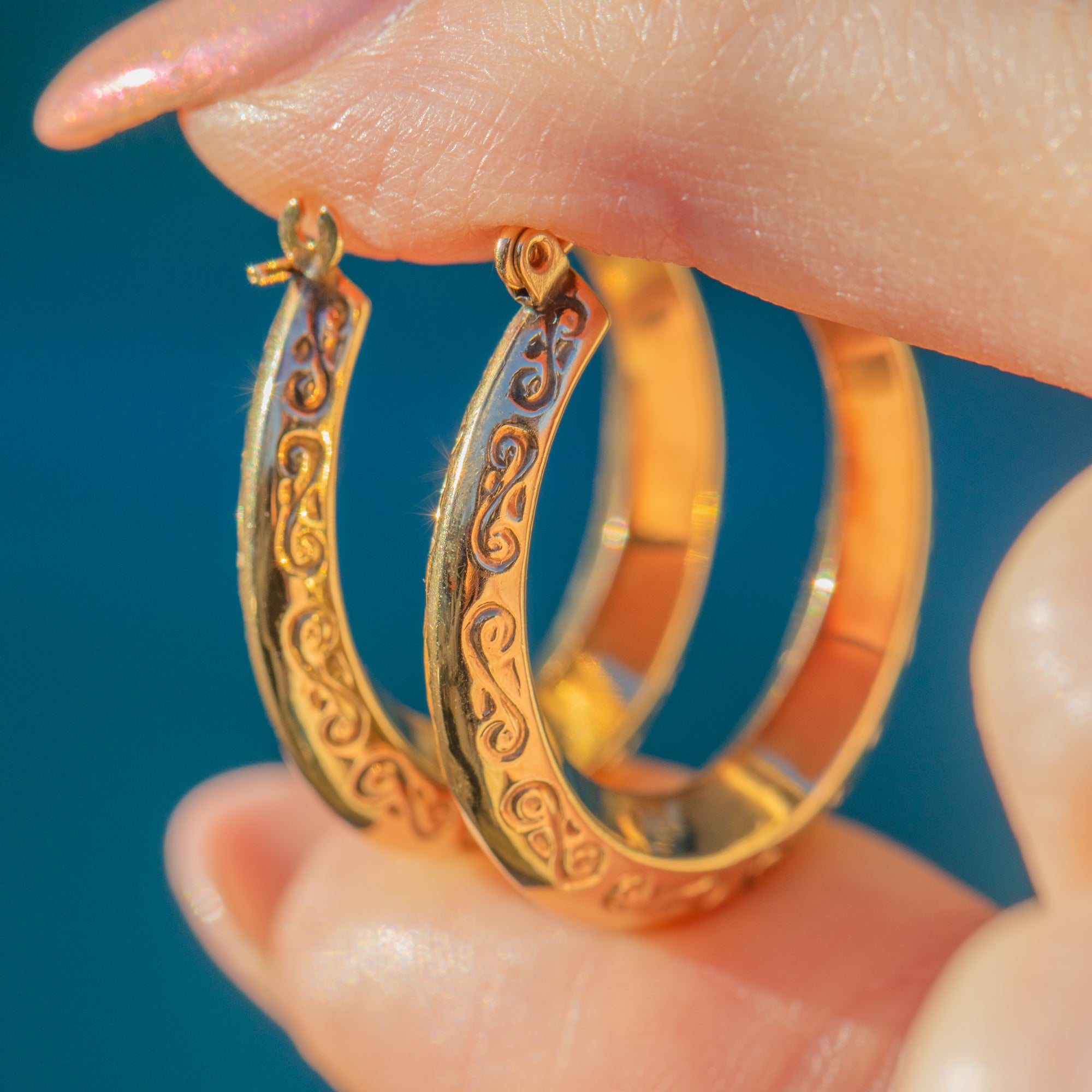 A staple pair of 9ct Gold engraved hoop earrings to add to your jewellery box. Perfect for everyday wear, these hoops have sweet wispy engravings on them on both sides so they're symmetrical.