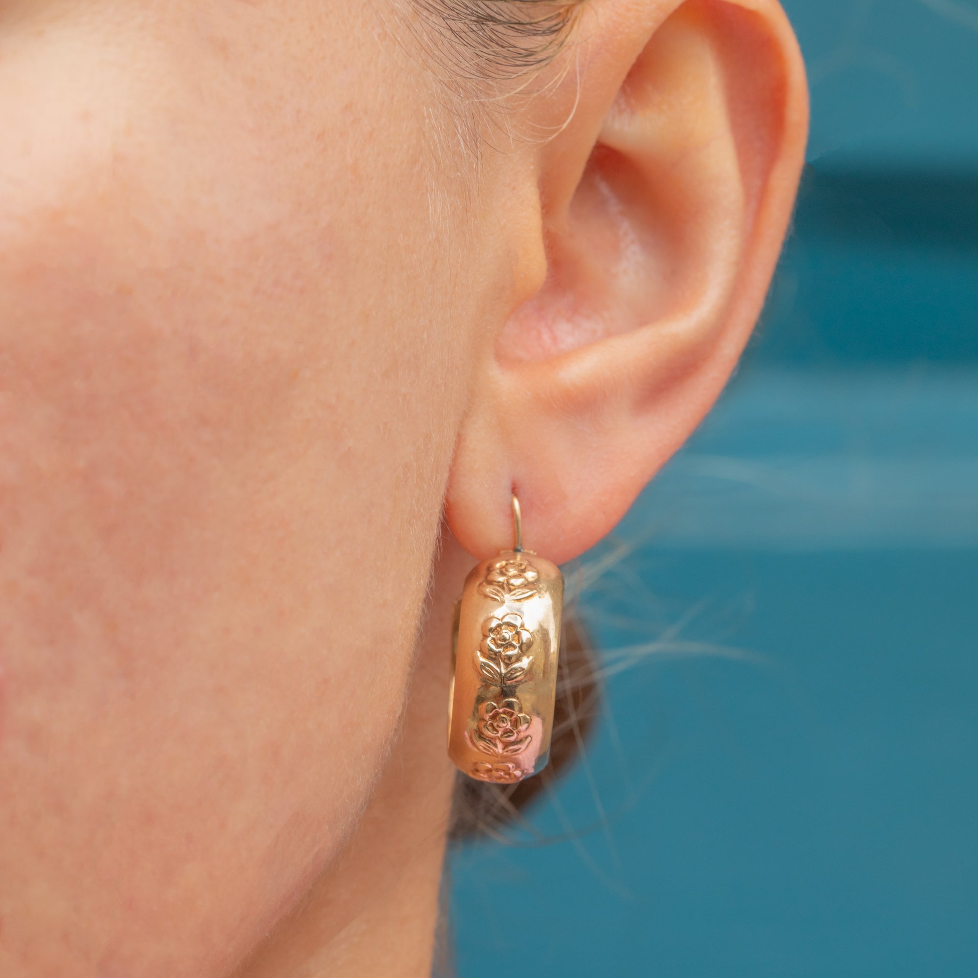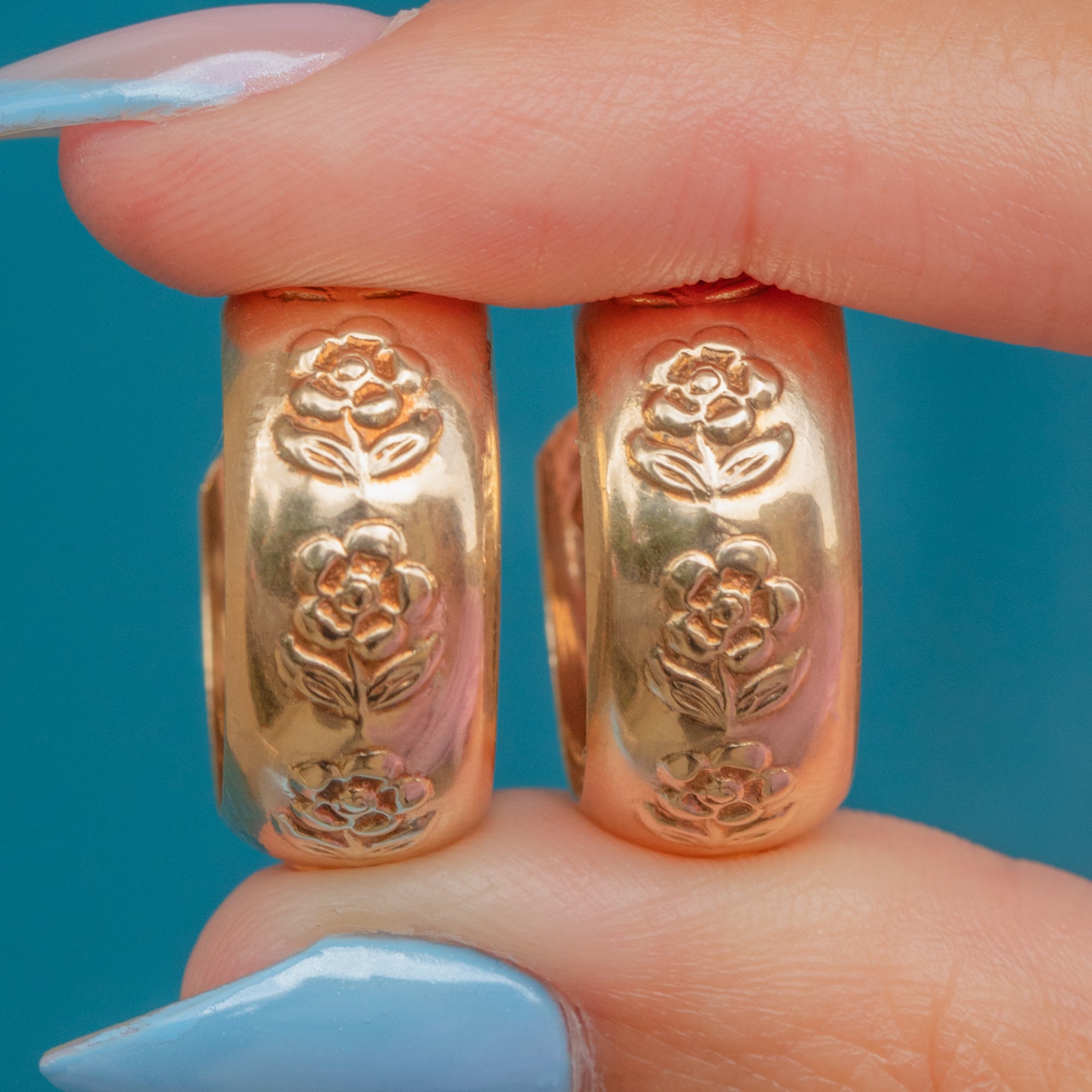 The sweetest pair of vintage Gold hoop earrings! These chubby Gold hoops have repoussé forget-me-not detailing running through their centre, giving them a unique edge that makes them stand out from the rest.