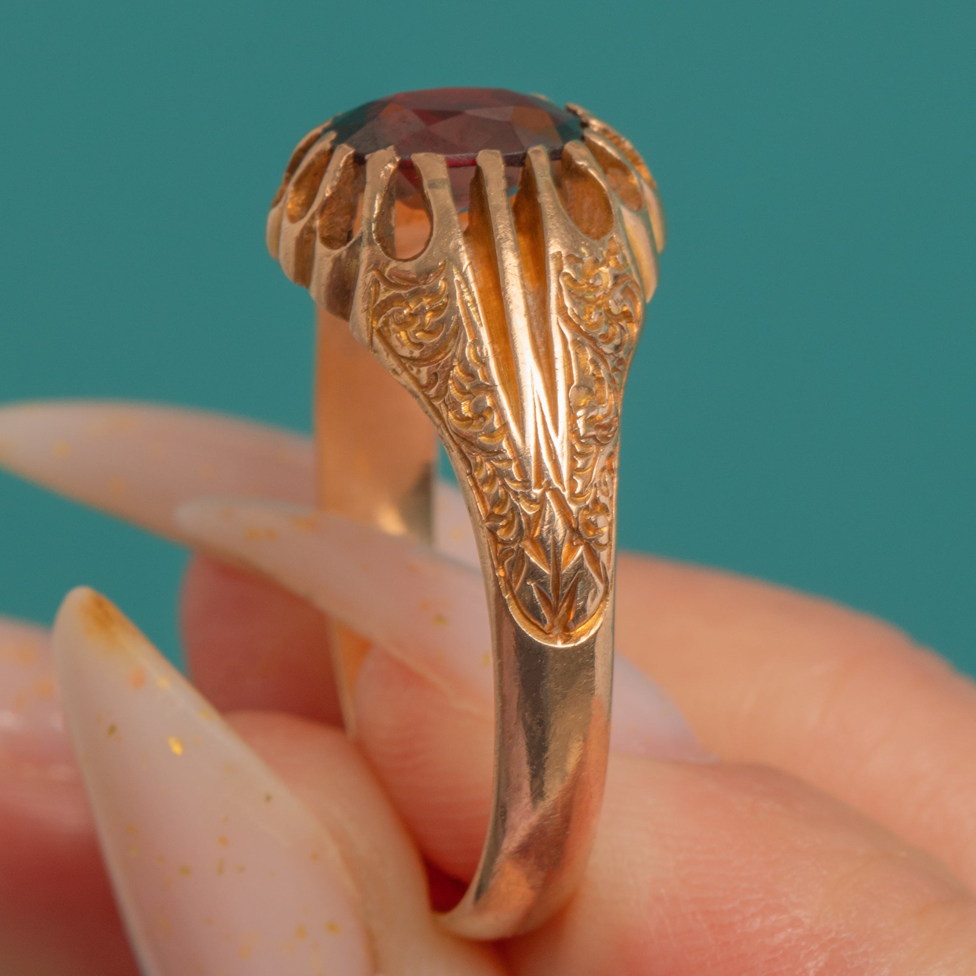 EXCELLENT: The Garnet is bright with only minor facet/rub wear visible under close inspection and no chips or cracks. The buttercup setting, engraved shoulders and shank are crisp with light surface wear to the high points; claws are secure and the ring is sturdy and in round. No evidence of resizing or repairs observed.
