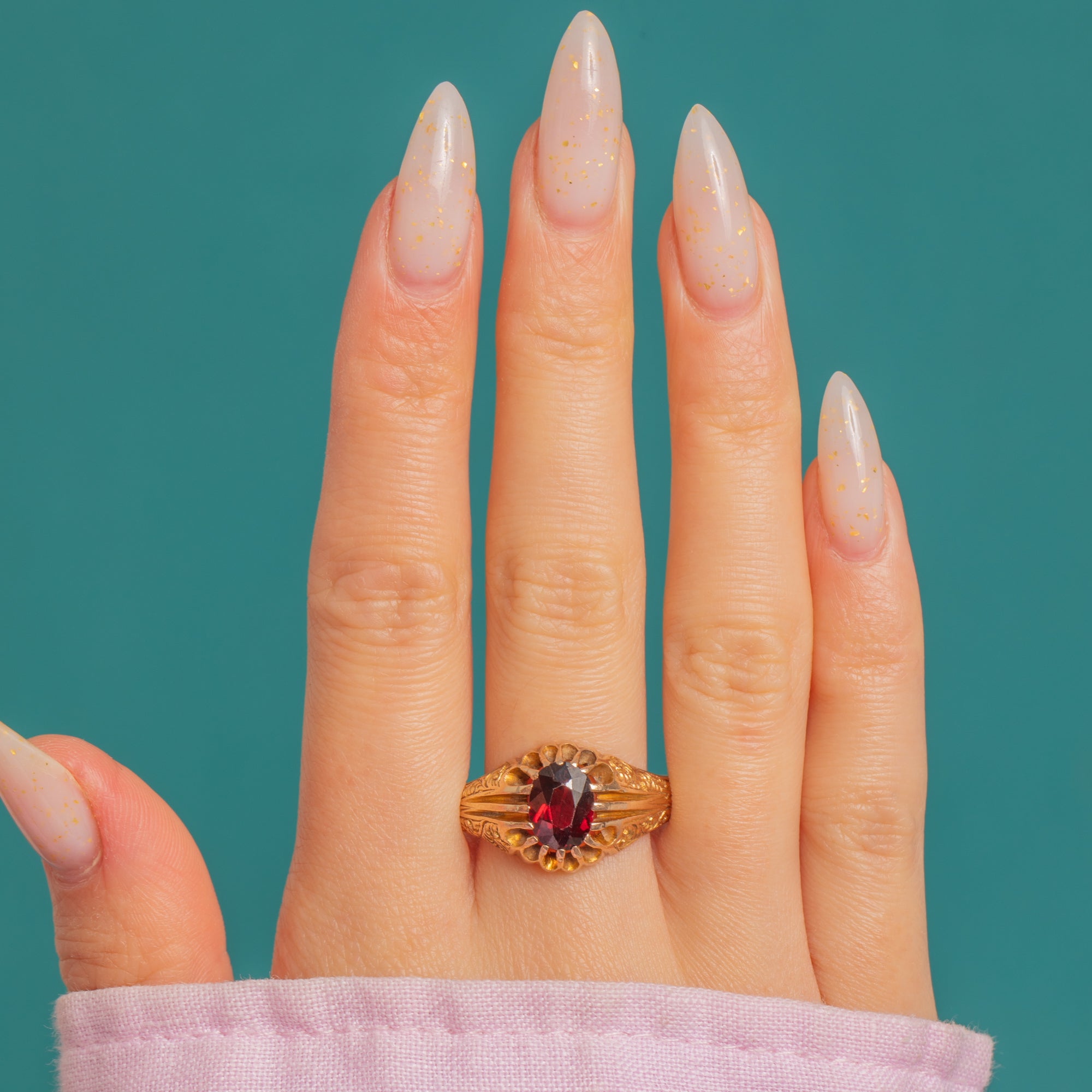A romantic buttercup ring in warm 9ct Gold, set with a deep wine-red oval Garnet that glows beautifully against its scalloped floral setting. The shoulders are richly adorned with radiating flutes and foliate engraving, flowing into a solid tapering shank for an ornate yet wearable silhouette.
