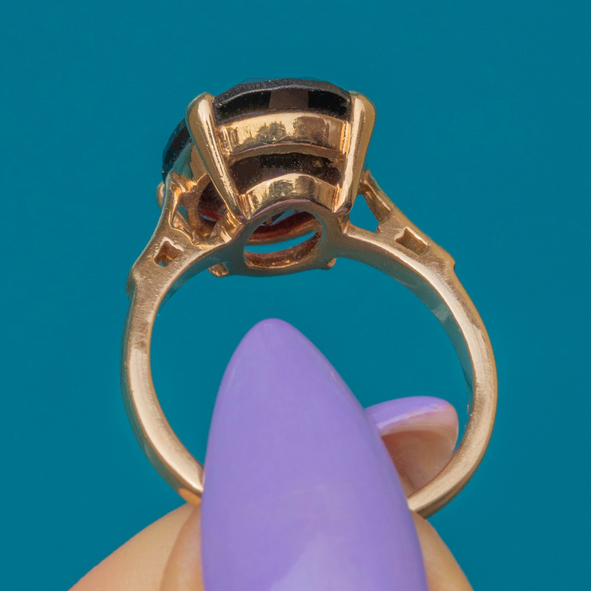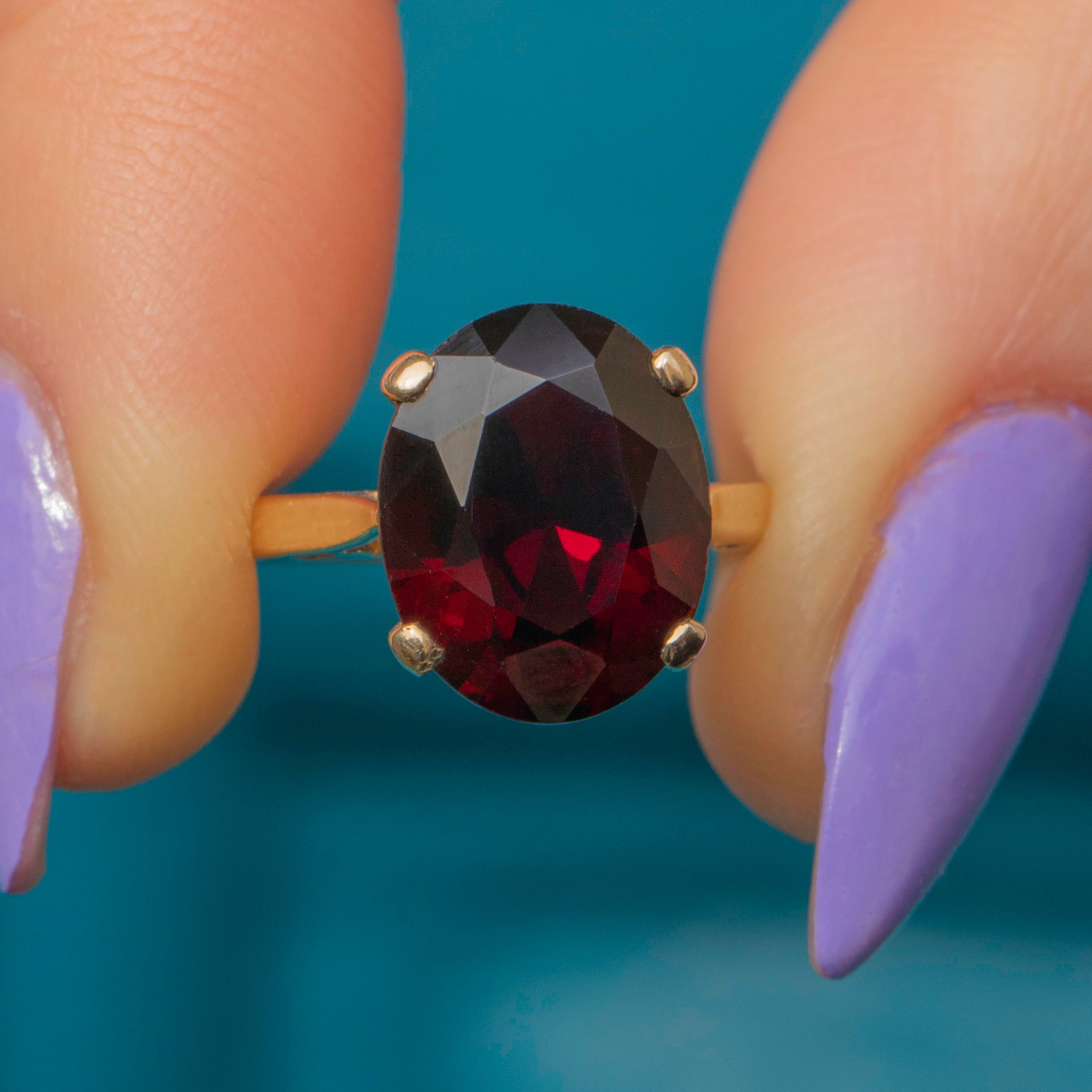 EXCELLENT: The Garnet is in superb condition with crisp facets and no visible chips or abrasions. The Gold band and claws are strong and secure, with only the lightest surface wear consistent with age. A well-preserved Vintage ring, ready to wear and enjoy.