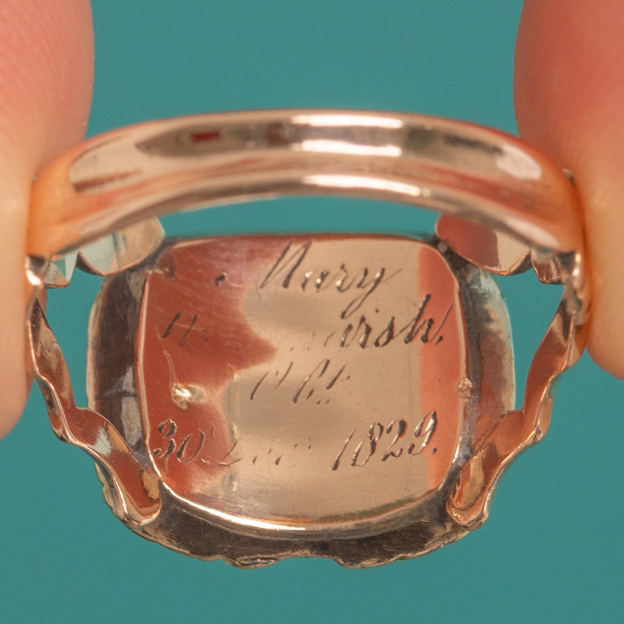 The ring’s closed back setting is engraved in flowing script with a touching memorial inscription, including the date “1829” and the partial wording “Mary H….ish … Ob. 30th … 1829,” lending rare sentiment and history. With its sculptural presence, this is a quintessential Georgian treasure that wears with drama and grace.