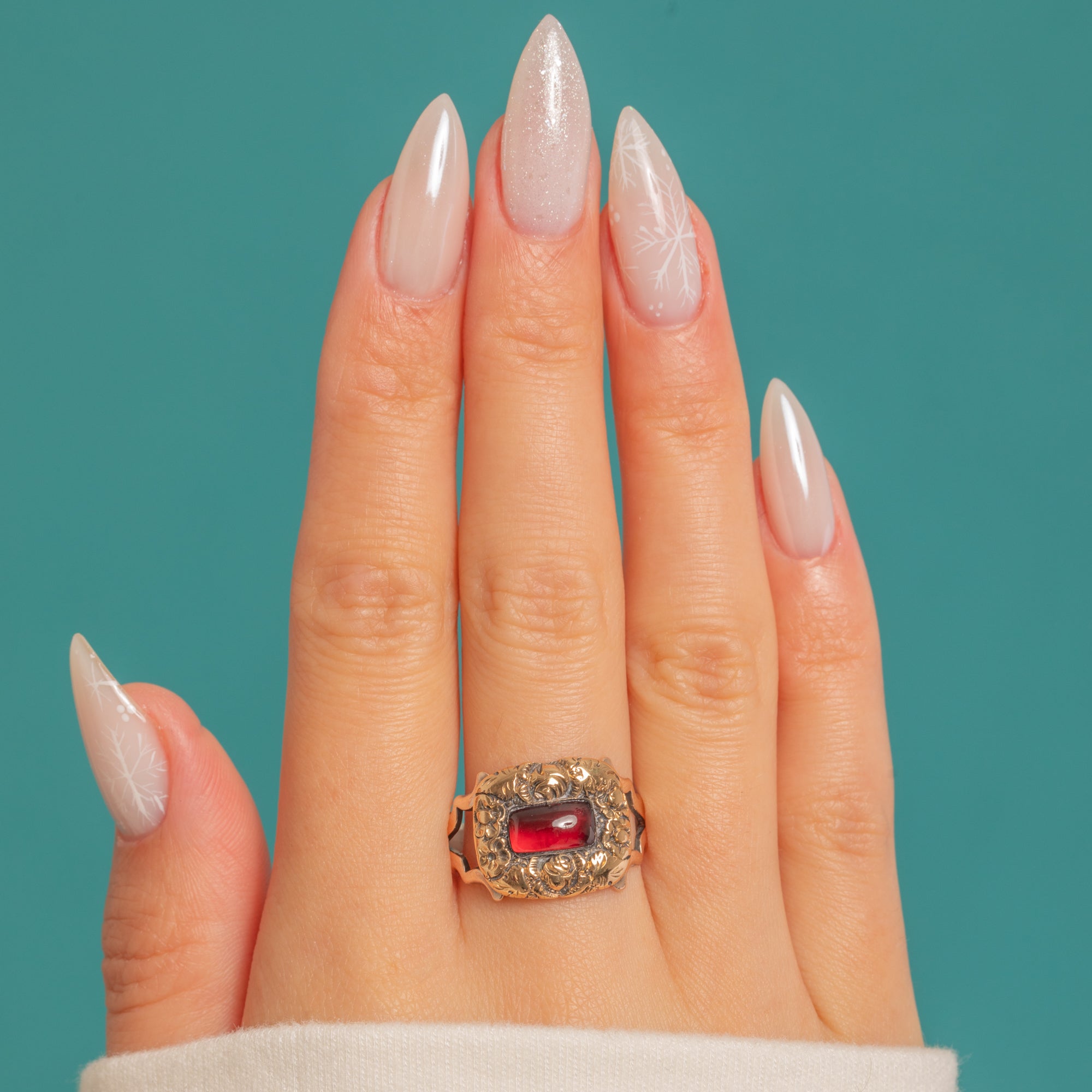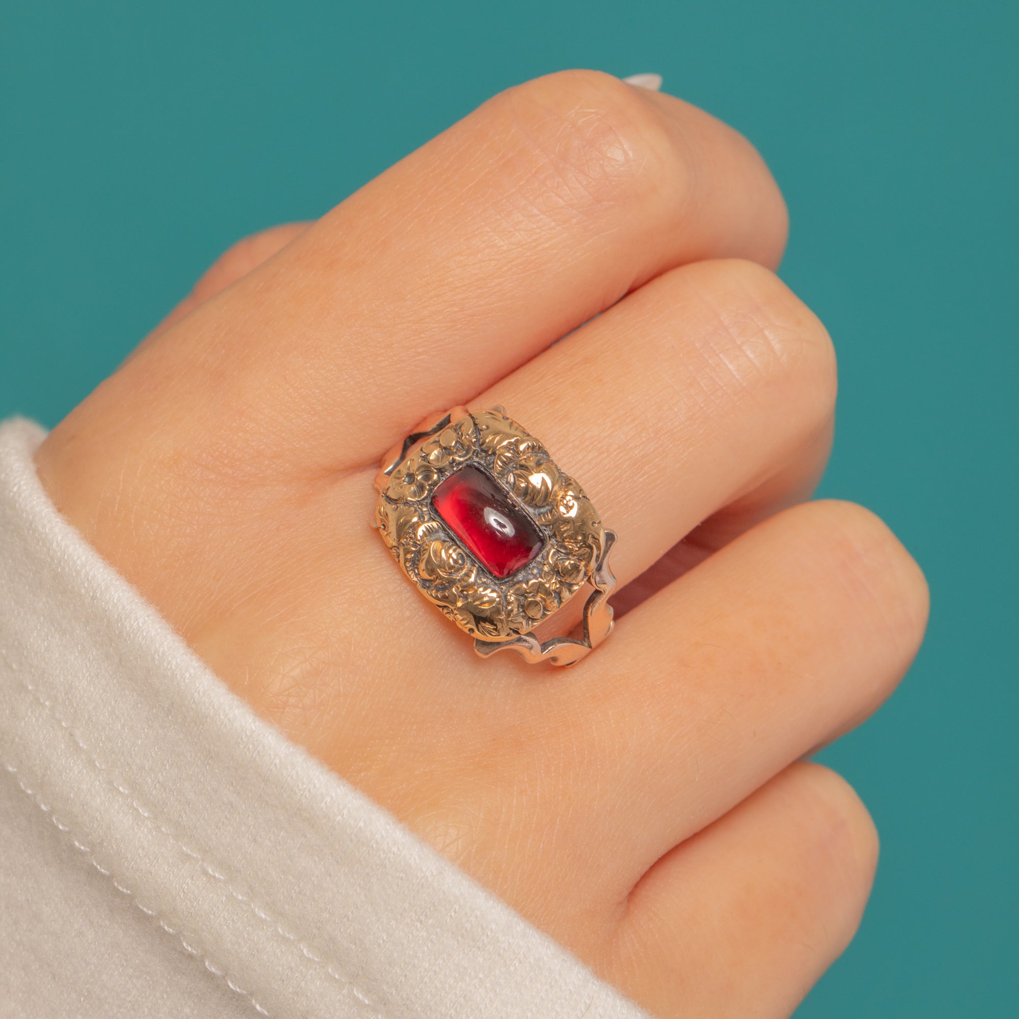 A sumptuous late Georgian plaque ring set with a deep wine-red Garnet cabochon. The high-domed rectangular stone sits proud, framed by richly chased foliate and scrollwork that flows into elegant split shoulders.