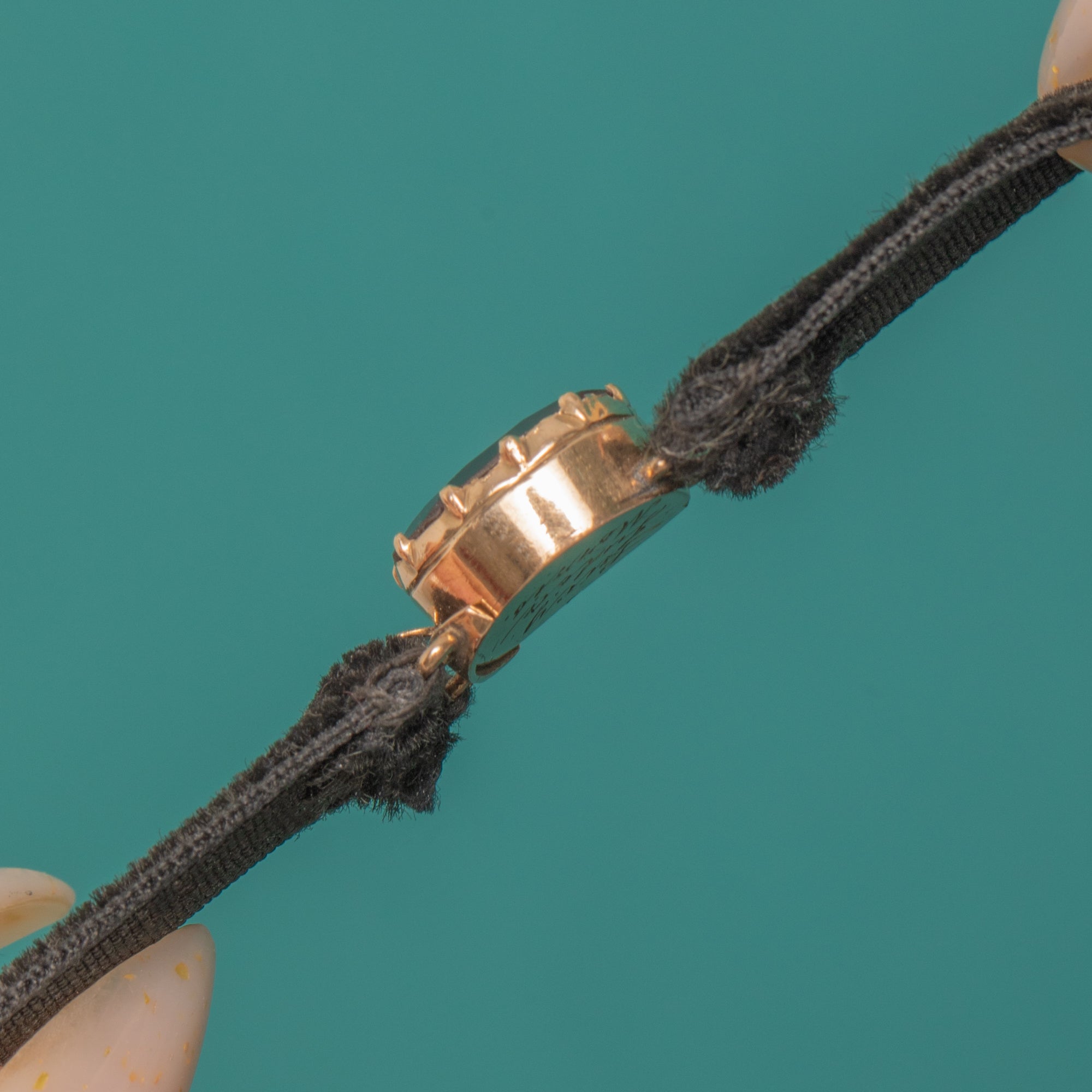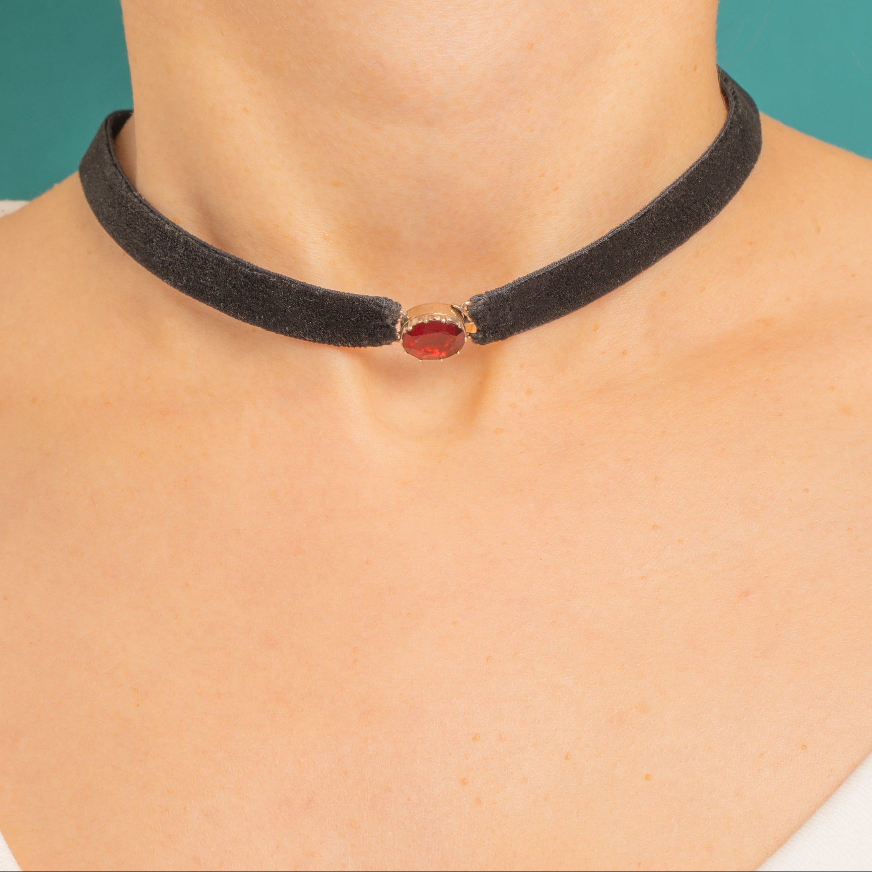 A beautifully simple and evocative Georgian black velvet ribbon choker centred by a deep, wine-red Garnet clasp. The rich hue of the oval faceted Garnet is heightened by its warm 9ct Gold setting, creating an elegant play of colour and light that sits delicately at the throat.