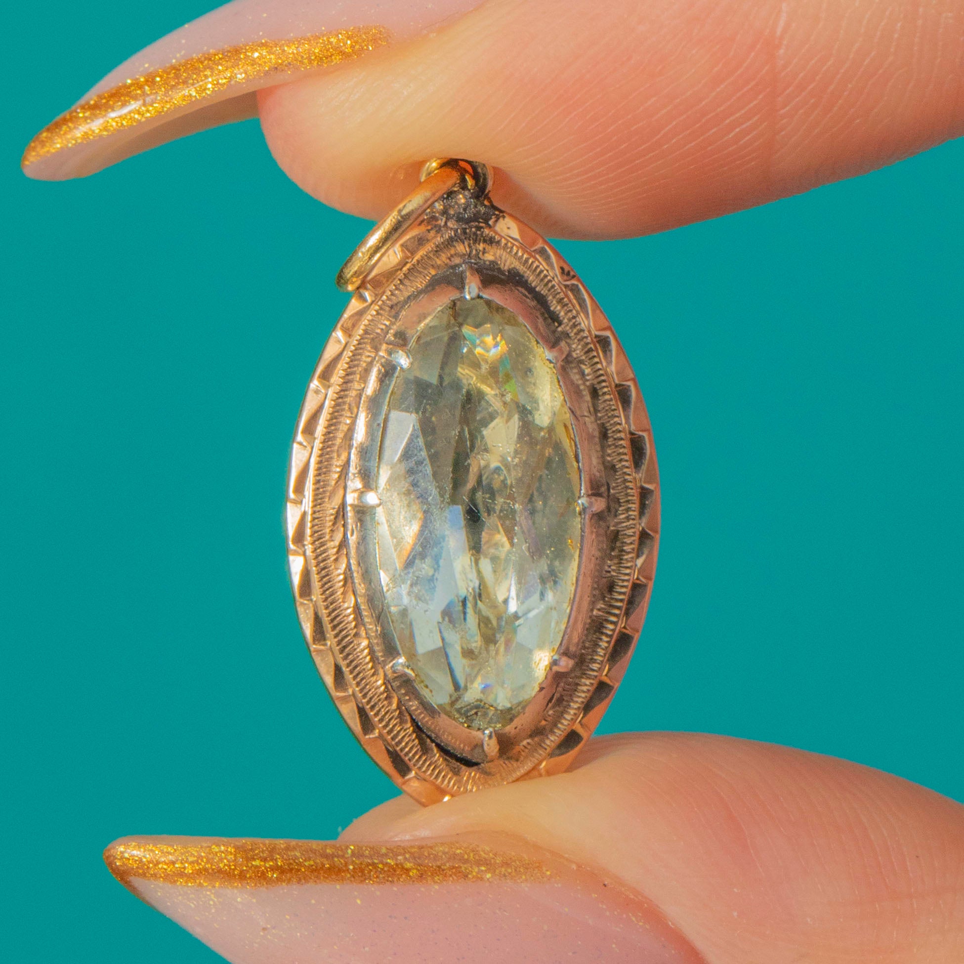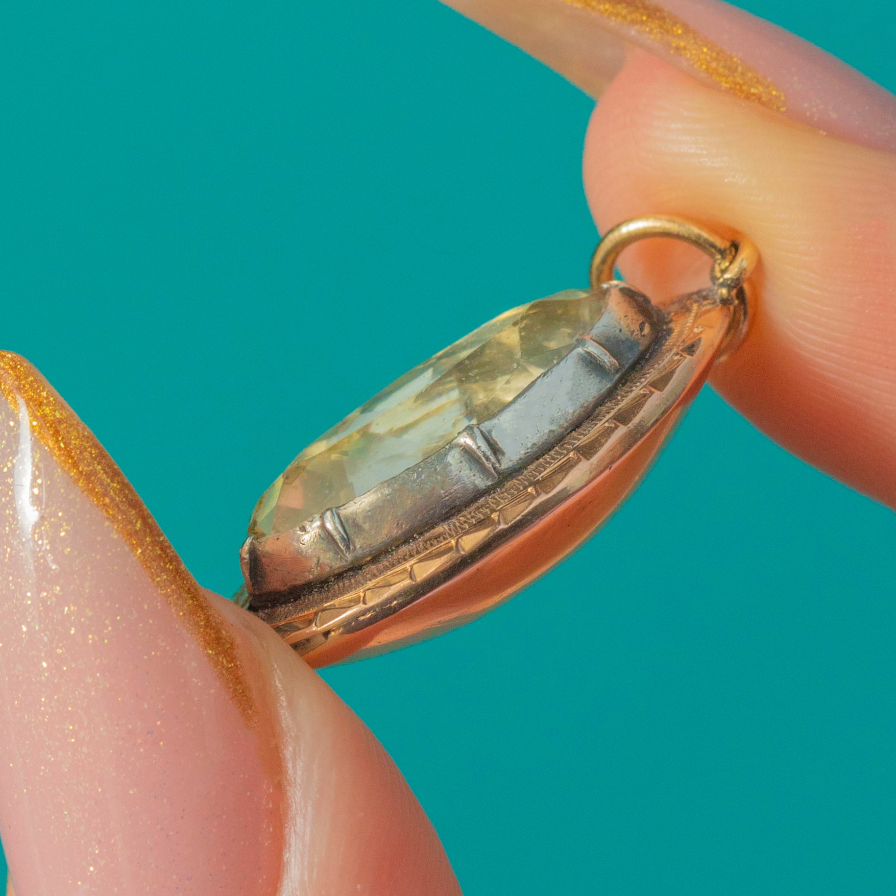 Framed by a finely worked 9ct Gold border and Silver collet, the closed-back setting gives the Paste a soft, glowing look typical of Georgian jewellery. Worn on your favourite antique chain or ribbon, it’s a wonderfully characterful piece of early jewellery with all the charm and drama of the period.