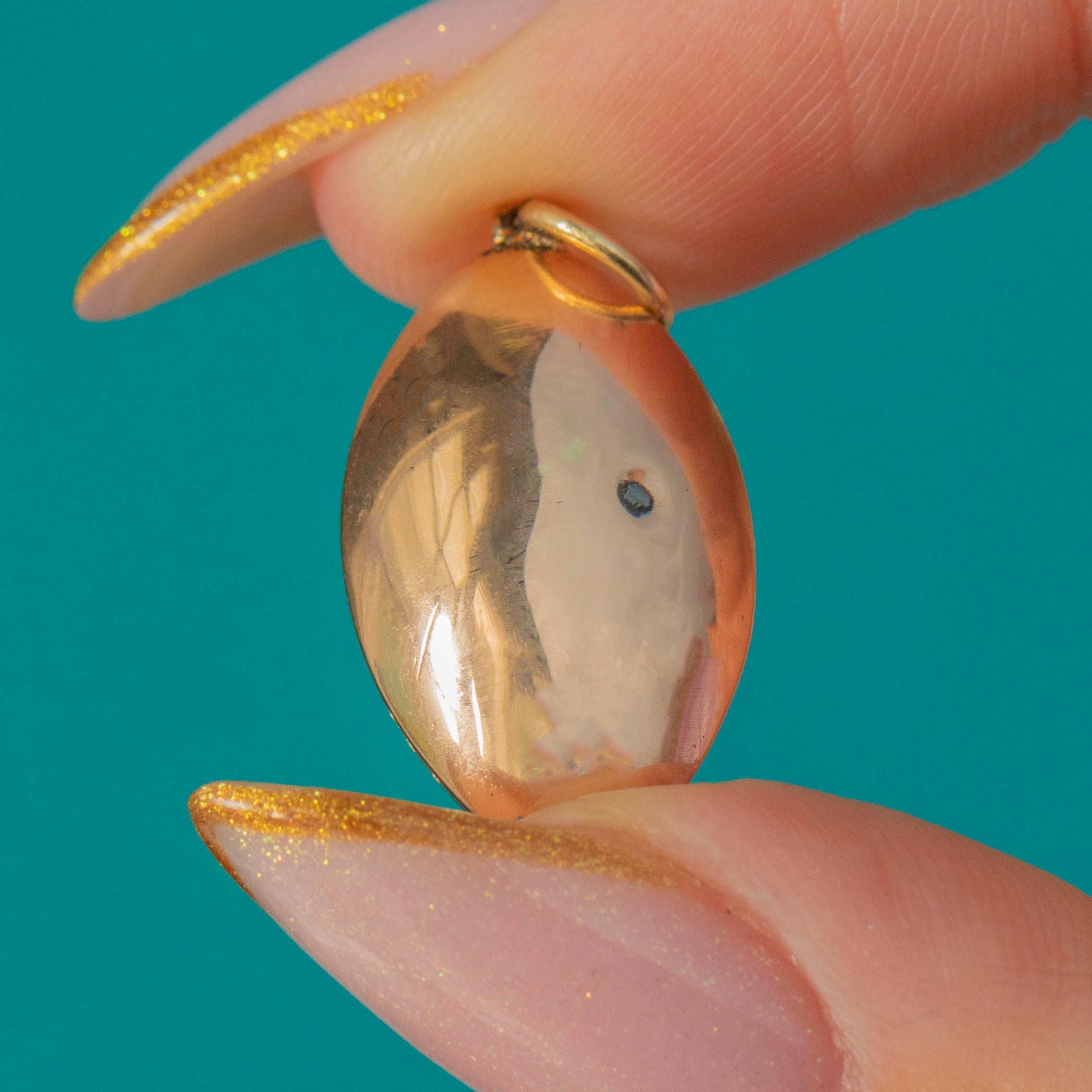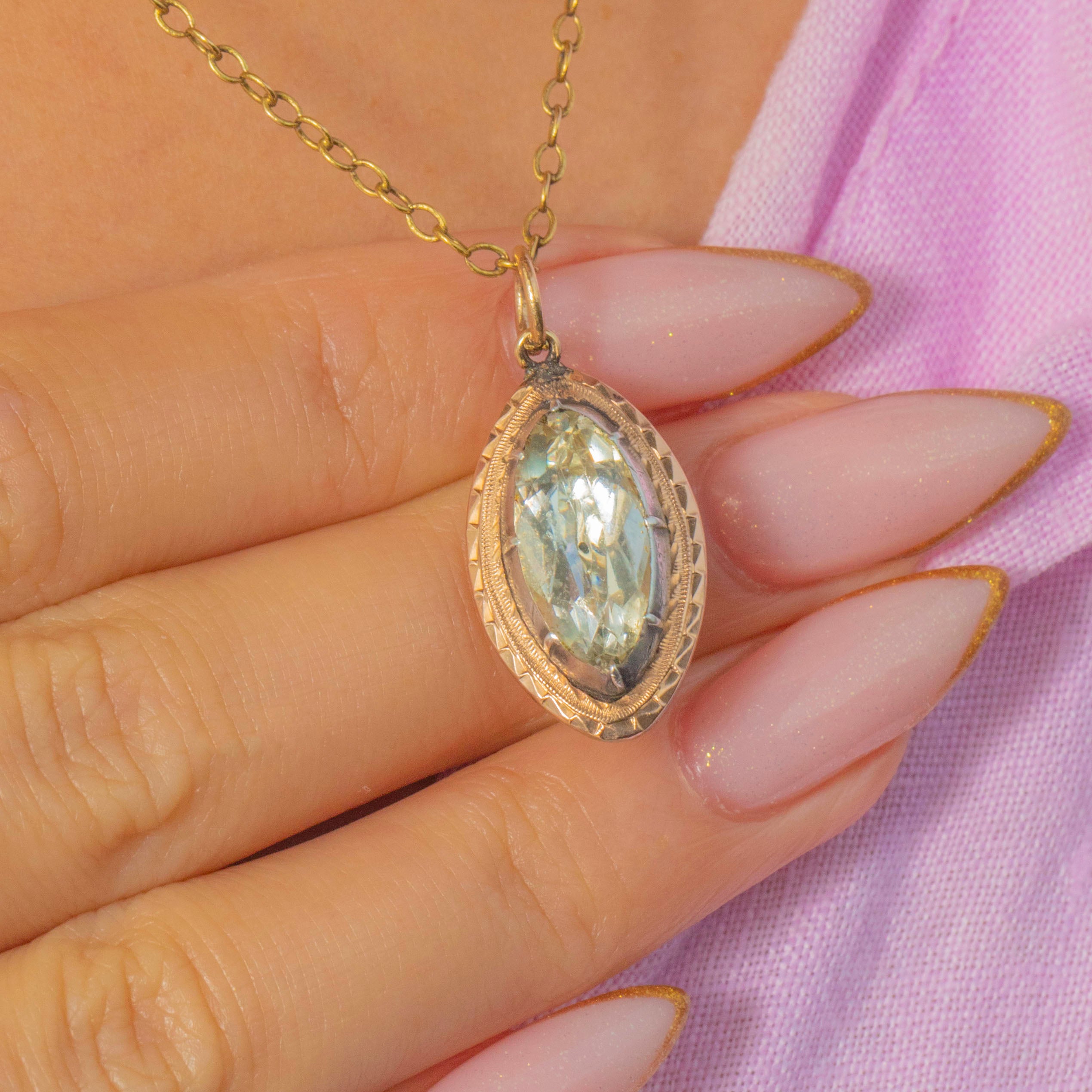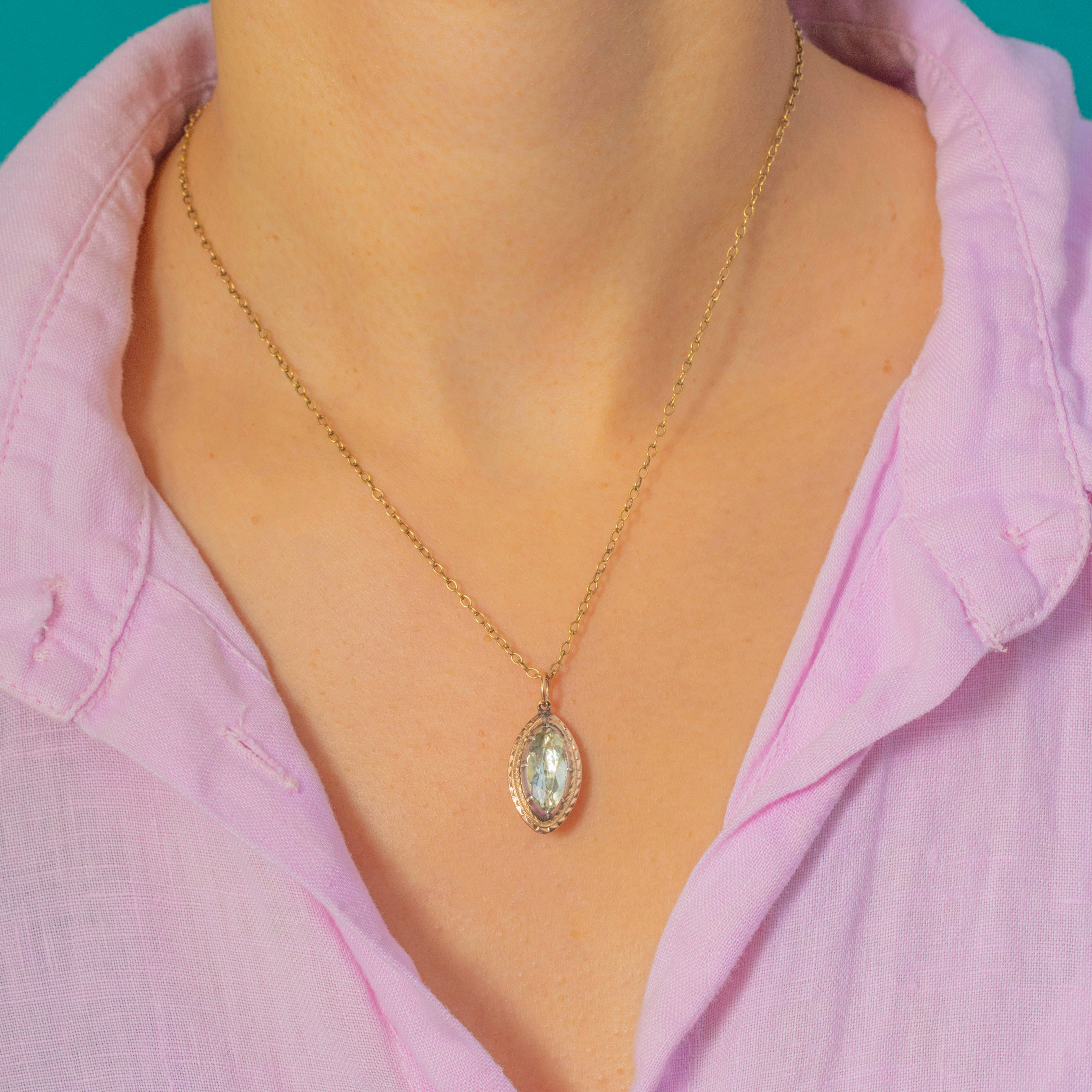 This striking Georgian navette pendant showcases a large Black Dot Paste in a beautifully detailed Gold and Silver setting. The elongated navette stone is hand-cut and lively, catching the light with every movement, with the dark “black dot” at the centre imitating the culet of an old Diamond.