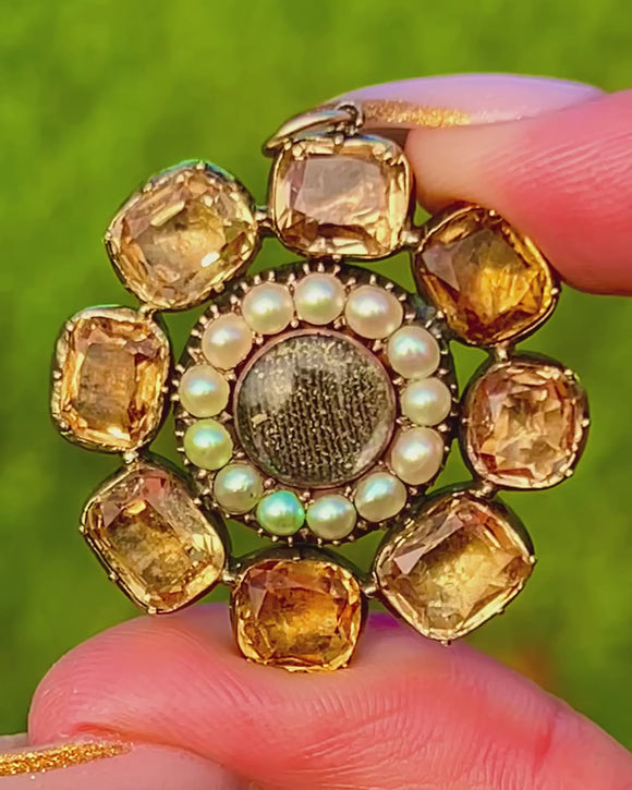 A magnificent late Georgian cluster pendant set with richly coloured foiled Imperial Topaz and luminous Natural Pearls. The honeyed glow of the foiled Topaz paired with the soft lustre of the Pearls creates that quintessential early 19th-century romance, opulent, feminine, and utterly breathtaking on the neckline.