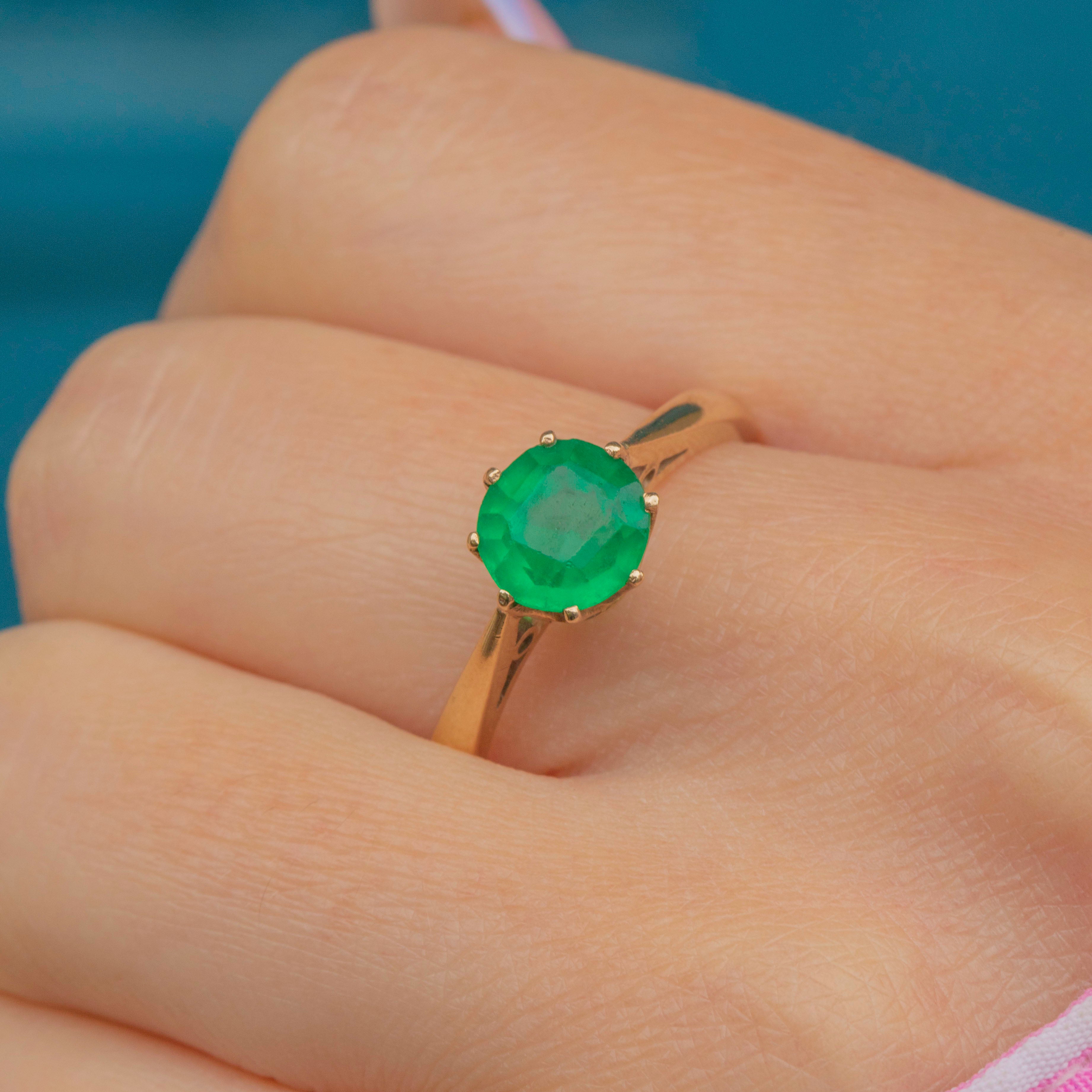 Crafted from buttery 9ct Gold, this vintage solitaire ring features a radiant round verdant green Paste stone in her centre, which is sure to catch your eye. She is hugged by 9ct Gold claws, with the warmth of the Gold effortlessly complementing the vibrancy of the Paste.