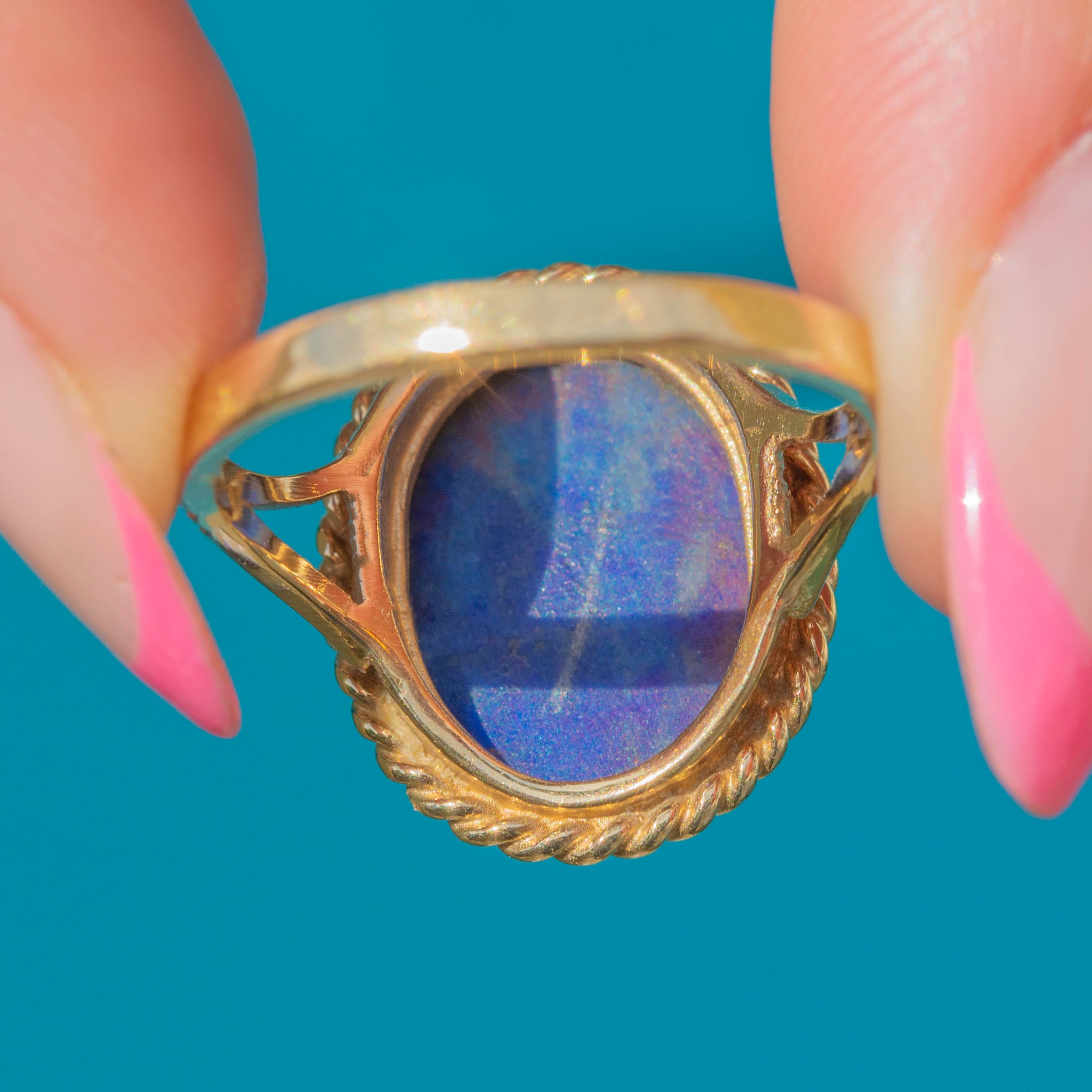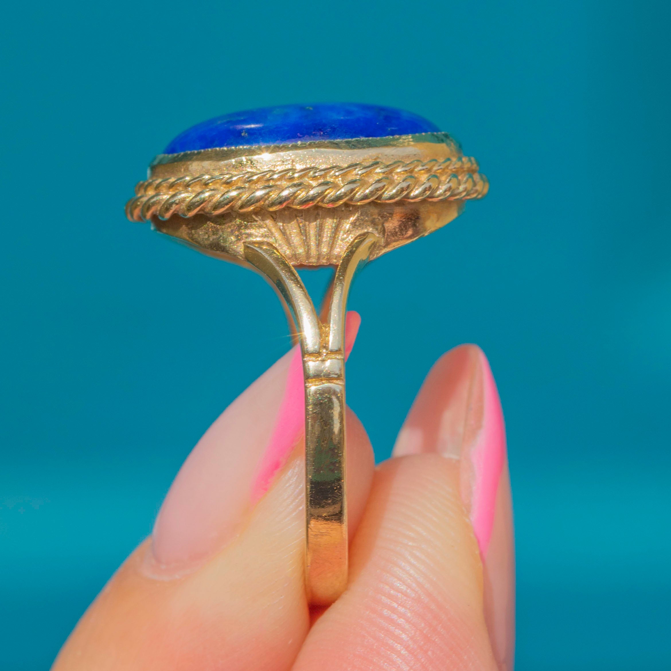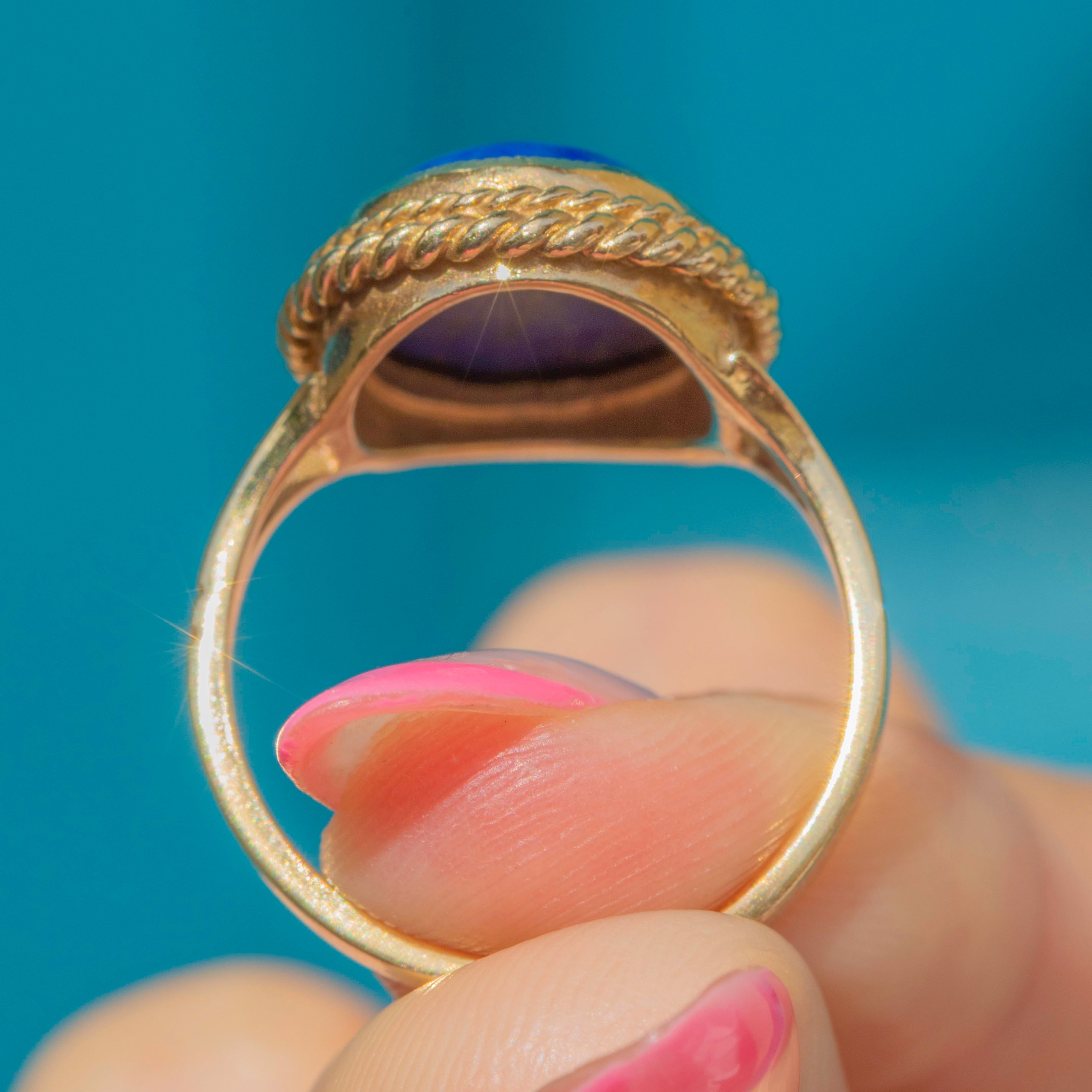 VERY GOOD: This 9ct Gold Lapis Lazuli dress ring is in very good condition. Her stone is smooth and well preserved, and while the stone has slight movement in its setting, it remains secure. Her 9ct Gold has maintained its high shine polish and feels robust, allowing you to wear this vintage treasure with confidence!