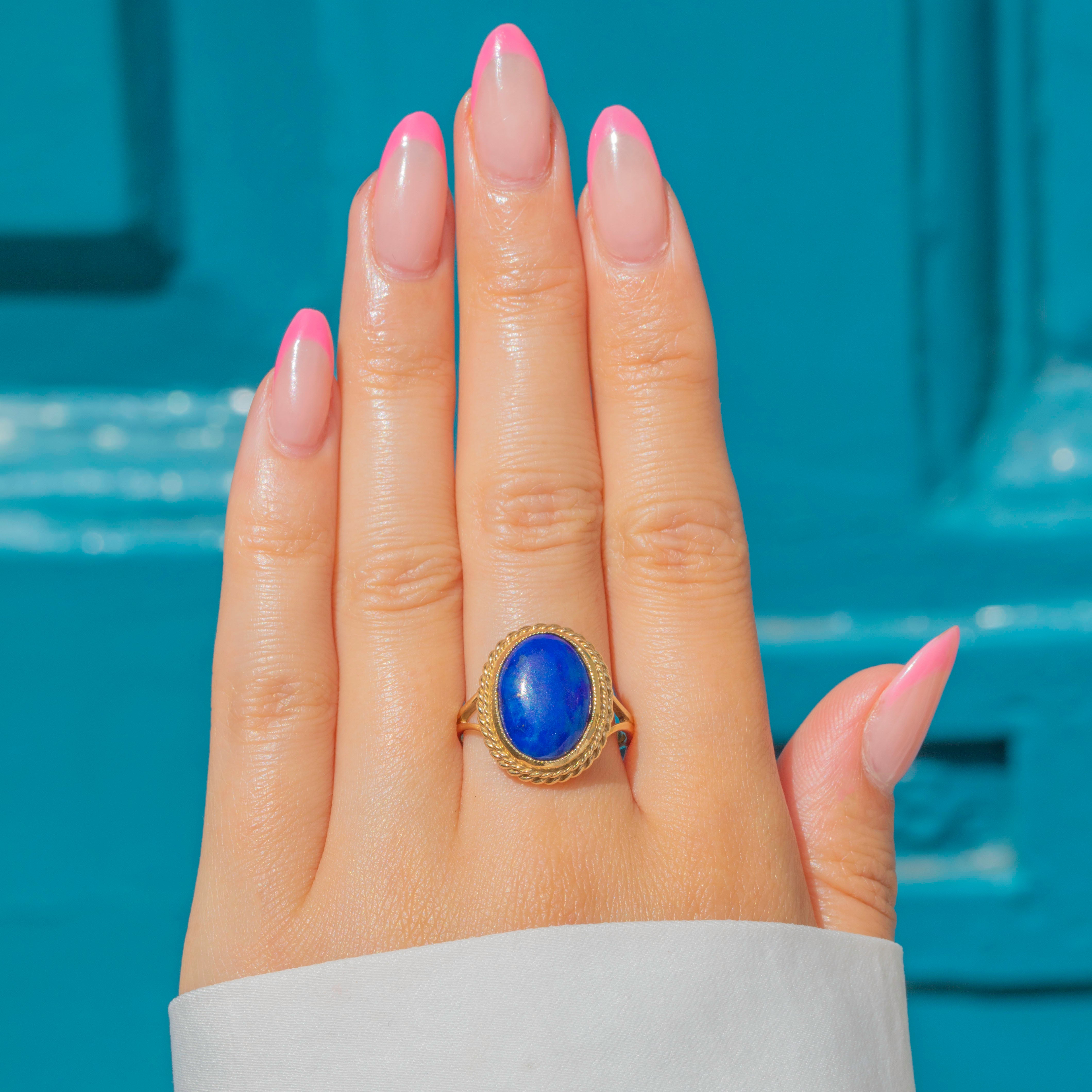 With a satisfyingly smooth surface, you can see the winding lines of her natural matrix, a reminder of the beauty of the Earth's wonders. The Lapis is set within a bed of luxurious 9ct Gold, the rich bezel decorated with a rope border for a striking finish.
