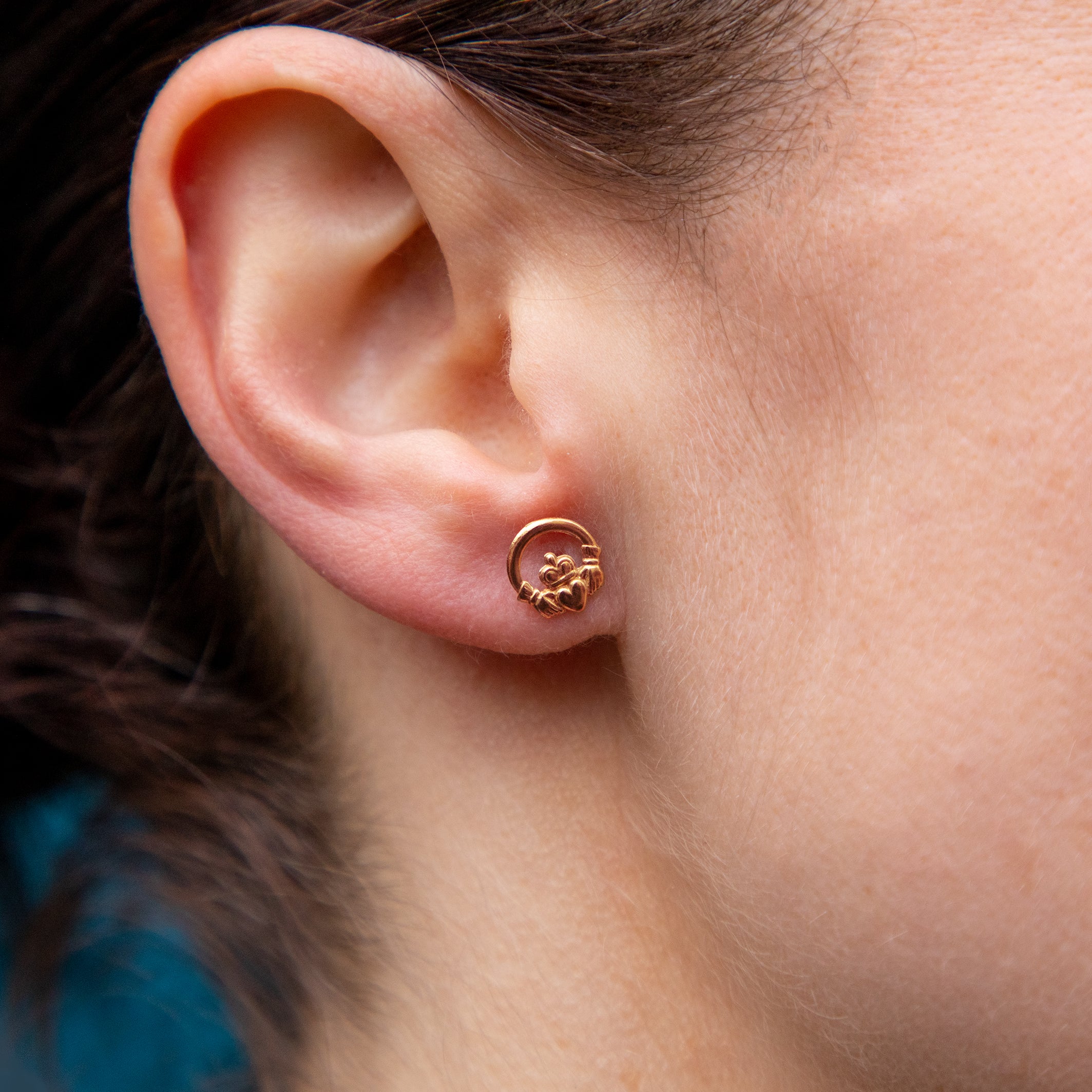 EXCELLENT. With nothing to report, these 9ct Gold mini Claddagh stud earrings are in excellent condition! Born to be a go-to pick pair, their light and decorative design sits comfortably in the ear, secured by tight-fitting butterfly backs.